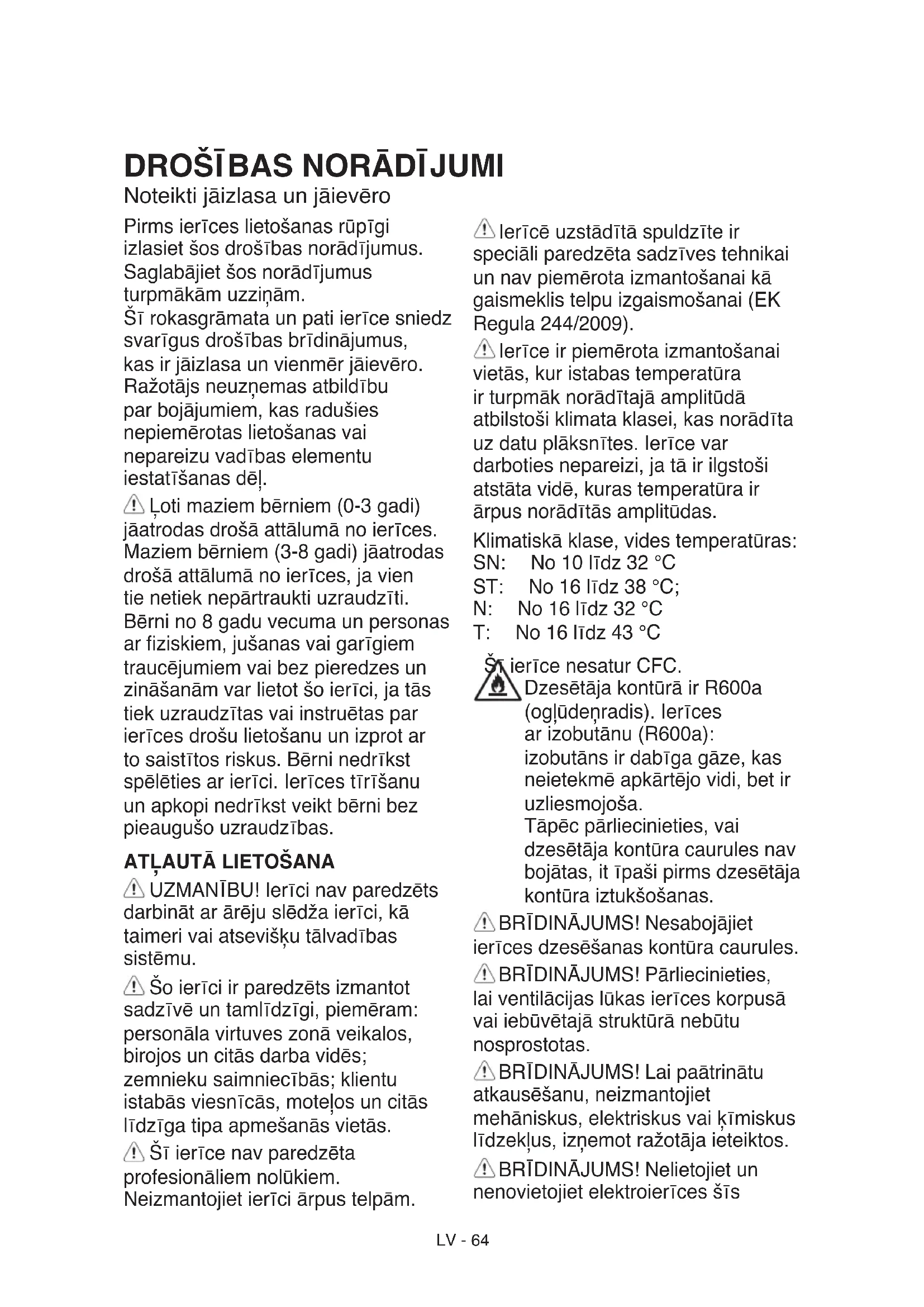 UZMANĪBU!Ierīcinavparedzēts darbinātarārējuslēdžaierīci,kā taimerivaiatsevišķutālvadības sistēmu. Šoierīciirparedzētsizmantot sadzīvēuntamlīdzīgi,piemēram: personālavirtuveszonāveikalos, birojosuncitāsdarbavidēs; zemniekusaimniecībās;klientu istabāsviesnīcās,moteļosuncitās līdzīgatipaapmešanāsvietās. Šīierīcenavparedzēta profesionāliemnolūkiem. Neizmantojietierīciārpustelpām. Ierīcēuzstādītāspuldzīteir speciāliparedzētasadzīvestehnikai unnavpiemērotaizmantošanaikā gaismeklistelpuizgaismošanai(EK Regula244/2009). Ierīceirpiemērotaizmantošanai vietās,kuristabastemperatūra irturpmāknorādītajāamplitūdā atbilstošiklimataklasei,kasnorādīta uzdatuplāksnītes.Ierīcevar darbotiesnepareizi,jatāirilgstoši atstātavidē,kurastemperatūrair ārpusnorādītāsamplitūdas. Klimatiskāklase,videstemperatūras: SN: No10līdz32°C ST: No16līdz38°C; N: No16līdz32°C T: No16līdz43°C ŠīierīcenesaturCFC. DzesētājakontūrāirR600a (ogļūdeņradis).Ierīces arizobutānu(R600a): izobutānsirdabīgagāze,kas neietekmēapkārtējovidi,betir uzliesmojoša. Tāpēcpārliecinieties,vai dzesētājakontūracaurulesnav bojātas,itīpašipirmsdzesētāja kontūraiztukšošanas. BRĪDINĀJUMS!Nesabojājiet ierīcesdzesēšanaskontūracaurules. BRĪDINĀJUMS!Pārliecinieties, laiventilācijaslūkasierīceskorpusā vaiiebūvētajāstruktūrānebūtu nosprostotas. BRĪDINĀJUMS!Laipaātrinātu atkausēšanu,neizmantojiet mehāniskus,elektriskusvaiķīmiskus līdzekļus,izņemotražotājaieteiktos. BRĪDINĀJUMS!Nelietojietun nenovietojietelektroierīcesšīsLV-65 ierīcesnodalījumos,jatāsnavtieši atļāvisražotājs. BRĪDINĀJUMS!Ledusgatavotāji un/vaiūdensdozatori,kasnavtieši savienotiarūdensapgādi,irjāuzpilda tikaiardzeramoūdeni. Neuzglabājietierīcēsprāgstošas vielas,piemēram,aerosola baloniņus,unnenovietojietbenzīnu vaicitusuzliesmojošusmateriālus tuvutai. Nenorijietleduspakusaturu(nav toksisks;dažosmodeļos).Neēdiet leduskubiņusvaileduuzkociņiem tūlītpēcizņemšanasnosaldētavas, jotādējādivargūtapsaldējumus. Izstrādājumos,kurosirparedzēts izmantotgaisaltru,kaspieejams ventilatorapārsegaiekšpusē,ltram vienmērjāatrodasvietā,kaddarbojas ledusskapis. Saldētavasnodalījumāneglabājiet stiklakonteinerusaršķidrumiem,jo tievarsaplīst. Nenosprostojietventilatoru(ja iekļauts)arpārtikasprecēm. Pēcpārtikasnovietošanas pārbaudiet,vainodalījumu,itīpaši saldētavas,durtiņasaizveraspareizi. Bojātsgrozspēciespējasdrīzāk jānomaina. Ledusskapjanodalījumu izmantojiettikaisvaigaspārtikas uzglabāšanai,betsaldētavas nodalījumu—tikaisaldētas pārtikasuzglabāšanai,svaigas pārtikassaldēšanaiunleduskubiņu gatavošanai. Izvairietiesnoneiesaiņotas pārtikasuzglabāšanastiešāsaskarē arledusskapjavaisaldētavas iekšējāmvirsmām. Ierīcēmvarbūtspeciālienodalījumi (svaigoproduktunodalījums,nulles grādukārba...). Javienkonkrētāizstrādājumabukletā navnorādītscitādi,tosvarizņemt, saglabājotlīdzvērtīgusniegumu. C-pentānuizmantokāpūšanas vieluizolācijasputās,untāir uzliesmojošagāze. MONTĀŽA Ierīcespārvietošanaun uzstādīšanajāveicvismazdiviem cilvēkiem-pastāvsavainojumurisks. Izmantojietaizsargcimdusvisos izsaiņošanasunuzstādīšanas darbos-pastāvriskssagriezties. Uzstādīšanu,tostarpūdens pievadapieslēgšanu(jatādsir),kā arīelektriskosavienojumuizveidiun remontudrīkstveikttikaikvalicēts tehniķis. Nelabojietunnemainietierīces detaļas,javientasnavtieši norādītslietotājarokasgrāmatā. Neļaujietbērniembūttuvumā ierīcesmontāžasvietā.Pēcierīces izsaiņošanaspārliecinieties,vai pārvadāšanaslaikātānavbojāta. Problēmugadījumāsazinietiesar izplatītājuvaituvākopēcpārdošanas apkopesdienestu.Pēcierīces montāžasnovietojietiepakojuma materiālus(plastmasasunpolistirola daļasu.c.)bērniemnepieejamā vietā-pastāvnosmakšanasrisks. Pirmsierīcesuzstādīšanastai jābūtatvienotainoelektrotīkla- pastāvelektriskātriecienarisks. Uzstādīšanaslaikāsekojiet,laiierīce nesabojātubarošanaskabeli-pastāv aizdegšanāsunstrāvastrieciena risks.Ieslēdzietierīcitikaitad,kad montāžairpabeigta. Uzmanieties,laiierīces pārvietošanaslaikānesabojātugrīdu (piemēram,parketu).UzstādietunLV-66 nolīmeņojietierīciuzgrīdas,kas spējizturētierīcessvaru,vietā,kas irpiemērotaiekārtasizmēramun lietošanasveidam.Pārliecinieties, vaitāneatrodastuvumāsiltuma avotamunvaivisasčetraskājiņas irstabilasunsaskarasargrīdu, nepieciešamībasgadījumā pieregulējiettāsunarlīmeņrādi pārbaudietierīceslīmeņojumu.Pirms ierīcesieslēgšanaspagaidietvismaz divasstundas,laipārliecinātos, vaidzesēšanaskontūrsdarbojas efektīvi. Ierīcesizmēriunuzstādīšanai nepieciešamaisvietasdaudzums norādītsMontāžasinstrukcijā. BRĪDINĀJUMS!Novietojot ledusskapi,sekojiet,lainetiktu saspiestsvaibojātstābarošanas kabelis. BRĪDINĀJUMS!Laiizvairītos nonestabilitātesriska,ierīces novietošanavainostiprināšana irjāveicsaskaņāarražotāja norādījumiem. Irizliegtsnovietotledusskapitā, kagāzesplītsmetālašļūtene, metālagāzesvaiūdenscaurules vaiarīelektrībaskabeļisaskaras arledusskapjaaizmugurējosienu (kondensatoraspoli).