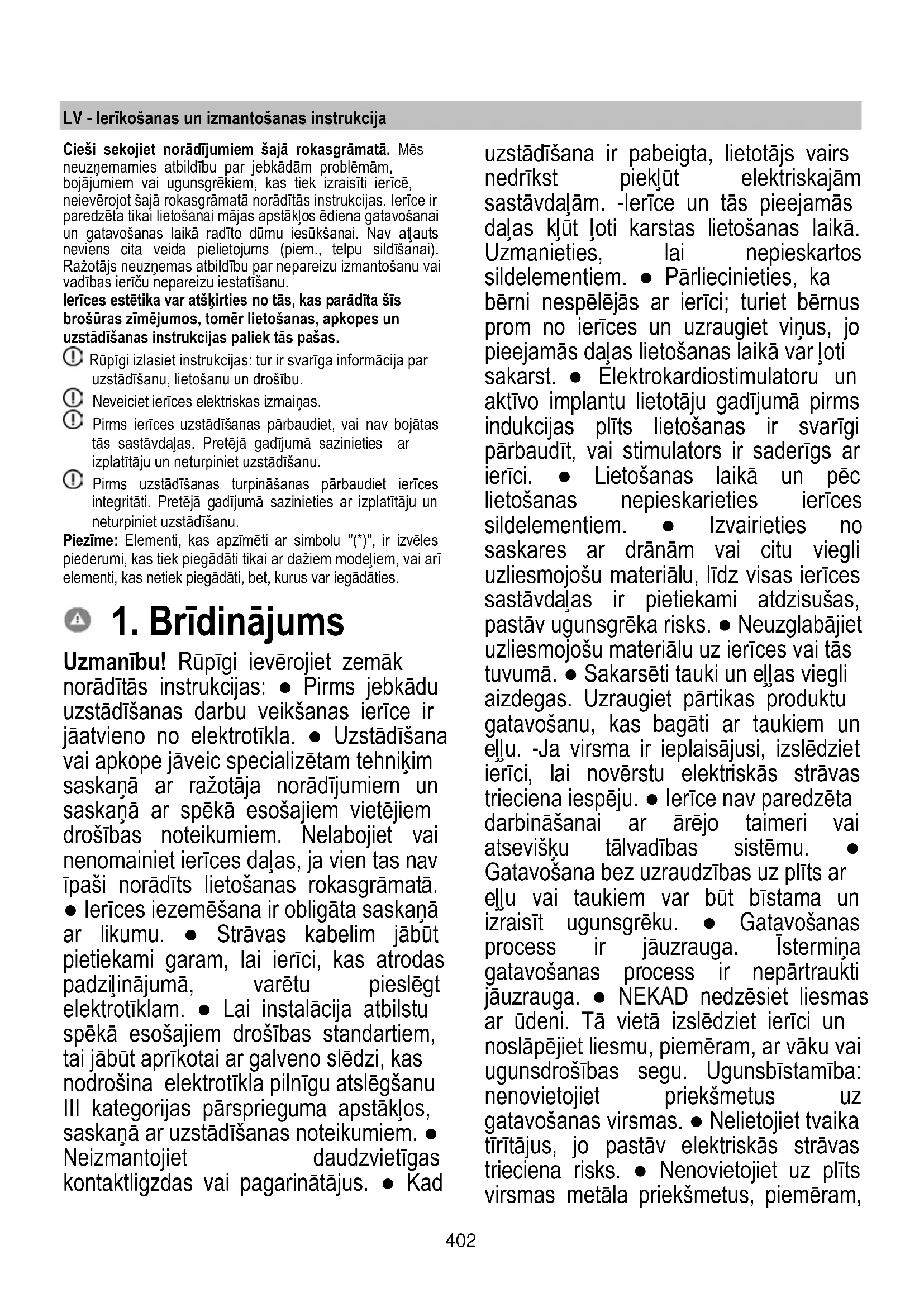 Uzmanību! Rūpīgi ievērojiet zemāk norādītās instrukcijas: ● Pirms jebkādu uzstādīšanas darbu veikšanas ierīce ir jāatvieno no elektrotīkla. ● Uzstādīšana vai apkope jāveic specializētam tehniķim saskaņā ar ražotāja norādījumiem un saskaņā ar spēkā esošajiem vietējiem drošības noteikumiem. Nelabojiet vai nenomainiet ierīces daļas, ja vien tas nav īpaši norādīts lietošanas rokasgrāmatā. ● Ierīces iezemēšana ir obligāta saskaņā ar likumu. ● Strāvas kabelim jābūt pietiekami garam, lai ierīci, kas atrodas padziļinājumā, varētu pieslēgt elektrotīklam. ● Lai instalācija atbilstu spēkā esošajiem drošības standartiem, tai jābūt aprīkotai ar galveno slēdzi, kas nodrošina elektrotīkla pilnīgu atslēgšanu III kategorijas pārsprieguma apstākļos, saskaņā ar uzstādīšanas noteikumiem. ● Neizmantojiet daudzvietīgas kontaktligzdas vai pagarinātājus. ● Kad uzstādīšana ir pabeigta, lietotājs vairs nedrīkst piekļūt elektriskajām sastāvdaļām. -Ierīce un tās pieejamās daļas kļūt ļoti karstas lietošanas laikā. Uzmanieties, lai nepieskartos sildelementiem. ● Pārliecinieties, ka bērni nespēlējās ar ierīci; turiet bērnus prom no ierīces un uzraugiet viņus, jo pieejamās daļas lietošanas laikā var ļoti sakarst. ● Elektrokardiostimulatoru un aktīvo implantu lietotāju gadījumā pirms indukcijas plīts lietošanas ir svarīgi pārbaudīt, vai stimulators ir saderīgs ar ierīci. ● Lietošanas laikā un pēc lietošanas nepieskarieties ierīces sildelementiem. ● Izvairieties no saskares ar drānām vai citu viegli uzliesmojošu materiālu, līdz visas ierīces sastāvdaļas ir pietiekami atdzisušas, pastāv ugunsgrēka risks. ● Neuzglabājiet uzliesmojošu materiālu uz ierīces vai tās tuvumā. ● Sakarsēti tauki un eļļas viegli aizdegas. Uzraugiet pārtikas produktu gatavošanu, kas bagāti ar taukiem un eļļu. -Ja virsma ir ieplaisājusi, izslēdziet ierīci, lai novērstu elektriskās strāvas trieciena iespēju. ● Ierīce nav paredzēta darbināšanai ar ārējo taimeri vai atsevišķu tālvadības sistēmu. ● Gatavošana bez uzraudzības uz plīts ar eļļu vai taukiem var būt bīstama un izraisīt ugunsgrēku. ● Gatavošanas process ir jāuzrauga. Īstermiņa gatavošanas process ir nepārtraukti jāuzrauga. ● NEKAD nedzēsiet liesmas ar ūdeni. Tā vietā izslēdziet ierīci un noslāpējiet liesmu, piemēram, ar vāku vai ugunsdrošības segu. Ugunsbīstamība: nenovietojiet priekšmetus uz gatavošanas virsmas. ● Nelietojiet tvaika tīrītājus, jo pastāv elektriskās strāvas trieciena risks. ● Nenovietojiet uz plīts virsmas metāla priekšmetus, piemēram,403 nažus, dakšiņas, karotes un vākus, jo tie var pārkarst. ● Pirms ierīces pievienošanas elektrotīklam: pārbaudiet datu plāksnīti (atrodas ierīces apakšā), lai pārliecinātos, ka spriegums un jauda atbilst elektrotīkla spriegumam un savienojuma kontaktligzdai. Ja rodas šaubas, sazinieties ar kvalificētu elektriķi. Svarīgi: ● Pēc lietošanas izslēdziet plīti, izmantojot tās vadības ierīci, un nepaļaujieties uz katla detektoru. ● Izvairieties no šķidruma izlīšanas; tāpēc, vārot vai sildot šķidrumu, samaziniet siltuma padevi. ● Neatstājiet sildelementus ieslēgtus ar tukšiem katliem un pannām vai bez katliem. ● Kad gatavošana ir pabeigta, izslēdziet attiecīgo gatavošanas zonu. ● Nekādā gadījumā nelietojiet alumīnija foliju ēdiena gatavošanai un nekad negatavojiet produktus, kas iesaiņoti alumīnija folijā. Alumīnijs var izkust un neatgriezeniski sabojāt ierīci. ● Nekad nekarsējiet skārda bundžu vai burku, kas satur pārtikas produktus, iepriekš to neatverot: tā var uzsprāgt! Šis brīdinājums attiecas uz visu citu veidu plīts virsmām. ● Lielas jaudas izmantošana, piemēram, Booster (palielināšana) funkcija, nav piemērota dažu šķidrumu, piemēram, cepšanas eļļas sildīšanai. Pārmērīgs karstums var būt bīstams. Šādos gadījumos mēs iesakām izmantot zemāku jaudu. ● Katli jānovieto tieši uz plīts virsmas un tiem jābūt centrētiem. Starp katlu un plīti nekādā gadījumā neievietojiet citus priekšmetus. ● Situācijā ar augstu temperatūru ierīce automātiski samazina gatavošanas zonu jaudas līmeni. ● Pirms tīrīšanas vai apkopes darbībām atvienojiet ierīci no strāvas avota, izņemot kontaktdakšu vai izslēdzot galveno slēdzi telpā. ● Visām uzstādīšanas un apkopes darbībām izmantojiet darba cimdus. ● Ierīci var lietot bērni, kas ir vecāki par 8 gadiem, un cilvēki ar samazinātām fiziskām, maņu vai garīgām spējām, vai bez pieredzes un nepieciešamajām zināšanām, ja vien tas tiek darīts citu uzraudzībā vai pēc tam, kad tie ir saņēmuši norādījumus par drošu ierīces lietošanu un sapratuši ar ierīci saistītos riskus. ● Bērni ir jāuzrauga, lai viņi nespēlētos ar ierīci. ● Tīrīšanu un apkopi bērni nedrīkst veikt bez uzraudzības. ● Telpā jābūt pietiekamai ventilācijai, ja ierīci lieto vienlaikus ar citām gāzes vai citām degšanas ierīcēm. ● Ierīce ir bieži jātīra gan no iekšpuses, gan no ārpuses (VISMAZ VIENU REIZI MĒNESĪ), katrā ziņā ievērojot apkopes instrukcijās skaidri norādīto. ● Ierīces tīrīšanas, filtru nomaiņas un filtru tīrīšanas noteikumu neievērošana rada ugunsbīstamību. ● Flambēšanas gatavošana ir stingri aizliegta. ● Atklātas liesmas izmantošana filtriem ir kaitīga un var izraisīt ugunsgrēku, tāpēc no tā jebkurā gadījumā ir jāizvairās. ● Cepšana jāveic kontrolētā veidā, lai nepieļautu pārkarsētas eļļas aizdegšanos. ● UZMANĪBU: kad plīts darbojas, ierīces pieejamās daļas var sakarst. ● Uzmanību! Nepievienojiet ierīci elektrotīklam, līdz uzstādīšana nav pabeigta. ● Attiecībā uz tehniskajiem un drošības pasākumiem, kas 