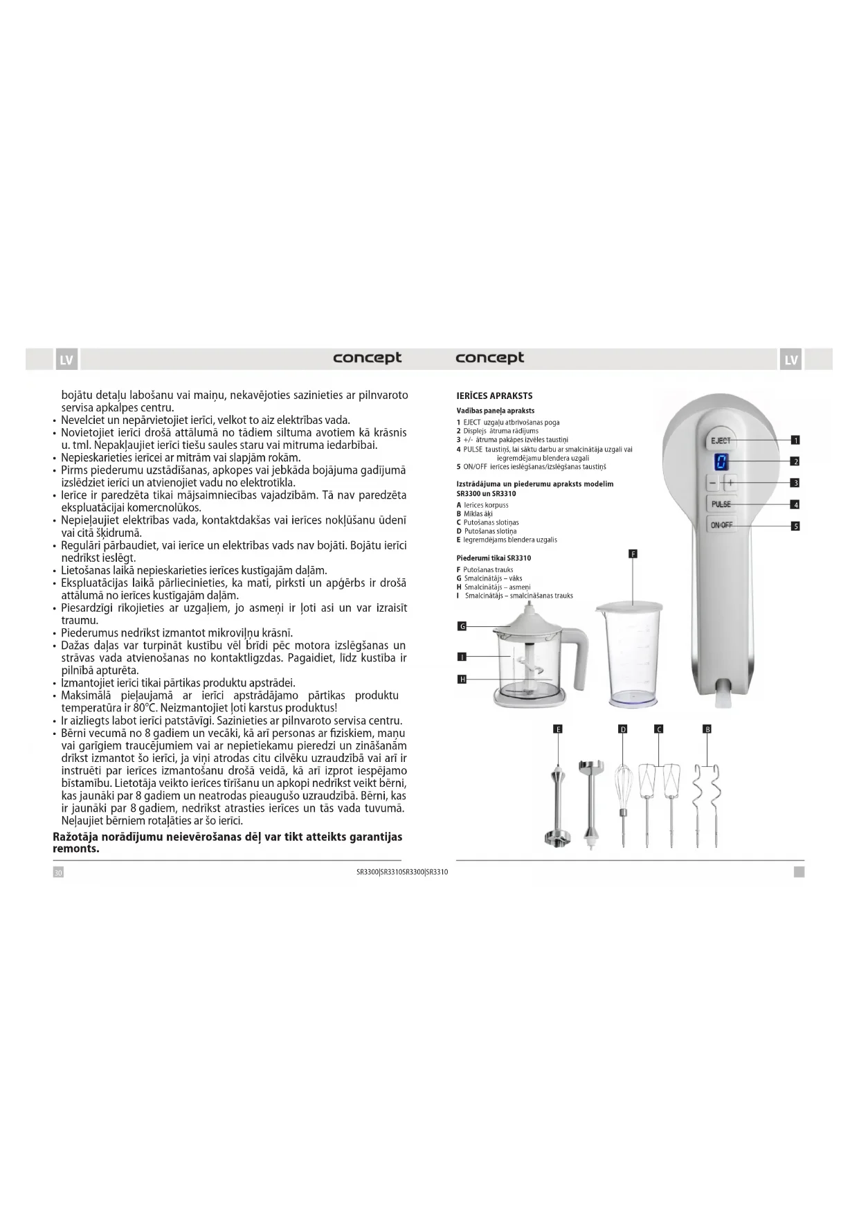 - Polietilēna (PE) maisiņus nododiet otrreizējai pārstrādei paredzēto materiālu savākšanas punktā. Ierīces otrreizējā pārstrāde tās kalpošanas laika beigās Šī ierīce ir marķēta saskaņā ar Eiropas Parlamenta un Padomes Direktīvu 2012/19/ES par elektrisko un elektronisko iekārtu atkritumiem (EEIA). Simbols uz izstrādājuma vai tā iepakojuma norāda, ka šis izstrādājums nepieder sadzīves atkritumiem. Tas jānogādā elektrisko un elektronisko iekārtu otrreizējās pārstrādes savākšanas punktā. Nodrošinot šā izstrādājuma pareizu iznīcināšanu, tiks novērsta nelabvēlīga ietekme uz vidi un cilvēku veselību, ko var izraisīt nepareiza ierīces iznīcināšana. Iznīcināšana jāveic saskaņā ar noteikumiem par atkritumu apstrādi. Lai iegūtu papildu informāciju par šīs ierīces otrreizēju pārstrādi, lūdzu, sazinieties ar vietējās pašvaldības sadzīves atkritumu iznīcināšanas dienestu vai veikalu, kurā iegādājāties izstrādājumu. Šis izstrādājums atbilst visām piemērojamo ES direktīvu pamatprasībām. Izmaiņas tekstā, konstrukcijā un tehniskajās specifikācijās var tikt veiktas bez iepriekšēja brīdinājuma, un mēs paturam tiesības veikt šīs izmaiņas. ACKNOWLEDGEMENTS Thank you for purchasing a Concept product. We wish you much joy with your new appliance every day you use it. Please read the instruction manual carefully before initial use. To refer to this manual any time you need to, we recommend you to keep it in a safe place. And please pass it to any future owner of the appliance. Technical specifications Voltage 220–240 V ~ 50/60 Hz Input 500 W Sound performance level 85 dB (A) Continuous operating time (KB) Whipping/kneading (speed 1–5) – max. 4 min 30 s