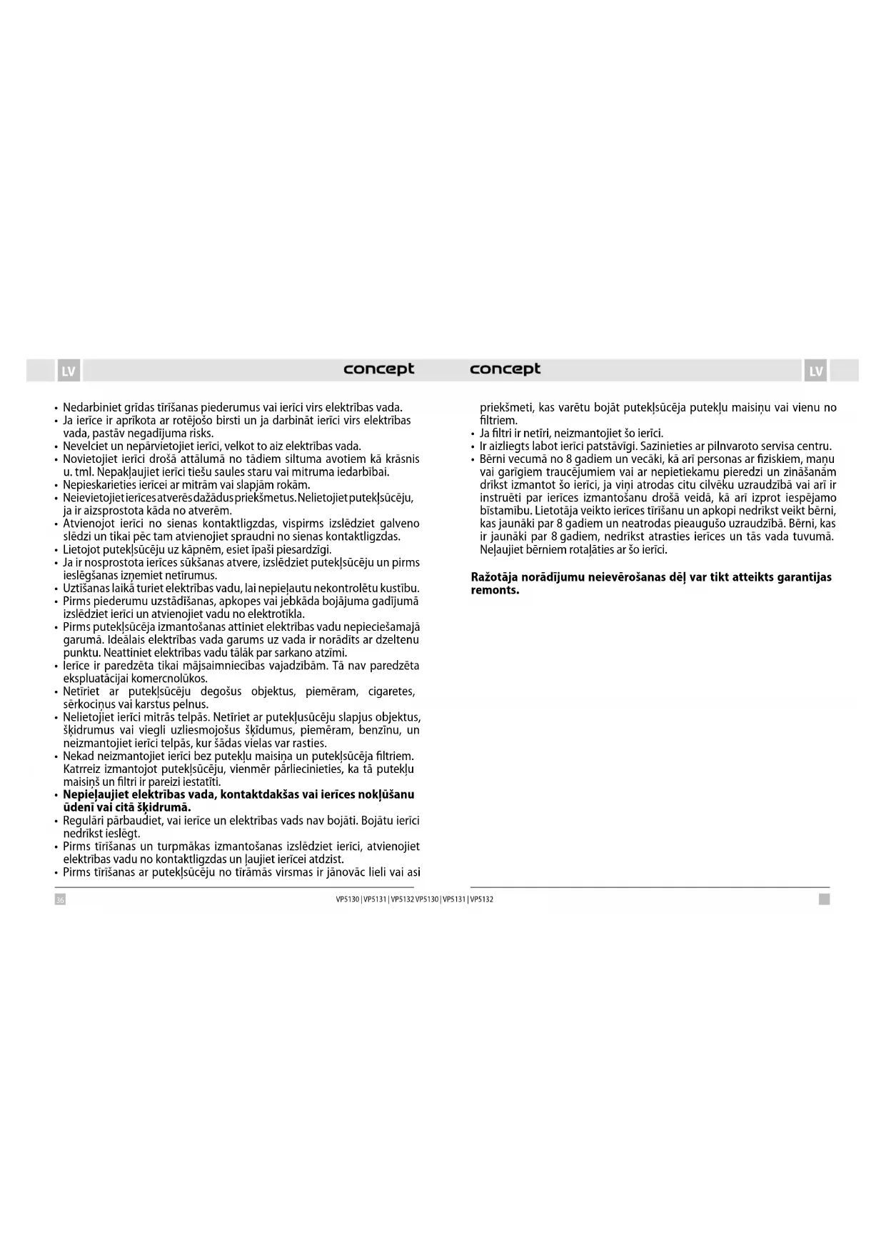 - Bērni vecumā no 8gadiem un vecāki, kā arī personas ar fiziskiem, maņu vai garīgiem traucējumiem vai ar nepietiekamu pieredzi un zināšanām drīkst izmantot šo ierīci, ja viņi atrodas citu cilvēku uzraudzībā vai arī ir instruēti par ierīces izmantošanu drošā veidā, kā arī izprot iespējamo bīstamību. Lietotāja veikto ierīces tīrīšanu un apkopi nedrīkst veikt bērni, kas jaunāki par 8gadiem un neatrodas pieaugušo uzraudzībā. Bērni, kas ir jaunāki par 8gadiem, nedrīkst atrasties ierīces un tās vada tuvumā. Neļaujiet bērniem rotaļāties ar šo ierīci. Ražotāja norādījumu neievērošanas dēļ var tikt atteikts garantijas remonts.38 39 LVLV VP5130 | VP5131 | VP5132 VP5130 | VP5131 | VP5132