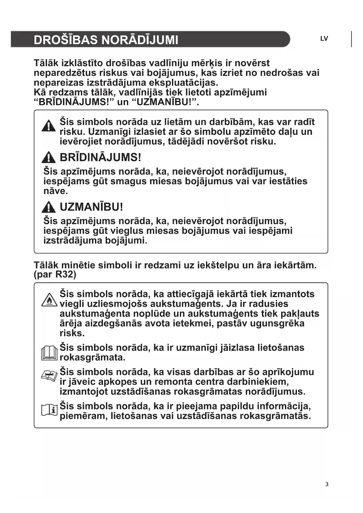 Tālāk izklāstīto drošības vadlīniju mērķis ir novērst neparedzētus riskus vai bojājumus, kas izriet no nedrošas vai nepareizas izstrādājuma ekspluatācijas. Kā redzams tālāk, vadlīnijās tiek lietoti apzīmējumi “BRĪDINĀJUMS!” un “UZMANĪBU!”. Šis simbols norāda uz lietām un darbībām, kas var radīt risku. Uzmanīgi izlasiet ar šo simbolu apzīmēto daļu un ievērojiet norādījumus, tādējādi novēršot risku. BRĪDINĀJUMS! Šis apzīmējums norāda, ka, neievērojot norādījumus, iespējams gūt smagus miesas bojājumus vai var iestāties nāve. UZMANĪBU! Šis apzīmējums norāda, ka, neievērojot norādījumus, iespējams gūt vieglus miesas bojājumus vai iespējami izstrādājuma bojājumi. Tālāk minētie simboli ir redzami uz iekštelpu un āra iekārtām. (par R32) Šis simbols norāda, ka attiecīgajā iekārtā tiek izmantots viegli uzliesmojošs aukstumaģents. Ja ir radusies aukstumaģenta noplūde un aukstumaģents tiek pakļauts ārēja aizdegšanās avota ietekmei, pastāv ugunsgrēka risks. Šis simbols norāda, ka ir uzmanīgi jāizlasa lietošanas rokasgrāmata. Šis simbols norāda, ka visas darbības ar šo aprīkojumu ir jāveic apkopes un remonta centra darbiniekiem, izmantojot uzstādīšanas rokasgrāmatas norādījumus. Šis simbols norāda, ka ir pieejama papildu informācija, piemēram, lietošanas vai uzstādīšanas rokasgrāmatās.4