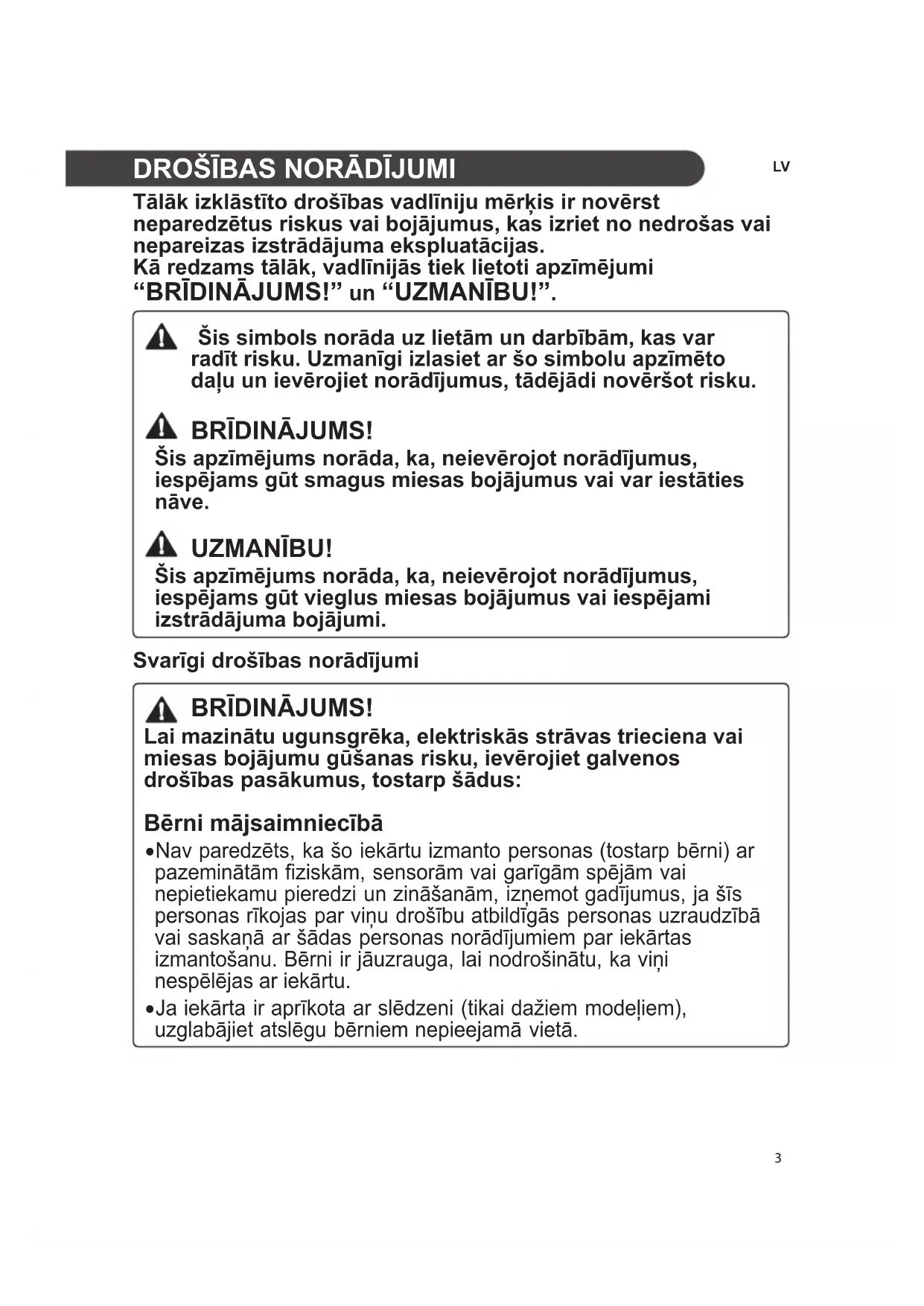 Tālāk izklāstīto drošības vadlīniju mērķis ir novērst neparedzētus riskus vai bojājumus, kas izriet no nedrošas vai nepareizas izstrādājuma ekspluatācijas. Kā redzams tālāk, vadlīnijās tiek lietoti apzīmējumi “BRĪDINĀJUMS!” un “UZMANĪBU!”. Svarīgi drošības norādījumi BRĪDINĀJUMS! Lai mazinātu ugunsgrēka, elektriskās strāvas trieciena vai miesas bojājumu gūšanas risku, ievērojiet galvenos drošības pasākumus, tostarp šādus: Bērni mājsaimniecībā