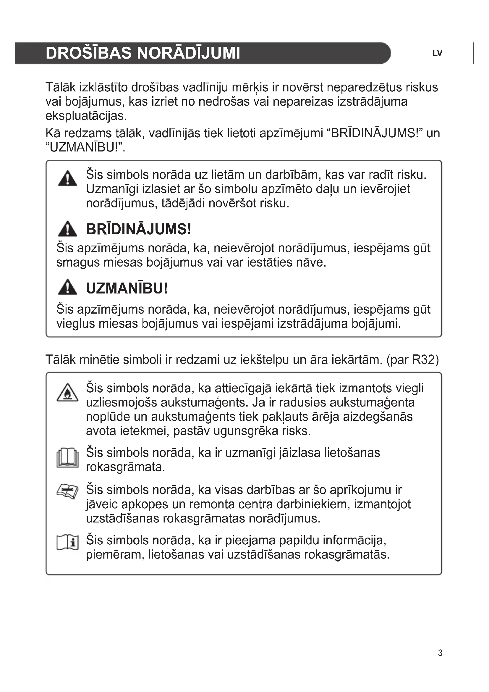 Tālāk izklāstīto drošības vadlīniju mērķis ir novērst neparedzētus riskus vai bojājumus, kas izriet no nedrošas vai nepareizas izstrādājuma ekspluatācijas. Kā redzams tālāk, vadlīnijās tiek lietoti apzīmējumi “BRĪDINĀJUMS!” un “UZMANĪBU!”. Šis simbols norāda uz lietām un darbībām, kas var radīt risku. Uzmanīgi izlasiet ar šo simbolu apzīmēto daļu un ievērojiet norādījumus, tādējādi novēršot risku. BRĪDINĀJUMS! Šis apzīmējums norāda, ka, neievērojot norādījumus, iespējams gūt smagus miesas bojājumus vai var iestāties nāve. UZMANĪBU! Šis apzīmējums norāda, ka, neievērojot norādījumus, iespējams gūt vieglus miesas bojājumus vai iespējami izstrādājuma bojājumi. Tālāk minētie simboli ir redzami uz iekštelpu un āra iekārtām. (par R32) Šis simbols norāda, ka attiecīgajā iekārtā tiek izmantots viegli uzliesmojošs aukstumaģents. Ja ir radusies aukstumaģenta noplūde un aukstumaģents tiek pakļauts ārēja aizdegšanās avota ietekmei, pastāv ugunsgrēka risks. Šis simbols norāda, ka ir uzmanīgi jāizlasa lietošanas rokasgrāmata. Šis simbols norāda, ka visas darbības ar šo aprīkojumu ir jāveic apkopes un remonta centra darbiniekiem, izmantojot uzstādīšanas rokasgrāmatas norādījumus. Šis simbols norāda, ka ir pieejama papildu informācija, piemēram, lietošanas vai uzstādīšanas rokasgrāmatās.4