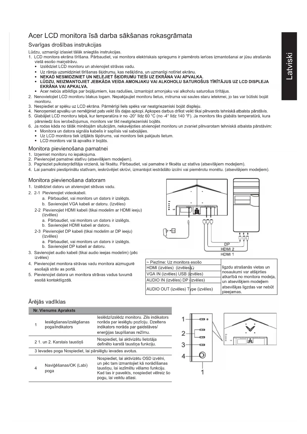 HDMI (tikai modeļiem ar HDMI ieeju) (izvēles) Skaļruņi 2 W x 2 (tikai modeļiem ar audio ieeju) (izvēles) Maksimālais ekrāna lielums Horizontāli: 527 mm Vertikāli: 296 mm Enerģijas avots IEVADE: 100-240 V~ 50/60 Hz Vides apsvērumi Darbības temperatūra: 0-40 °C Glabāšanas temperatūra: -20-60 °C Darbības mitrums: 20-80% Izmēri 540,3 × 412,1 × 221,3 mm (platums × augstums × dziļums) Svars (N. W.) 3,00 kg (neto) Mehānisma specikācijas Sasvēršana: -5°-+20° Pagriešana: Nav Augstuma regulēšana: Nav Sasvēršana: Nav Atvienojama pamatne: Ir Ārējās vadīklas Slēdži/pogas Ieslēgšanas poga 1.karstais taustiņš 2.karstais taustiņš Ievade Izvēlne/Naviģēšanas/OK Funkcijas Spilgtums Kontrasts Zils indikators Melnā uzlabošana ACM HDR Izcils asums Gamma Krāsu temperatūra Režīmi Krāstelpa Pelēktoņu režīms 6 asu nokrāsa 6 asu piesātinājums Skaļums Klusums Paātrinājums FreeSync Premium VRB Īpaši zems latentums Atsvaidziniet rādītāja numuru Mērķēšanas punkts Valoda Ekrāna izvēlnes taimauts Caurspīdīgums OSD bloķēšana Ievade Automātiskā avota noteikšana Platais režīms Karstā taustiņa uzdevums DDC/CI HDMI melnā līmenis Ātrā sākuma režīms Informācija Atiestatīt visus iestatījumus Specikācijas atšķiras atkarībā no modeļa un / vai modeļa. Acer produktu rokasgrāmatas un citus dokumentus skatiet ociālā Acer atbalsta vietnē.