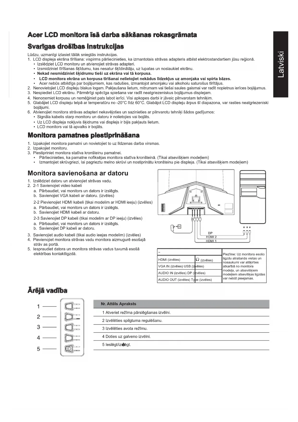 Piezīme: Uz monitora esošo ligzdu atrašanās vietas un nosaukumi var atšķirties atkarībā no monitora modeļa, un atsevišķiem modeļiem atsevišķas ligzdas var nebūt pieejamas. HDMI (izvēles) (izvēles) VGA IN (izvēles) USB (izvēles) AUDIO IN (izvēles) DP (izvēles) AUDIO OUT (izvēles) Type (izvēles) Ārējā vadība Nr. Attēls Apraksts 1 Atveriet režīma pārslēgšanas izvēlni. 2 Izvēlēties spilgtuma regulēšanu. 3 Izvēlēties avota režīmu. 4 Doties uz galveno izvēlni. 5 Ieslēgt/izslēgt.Latviski Regulatīvi un drošības paziņojumi FCC paziņojums Šī iekārta ir testēta un atzīta par atbilstošu B klases digitālās ierīces ierobežojumiem saskaņā ar FCC noteikumu 15. sadaļu. Šie ierobežojumi ir noteikti, lai nodrošinātu saprātīgu aizsardzību pret kaitīgiem traucējumiem, ja iekārta ir uzstādīta dzīvojamā zonā. Šī iekārta rada, izmanto un var izstarot radiofrekvenču enerģiju, un, ja tā netiek uzstādīta un lietota atbilstoši norādījumiem, var radīt traucējumus radiosakariem. Tomēr nav garantijas, ka traucējumi netiks radīti konkrētas uzstādīšanas rezultātā. Ja ierīce rada traucējumus radio vai televīzijas uztveršanai (ko var noteikt ar sadaliekārtu), lietotājam ieteicams veikt vienu vai vairākus no minētajiem pasākumiem traucējumu novēršanai: