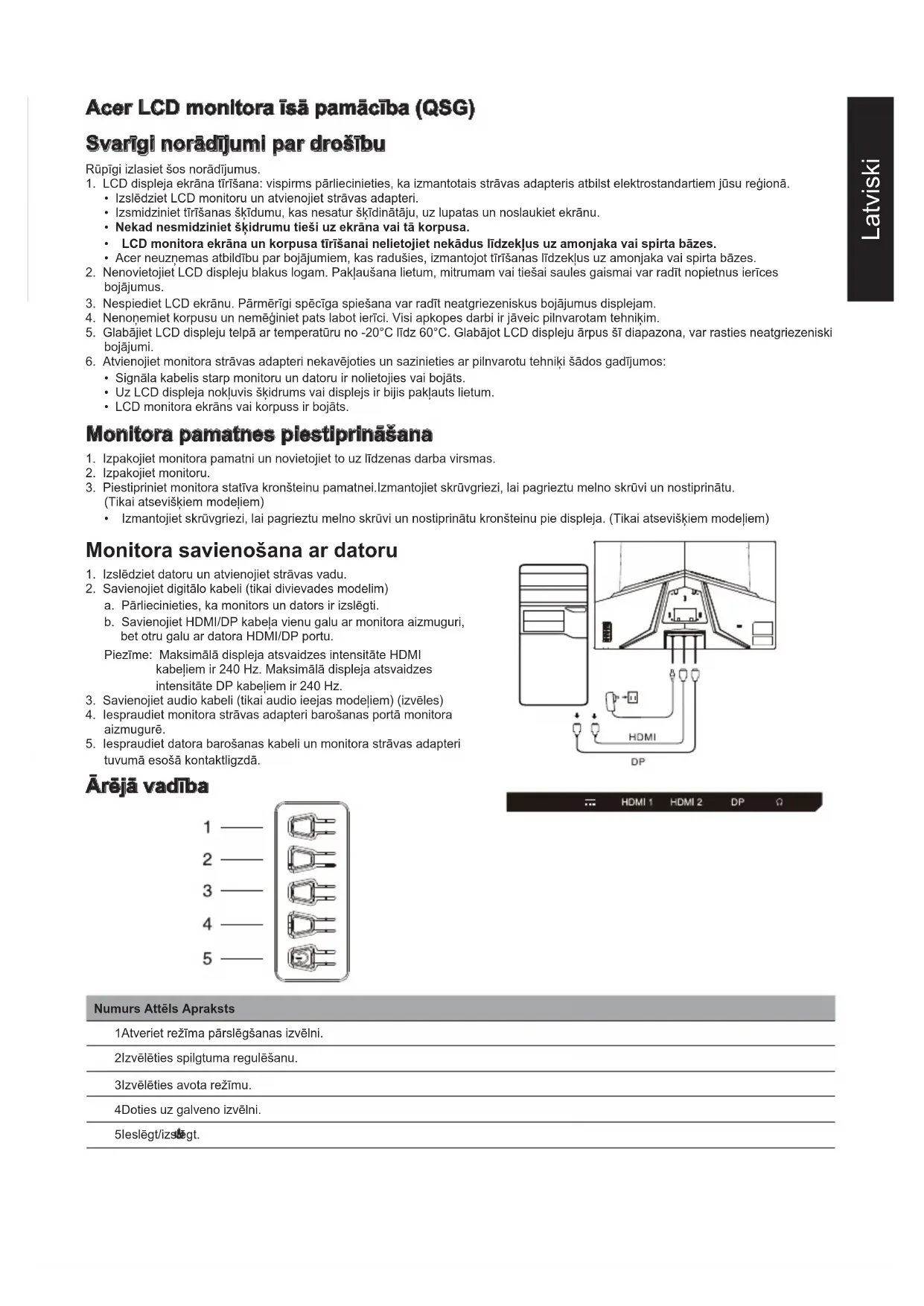 - Energijos sąnaudos per metus apskaičiuojamos naudojant įprastą 4 valandų per dieną, 365 dienų per metus naudojimo statistiką.Latviski Acer LCD monitora īsā pamācība (QSG) Svarīgi norādījumi par drošību Rūpīgi izlasiet šos norādījumus. 1. LCD displeja ekrāna tīrīšana: vispirms pārliecinieties, ka izmantotais strāvas adapteris atbilst elektrostandartiem jūsu reģionā.
