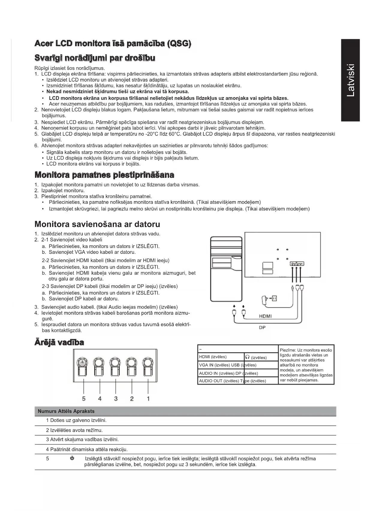 - Energijos sąnaudos per metus apskaičiuojamos naudojant įprastas 4 valandų per dieną, 365 dienų per metus sąnaudas.Latviski Acer LCD monitora īsā pamācība (QSG) Svarīgi norādījumi par drošību Rūpīgi izlasiet šos norādījumus. 1. LCD displeja ekrāna tīrīšana: vispirms pārliecinieties, ka izmantotais strāvas adapteris atbilst elektrostandartiem jūsu reģionā.