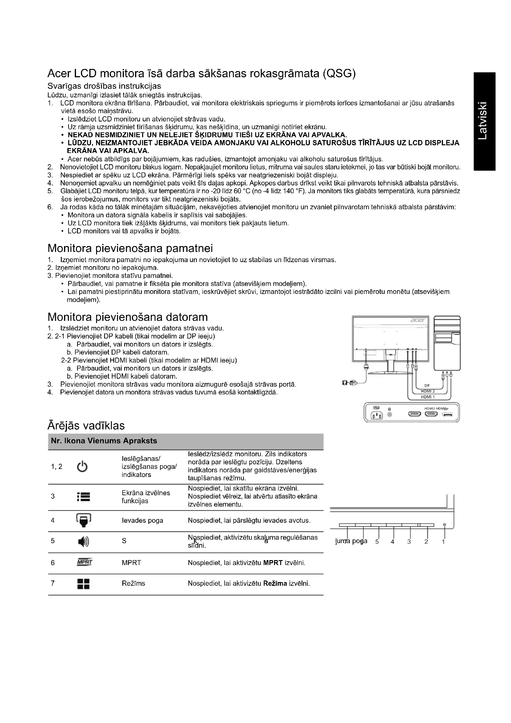 Ekrāna izvēlnes funkcijas Nospiediet, lai skatītu ekrāna izvēlni. Nospiediet vēlreiz, lai atvērtu atlasīto ekrāna izvēlnes elementu. 4 Ievades poga Nospiediet, lai pārslēgtu ievades avotus. 5Skaļuma poga Nospiediet, aktivizētu skaļuma regulēšanas slīdni. 6 MPRT Nospiediet, lai aktivizētu MPRT izvēlni. 7Režīms Nospiediet, lai aktivizētu Režīma izvēlni. HDMI 2 HDMI 1 HDMI2 HDMI1 1234567Latviski Regulas un drošības paziņojumi FCC paziņojums Šī ierīce ir pārbaudīta, un tā atbilst B klases digitālo ierīču ierobežojumiem atbilstoši FCC noteikumu 15. daļai. Šie ierobežojumi paredz pienācīgu aizsardzību pret kaitīgu ietekmi, ja ierīce tiek lietota sadzīves apstākļos. Šī ierīce ģenerē, izmanto un izstaro radiofrekvences enerģiju, un, ja tā netiek uzstādīta un lietota atbilstoši instrukcijām, tā var kaitīgi ietekmēt radio sakarus. Taču netiek sniegta garantija, ka kaitīga ietekme neradīsies parastā uzstādīšanas gadījumā. Ja šī ierīce kaitīgi ietekmē radio vai televīzijas sakarus (to var noteikt, izslēdzot un pēc tam ieslēdzot ierīci), lietotājam ir ieteicams veikt vienu vai vairākus tālāk sniegtos norādījumus, lai to novērstu. Pagrieziet vai pārvietojiet uztvērējantenu. Pārvietojiet ierīci tālāk no uztvērēja. Pievienojiet ierīci citā elektriskajā ķēdē, nevis tajā, kurā ir pievienots uztvērējs. Sazinieties ar izplatītāju vai pieredzējušu radio/televizoru apkopes speciālistu, lai saņemtu palīdzību. CE paziņojums par atbilstību Ar šo Acer Inc. paziņo, ka šis LCD monitors atbilst visām būtiskām prasībām un citiem saistošiem noteikumiem, kas minēti EMC direktīvā 2014/30/EU, zemsprieguma direktīvā 2014/35/EU, RoHS direktīvā 2011/65/EU un direktīvā 2009/125/EK saistībā ar ekodizaina prasību īstenošanu energotaupīgos produktos. Paziņojums Lai novērstu bojājumu monitoram, neceliet to aiz pamatnes. Paziņojums Aizsargāti kabeļi Visi savienojumi ar citām datorierīcēm ir jāveido, izmantojot aizsargātus kabeļus, lai nodrošinātu atbilstību EMC prasībām. Paziņojums Perifērās ierīces Šim aprīkojumam drīkst pievienot tikai tādas perifērās ierīces (ieejas/izejas ierīces, terminālus, printerus utt.), kas ir sertificētas un atbilst B klases ierobežojumiem. Darbināšana, izmantojot nesertificētas perifērās ierīces var radīt traucējumus radio un TV signālu uztveršanā. Uzmanību! Izmaiņas vai modifikācijas, ko ražotājs nav skaidri atļāvis, var anulēt Federālās sakaru komisijas piešķirtās tiesības lietotājam darbināt šo ierīci. Darbības nosacījumi Šī ierīce atbilst FCC noteikumu 15. daļai. Uz darbību attiecas šie divi nosacījumi: 1) šī ierīce nedrīkst izraisīt kaitīgu ietekmi; 2) šai ierīcei ir jāuztver visa saņemtā ietekme pat tādā gadījumā, ja tas var izraisīt nevēlamu darbību. Paziņojums Lietotājiem Kanādā Šī B klases digitālā ierīce atbilst Kanādas noteikumiem ICES-003. Remarque à l'intention des utilisateurs canadiens Cet appareil numérique de la classe B est conforme à la norme NMB-003 du Canada. Nolietotā aprīkojuma utilizēšana, kas attiecas uz privātām mājsaimniecībām Eiropas Savienībā Šis simbols uz produkta vai tā iepakojuma norāda, ka šo produktu nedrīkst utilizēt kopā ar mājsaimniecības atkritumiem. Jūsu pienākums ir utilizēt nolietoto aprīkojumu, nododot to speciālās savākšanas vietās, kur notiek elektriskā un elektroniskā aprīkojuma otrreizēja pārstrāde. Atsevišķa nolietotā aprīkojuma savākšana un otrreizēja utilizēšana palīdz taupīt dabas resursus un nodrošina tādu pārstrādi, kas pasargā cilvēku veselību un vidi. Lai iegūtu papildinformāciju par vietām, kur var nodot nolietoto aprīkojumu otrreizējai pārstrādei, lūdzu, sazinieties ar savu pašvaldību, mājsaimniecības aprīkojumu utilizēšanas dienestu vai veikalu, kur iegādājāties produktu.Latviski SPECIFIKĀCIJA Acer produktu rokasgrāmatas un citus dokumentus skatiet oficiālā Acer atbalsta vietnē. *Enerģijas patēriņš gadā tiek aprēķināts, izmantojot parastu enerģijas patēriņa apjomu 4 stundās/dienā, 365 dienās gadā. LCD panelis Vadošā sistēma TFT krāsu LCD Lielums 23,8”W (60 cm) Pikseļi 0,2058 mm x 0,2058 mm (augstums x platums) Spilgtums 350 cd/m
