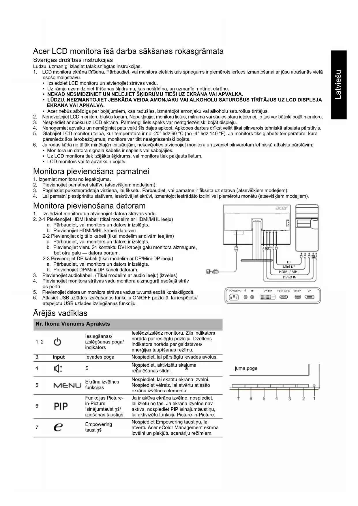 Empowering taustiņš Nospiediet Empowering taustiņu, lai atvērtu Acer eColor Management ekrāna izvēlni un piekļūtu scenāriju režīmiem. POWERDVI-D INHDMI (MHL) DPMini DPMini DP DVI-D INHDMI / MHLPOWERDVI-D INHDMI (MHL) DPMini DPLatviešu Regulas un drošības paziņojumi FCC paziņojums Šī ierīce ir pārbaudīta, un tā atbilst B klases digitālo ierīču ierobežojumiem atbilstoši FCC noteikumu 15. daļai. Šie ierobežojumi paredz pienācīgu aizsardzību pret kaitīgu ietekmi, ja ierīce tiek lietota sadzīves apstākļos. Šī ierīce ģenerē, izmanto un izstaro radiofrekvences enerģiju, un, ja tā netiek uzstādīta un lietota atbilstoši instrukcijām, tā var kaitīgi ietekmēt radio sakarus. Taču netiek sniegta garantija, ka kaitīga ietekme neradīsies parastā uzstādīšanas gadījumā. Ja šī ierīce kaitīgi ietekmē radio vai televīzijas sakarus (to var noteikt, izslēdzot un pēc tam ieslēdzot ierīci), lietotājam ir ieteicams veikt vienu vai vairākus tālāk sniegtos norādījumus, lai to novērstu. Pagrieziet vai pārvietojiet uztvērējantenu. Pārvietojiet ierīci tālāk no uztvērēja. Pievienojiet ierīci citā elektriskajā ķēdē, nevis tajā, kurā ir pievienots uztvērējs. Sazinieties ar izplatītāju vai pieredzējušu radio/televizoru apkopes speciālistu, lai saņemtu palīdzību. CE paziņojums par atbilstību Ar šo Acer Inc. paziņo, ka šis LCD monitors atbilst visām būtiskām prasībām un citiem saistošiem noteikumiem, kas minēti EMC direktīvā 2014/30/EU, zemsprieguma direktīvā 2014/35/EU, RoHS direktīvā 2011/65/EU un direktīvā 2009/125/EK saistībā ar ekodizaina prasību īstenošanu energotaupīgos produktos. Paziņojums Lai novērstu bojājumu monitoram, neceliet to aiz pamatnes. Paziņojums Aizsargāti kabeļi Visi savienojumi ar citām datorierīcēm ir jāveido, izmantojot aizsargātus kabeļus, lai nodrošinātu atbilstību EMC prasībām. Paziņojums Perifērās ierīces Šim aprīkojumam drīkst pievienot tikai tādas perifērās ierīces (ieejas/izejas ierīces, terminālus, printerus utt.), kas ir sertificētas un atbilst B klases ierobežojumiem. Darbināšana, izmantojot nesertificētas perifērās ierīces var radīt traucējumus radio un TV signālu uztveršanā. Uzmanību! Izmaiņas vai modifikācijas, ko ražotājs nav skaidri atļāvis, var anulēt Federālās sakaru komisijas piešķirtās tiesības lietotājam darbināt šo ierīci. Darbības nosacījumi Šī ierīce atbilst FCC noteikumu 15. daļai. Uz darbību attiecas šie divi nosacījumi: 1) šī ierīce nedrīkst izraisīt kaitīgu ietekmi; 2) šai ierīcei ir jāuztver visa saņemtā ietekme pat tādā gadījumā, ja tas var izraisīt nevēlamu darbību. Paziņojums Lietotājiem Kanādā Šī B klases digitālā ierīce atbilst Kanādas noteikumiem ICES-003. Remarque à l'intention des utilisateurs canadiens Cet appareil numérique de la classe B est conforme à la norme NMB-003 du Canada. Nolietotā aprīkojuma utilizēšana, kas attiecas uz privātām mājsaimniecībām Eiropas Savienībā Šis simbols uz produkta vai tā iepakojuma norāda, ka šo produktu nedrīkst utilizēt kopā ar mājsaimniecības atkritumiem. Jūsu pienākums ir utilizēt nolietoto aprīkojumu, nododot to speciālās savākšanas vietās, kur notiek elektriskā un elektroniskā aprīkojuma otrreizēja pārstrāde. Atsevišķa nolietotā aprīkojuma savākšana un otrreizēja utilizēšana palīdz taupīt dabas resursus un nodrošina tādu pārstrādi, kas pasargā cilvēku veselību un vidi. Lai iegūtu papildinformāciju par vietām, kur var nodot nolietoto aprīkojumu otrreizējai pārstrādei, lūdzu, sazinieties ar savu pašvaldību, mājsaimniecības aprīkojumu utilizēšanas dienestu vai veikalu, kur iegādājāties produktu. Brīdinājuma ziņojums par magnētisko lauku Noteiktas elektroniskās ierīces, piemēram, cietie diski, USB ierīces, planšetdatori, klēpjdatori, mobilie tālruņi, pulksteņi, austiņas, skaļruņi, kredītkartes, magnētiskās ID kartes utt., ir pakļautas magnētiskajam laukam, un tās var neatgriezeniski bojāt vai īslaicīgi atspējot, ja tās tiek pakļautas pārāk spēcīgam magnētiskajam laukam. Elektroniskās ierīces nedrīkst novietot uz monitora pamatnes magnētiskā lauka vai tā tuvumā. MagnetLatviešu SPECIFIKĀCIJA Acer produktu rokasgrāmatas un citus dokumentus skatiet oficiālā Acer atbalsta vietnē. *Enerģijas patēriņš gadā tiek aprēķināts, izmantojot parastu enerģijas patēriņa apjomu 4 stundās/dienā, 365 dienās gadā. LCD panelis Vadošā sistēma TFT krāsu LCD Lielums 32”W (81 cm) Pikseļi 0,1845x0,1845 mm (augstums x platums) Spilgtums 350 cd/m