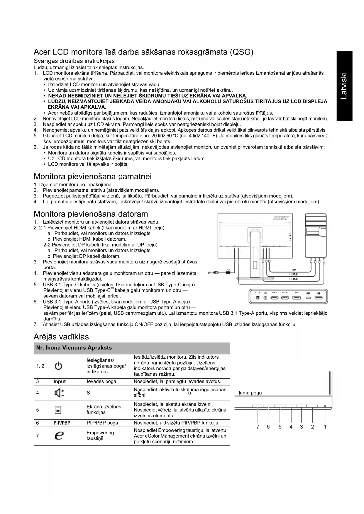 DC IN 1234567Latviski Regulas un drošības paziņojumi FCC paziņojums Šī ierīce ir pārbaudīta, un tā atbilst B klases digitālo ierīču ierobežojumiem atbilstoši FCC noteikumu 15. daļai. Šie ierobežojumi paredz pienācīgu aizsardzību pret kaitīgu ietekmi, ja ierīce tiek lietota sadzīves apstākļos. Šī ierīce ģenerē, izmanto un izstaro radiofrekvences enerģiju, un, ja tā netiek uzstādīta un lietota atbilstoši instrukcijām, tā var kaitīgi ietekmēt radio sakarus. Taču netiek sniegta garantija, ka kaitīga ietekme neradīsies parastā uzstādīšanas gadījumā. Ja šī ierīce kaitīgi ietekmē radio vai televīzijas sakarus (to var noteikt, izslēdzot un pēc tam ieslēdzot ierīci), lietotājam ir ieteicams veikt vienu vai vairākus tālāk sniegtos norādījumus, lai to novērstu. Pagrieziet vai pārvietojiet uztvērējantenu. Pārvietojiet ierīci tālāk no uztvērēja. Pievienojiet ierīci citā elektriskajā ķēdē, nevis tajā, kurā ir pievienots uztvērējs. Sazinieties ar izplatītāju vai pieredzējušu radio/televizoru apkopes speciālistu, lai saņemtu palīdzību. CE paziņojums par atbilstību Ar šo Acer Inc. paziņo, ka šis LCD monitors atbilst visām būtiskām prasībām un citiem saistošiem noteikumiem, kas minēti EMC direktīvā 2014/30/ES, zemsprieguma direktīvā 2014/35/ES, RoHS direktīvā 2011/65/ES un direktīvā 2009/125/EK saistībā ar ekodizaina prasību īstenošanu energotaupīgos produktos. Paziņojums Lai novērstu bojājumu monitoram, neceliet to aiz pamatnes. Paziņojums Aizsargāti kabeļi Visi savienojumi ar citām datorierīcēm ir jāveido, izmantojot aizsargātus kabeļus, lai nodrošinātu atbilstību EMC prasībām. Paziņojums Perifērās ierīces Šim aprīkojumam drīkst pievienot tikai tādas perifērās ierīces (ieejas/izejas ierīces, terminālus, printerus utt.), kas ir sertificētas un atbilst B klases ierobežojumiem. Darbināšana, izmantojot nesertificētas perifērās ierīces var radīt traucējumus radio un TV signālu uztveršanā. Uzmanību! Izmaiņas vai modifikācijas, ko ražotājs nav skaidri atļāvis, var anulēt Federālās sakaru komisijas piešķirtās tiesības lietotājam darbināt šo ierīci. Darbības nosacījumi Šī ierīce atbilst FCC noteikumu 15. daļai. Uz darbību attiecas šie divi nosacījumi: 1) šī ierīce nedrīkst izraisīt kaitīgu ietekmi; 2) šai ierīcei ir jāuztver visa saņemtā ietekme pat tādā gadījumā, ja tas var izraisīt nevēlamu darbību. Paziņojums Lietotājiem Kanādā Šī B klases digitālā ierīce atbilst Kanādas noteikumiem ICES-003. Remarque à l'intention des utilisateurs canadiens Cet appareil numérique de la classe B est conforme à la norme NMB-003 du Canada. Nolietotā aprīkojuma utilizēšana, kas attiecas uz privātām mājsaimniecībām Eiropas Savienībā Šis simbols uz produkta vai tā iepakojuma norāda, ka šo produktu nedrīkst utilizēt kopā ar mājsaimniecības atkritumiem. Jūsu pienākums ir utilizēt nolietoto aprīkojumu, nododot to speciālās savākšanas vietās, kur notiek elektriskā un elektroniskā aprīkojuma otrreizēja pārstrāde. Atsevišķa nolietotā aprīkojuma savākšana un otrreizēja utilizēšana palīdz taupīt dabas resursus un nodrošina tādu pārstrādi, kas pasargā cilvēku veselību un vidi. Lai iegūtu papildinformāciju par vietām, kur var nodot nolietoto aprīkojumu otrreizējai pārstrādei, lūdzu, sazinieties ar savu pašvaldību, mājsaimniecības aprīkojumu utilizēšanas dienestu vai veikalu, kur iegādājāties produktu. Brīdinājuma ziņojums par magnētisko lauku Noteiktas elektroniskās ierīces, piemēram, cietie diski, USB ierīces, planšetdatori, klēpjdatori, mobilie tālruņi, pulksteņi, austiņas, skaļruņi, kredītkartes, magnētiskās ID kartes utt., ir pakļautas magnētiskajam laukam, un tās var neatgriezeniski bojāt vai īslaicīgi atspējot, ja tās tiek pakļautas pārāk spēcīgam magnētiskajam laukam. Elektroniskās ierīces nedrīkst novietot uz monitora pamatnes magnētiskā lauka vai tā tuvumā. MagnetLatviski SPECIFIKĀCIJA Acer produktu rokasgrāmatas un citus dokumentus skatiet oficiālā Acer atbalsta vietnē. *Enerģijas patēriņš gadā tiek aprēķināts, izmantojot parastu enerģijas patēriņa apjomu 4 stundās/dienā, 365 dienās gadā. LCD panelis Vadošā sistēma TFT krāsu LCD Lielums 27”W (69 cm) Pikseļi 0,233 mm x 0,233 mm (augstums x platums) Spilgtums 350 cd/m
