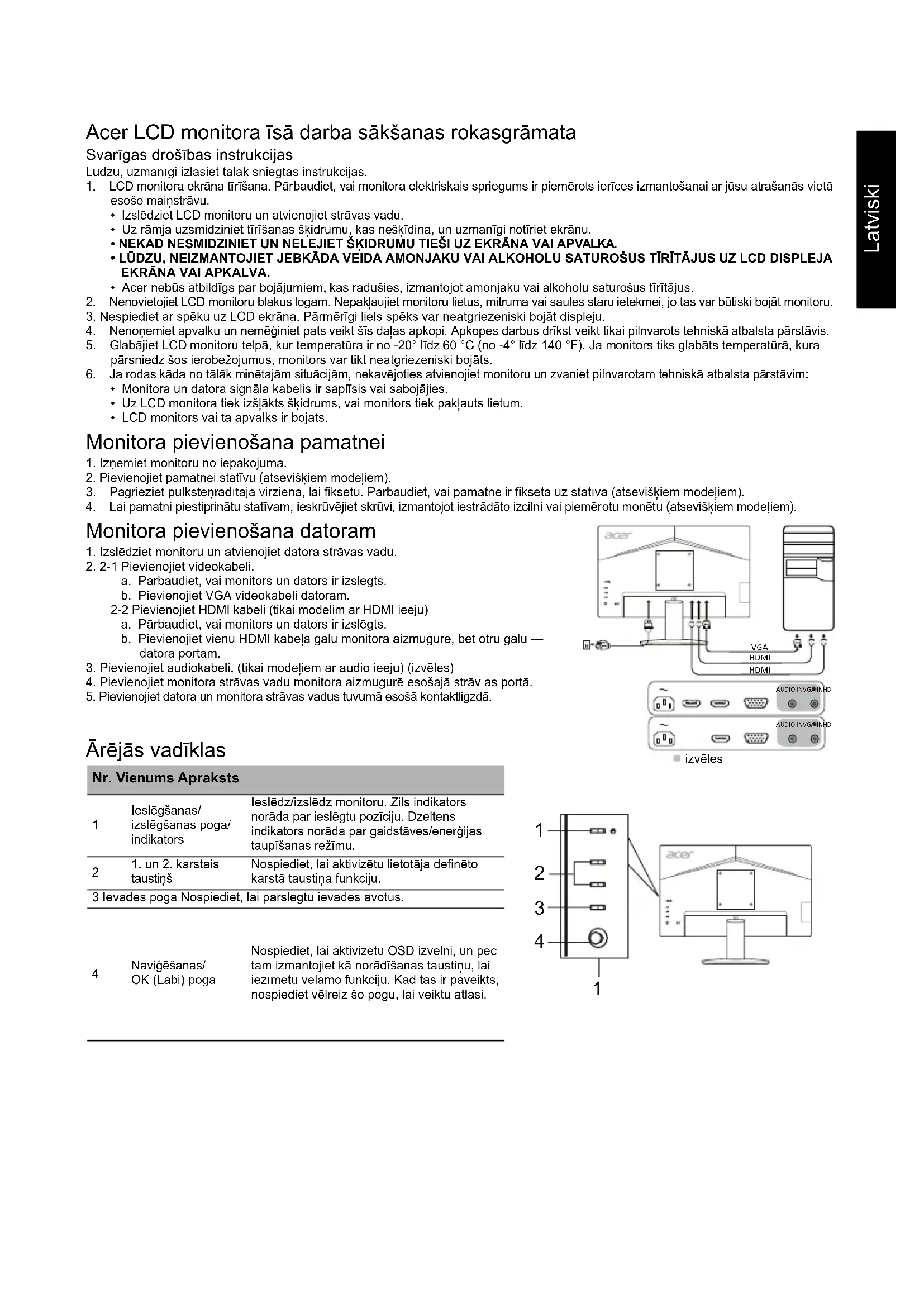 3. Pagrieziet pulksteņrādītāja virzienā, lai fiksētu. Pārbaudiet, vai pamatne ir fiksēta uz statīva (atsevišķiem modeļiem). 4. Lai pamatni piestiprinātu statīvam, ieskrūvējiet skrūvi, izmantojot iestrādāto izcilni vai piemērotu monētu (atsevišķiem modeļiem). Monitora pievienošana datoram 1. Izslēdziet monitoru un atvienojiet datora strāvas vadu.2. 2-1 Pievienojiet videokabeli.a. Pārbaudiet, vai monitors un dators ir izslēgts.b. Pievienojiet VGA videokabeli datoram. 2-2 Pievienojiet HDMI kabeli (tikai modelim ar HDMI ieeju)a. Pārbaudiet, vai monitors un dators ir izslēgts.b. Pievienojiet vienu HDMI kabeļa galu monitora aizmugurē, bet otru galu — datora portam.3. Pievienojiet audiokabeli. (tikai modeļiem ar audio ieeju) (izvēles)4. Pievienojiet monitora strāvas vadu monitora aizmugurē esošajā strāv as portā.5. Pievienojiet datora un monitora strāvas vadus tuvumā esošā kontaktligzdā. Ārējās vadīklas Nr. Vienums Apraksts