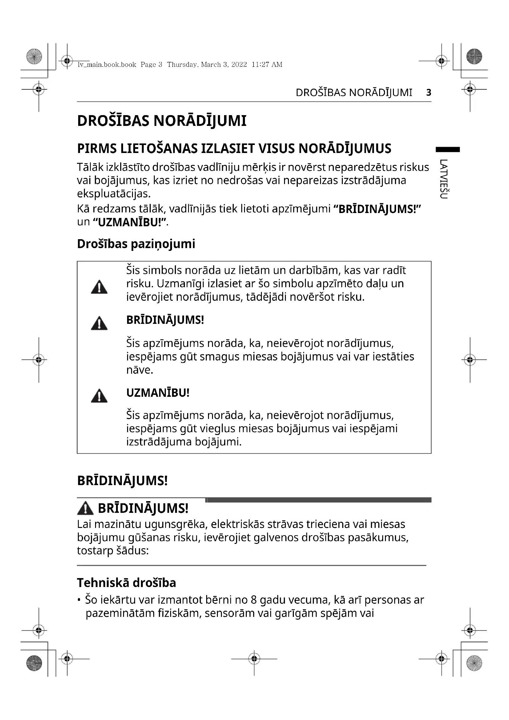 - Šo iekārtu var izmantot bērni no 8 gadu vecuma, kā arī personas ar pazeminātām fiziskām, sensorām vai garīgām spējām vai Šis simbols norāda uz lietām un darbībām, kas var radīt risku. Uzmanīgi izlasiet ar šo simbolu apzīmēto daļu un ievērojiet norādījumus, tādējādi novēršot risku. BRĪDINĀJUMS! Šis apzīmējums norāda, ka, neievērojot norādījumus, iespējams gūt smagus miesas bojājumus vai var iestāties nāve. UZMANĪBU! Šis apzīmējums norāda, ka, neievērojot norādījumus, iespējams gūt vieglus miesas bojājumus vai iespējami izstrādājuma bojājumi. lv_main.book.book Page 3 Thursday, March 3, 2022 11:27 AM4
