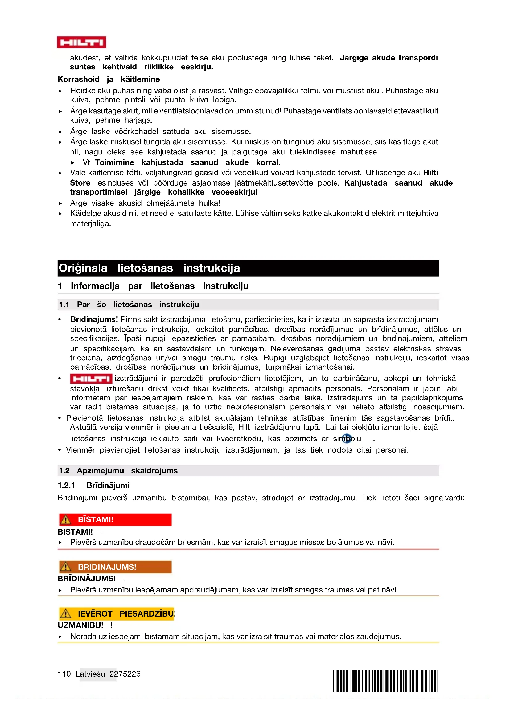 11 Ražotāja garantija ▶ Ar jautājumiem par garantijas nosacījumiem, lūdzu, vērsieties pie vietējā Hilti partnera. 12 Papildu informācija 13 Hilti litija jonu akumulatori Norādījumi par drošību un lietošanu Šajā dokumentācijā ar jēdzienu "akumulators" tiek apzīmēti daudzreiz uzlādējami Hilti litija jonu akumulatori, kas sastāv no vairākiem litija jonu elementiem. Tie ir paredzēti Hilti elektroiekārtām, un tos drīkst lietot tikai kopā ar tām. Lietojiet tikai oriģinālos Hilti akumulatorus! Apraksts Hilti akumulatori ir aprīkoti ar elementu kontroles un elementu aizsardzības sistēmām. Akumulatorus veidojošie elementi satur enerģiju akumulējošus litija jonu materiālus, kas nodrošina lielu specifisko enerģijas blīvumu. Litija jonu elementiem piemīt ļoti neliels atmiņas efekts, taču tie ļoti jutīgi reaģē uz spēka iedarbību, pārmērīgu izlādi vai augstu temperatūru. Izstrādājumus, ko atļauts lietot kopā ar Hilti akumulatoriem, jūs atradīsiet Hilti Store vai tīmekļvietnē: www.hilti.group Drošība ▶ Ievērojiet turpmāk izklāstītos drošības norādījumus, lai litija jonu akumulatoru lietošana neradītu apdraudējumu. Norādījumu neievērošana var izraisīt ādas kairinājumu, smagas korozīvas traumas, ķīmiskos apdegumus, ugunsgrēku vai eksploziju. ▶ Rīkojieties ar akumulatoriem uzmanīgi, lai pasargātu tos no bojājumiem un nepieļautu veselībai ļoti kaitīgu šķidrumu izplūdi! ▶ Nekādā gadījumā nedrīkst veikt akumulatoru pārveidi vai citas neatļautas manipulācijas! ▶ Akumulatorus nedrīkst izjaukt, saspiest, sakarsēt virs 80 °C vai sadedzināt. ▶ Nelietojiet un nemēģiniet uzlādēt akumulatorus, kas bijuši pakļauti triecieniem vai ir bojāti citā veidā. Regulāri pārbaudiet, vai akumulatoriem nav konstatējamas bojājumu pazīmes. ▶ Nekādā gadījumā nelietojiet atjaunotus vai remontētus akumulatorus. ▶ Nekādā gadījumā nelietojiet akumulatoru vai ar akumulatoru darbināmu elektroiekārtu kā instrumentu sišanai.118 Latviešu 2275226 *2275226* ▶ Nekādā gadījumā nepakļaujiet akumulatorus tiešiem saules stariem, augstai temperatūrai, dzirkstelēm vai atklātai liesmai. Tas var izraisīt eksploziju. ▶ Nepieskarieties bateriju poliem ar pirkstiem vai instrumentiem un nepieļaujiet, ka tie nonāk saskarē ar rotaslietām vai citiem priekšmetiem, kam piemīt elektriskā vadītspēja. Tas var izraisīt akumulatoru bojājumus, kā arī materiālu kaitējumu un traumas. ▶ Sargājiet akumulatorus no lietus un mitruma un šķidrumiem. Mitruma iekļūšana var izraisīt īssavienojumu, elektrisko triecienu, apdegumus, ugunsgrēku un eksploziju. ▶ Lietojiet kopā ar akumulatoru tikai tā tipam paredzētos lādētājus un elektroiekārtas. Ievērojiet attiecīgo lietošanas instrukciju norādījumus. ▶ Nelietojiet un neuzglabājiet akumulatoru sprādzienbīstamā vidē.. ▶ Ja akumulators kļūst pārāk karsts, iespējams, ka tas ir bojāts. Novietojiet akumulatoru labi pārredzamā, ugunsdrošā vietā, pietiekamā atstatumā no degošiem materiāliem. Ļaujiet akumulatoram atdzist. Ja pēc stundas akumulators joprojām ir tik karsts, ka to ir grūti satvert, tas nozīmē, ka tas ir bojāts. Rīkojieties saskaņā ar norādījumiem, kas iekļauti nodaļā Pasākumi akumulatora aizdegšanās gadījumā. Rīcība akumulatoru bojājumu gadījumā ▶ Ja akumulators ir bojāts, vienmēr sazinieties ar Hilti servisu. ▶ Nelietojiet akumulatoru, ja no tā izplūst šķidrums. ▶ Šķidruma izplūdes gadījumā nepieļaujiet tā iekļūšanu acīs un/vai saskari ar ādu. Rīkojoties ar elektrolītu, vienmēr valkājiet aizsargcimdus un acu aizsarglīdzekļus. ▶ No baterijām izplūdušā elektrolīta savākšanai lietojiet šim nolūkam paredzētu, sertificētu ķīmisko tīrīšanas līdzekli. Ievērojiet vietējos noteikumus par akumulatoru elektrolīta savākšanu. ▶ Ievietojiet bojāto akumulatoru nedegoša materiāla tvertnē un nosedziet to ar sausām smiltīm, krīta pulveri (CaCO3) vai silikātu (vermikulītu). Pēc tam hermētiski noslēdziet tvertnes vāku un novietojiet tvertni glabāšanā vietā, kas neatrodas degošu gāzu, šķidrumu vai priekšmetu tuvumā. ▶ Nododiet tvertni utilizācijai jūs apkalpojošajā Hilti Store vai vērsieties kompetentajā atkritumu apsaim- niekošanas uzņēmumā. Ievērojiet vietējos noteikumus par bojātu akumulatoru transportēšanu! Rīcība akumulatoru nedarbošanās gadījumā ▶ Pievērsiet uzmanību ar akumulatora lietošanu saistītām novirzēm, piemēram, neatbilstīgai uzlādei vai neparasti ilgam uzlādes laikam, jūtamam jaudas samazinājumam, īpatnībām LED indikācijā vai šķidruma izplūdei. Tās liecina par akumulatora iekšēju problēmu. ▶ Ja jums šķiet, ka akumulatoram ir radusies iekšēja problēma, sazinieties ar Hilti servisu. ▶ Ja akumulators nedarbojas, to vairs nav iespējams uzlādēt vai no tā izplūst šķidrums, tas ir jāutilizē. Skat. nodaļu Apkope un utilizācija. Pasākumi akumulatora aizdegšanās gadījumā BRĪDINĀJUMS! Apdraudējums, ko rada akumulatora aizdegšanās! Akumulatora degšanas laikā izdalās kaitīgi un sprādzienbīstami šķidrumi un tvaiki, kas var izraisīt korozīvas traumas, apdegumus, ugunsgrēku vai eksploziju. ▶ Degoša akumulatora dzēšanas laikā valkājiet individuālo aizsargaprīkojumu. ▶ Nodrošiniet pietiekamu ventilāciju, lai veicinātu bīstamo un eksplozīvo tvaiku aizplūšanu. ▶ Ja intensīvi izplatās dūmi, nekavējoties atstājiet telpu. ▶ Elpceļu kairinājuma gadījumā meklējiet medicīnisko palīdzību. ▶ Pirms sākt dzēšanas mēģinājumu, izsauciet ugunsdzēsējus. ▶ Ja akumulators ir aizdedzies, veiciet dzēšanu tikai ar ūdeni, no iespējami liela attāluma. Pulverveida ugunsdzēšamie līdzekļi un segas litija jonu akumulatoru degšanas gadījumā ir neefektīvi. Apkārtējā ugunsgrēka dzēšanai v