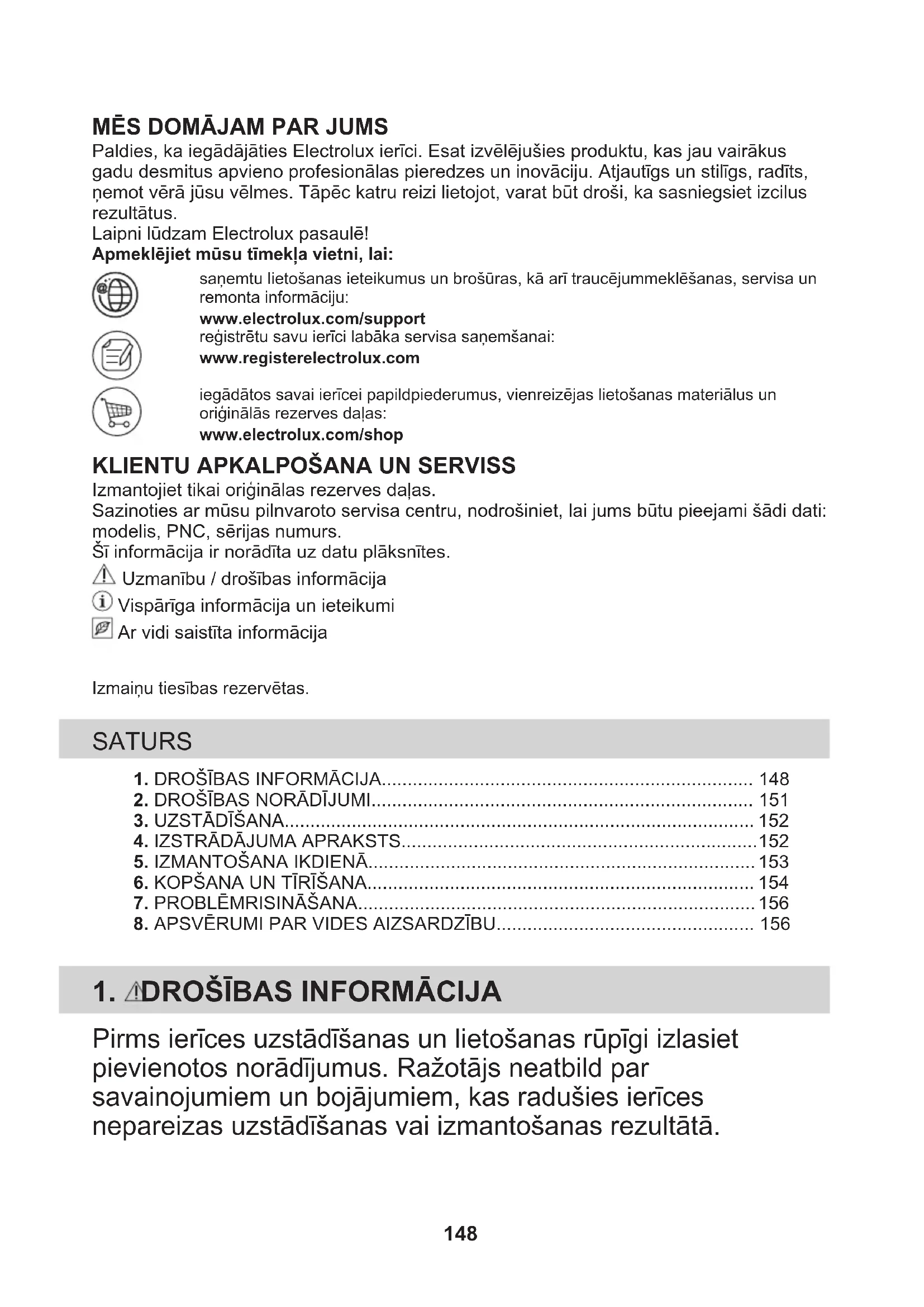 Paldies, ka iegādājāties Electrolux ierīci. Esat izvēlējušies produktu, kas jau vairākusgadu desmitus apvieno profesionālas pieredzes un inovāciju. Atjautīgs un stilīgs, radīts,ņemot vērā jūsu vēlmes. Tāpēc katru reizi lietojot, varat būt droši, ka sasniegsiet izcilusrezultātus.Laipni lūdzam Electrolux pasaulē!Apmeklējiet mūsu tīmekļa vietni, lai:saņemtu lietošanas ieteikumus un brošūras, kā arī traucējummeklēšanas, servisa unremonta informāciju:www.electrolux.com/supportreģistrētu savu ierīci labāka servisa saņemšanai:www.registerelectrolux.comiegādātos savai ierīcei papildpiederumus, vienreizējas lietošanas materiālus unoriģinālās rezerves daļas:www.electrolux.com/shop