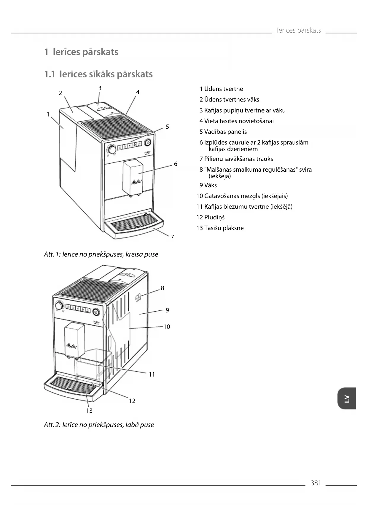 Att. 2: Ierīce no priekšpuses, labā puse 1 Ūdens tvertne 2 Ūdens tvertnes vāks 3 Kajas pupiņu tvertne ar vāku 4 Vieta tasītes novietošanai 5 Vadības panelis 6 Izplūdes caurule ar 2 kajas sprauslām kajas dzērieniem 7 Pilienu savākšanas trauks 8 "Malšanas smalkuma regulēšanas" svira (iekšējā) 9 Vāks 10 Gatavošanas mezgls (iekšējais) 11 Kajas biezumu tvertne (iekšējā) 12 Pludiņš 13 Tasīšu plāksneIerīces pārskats