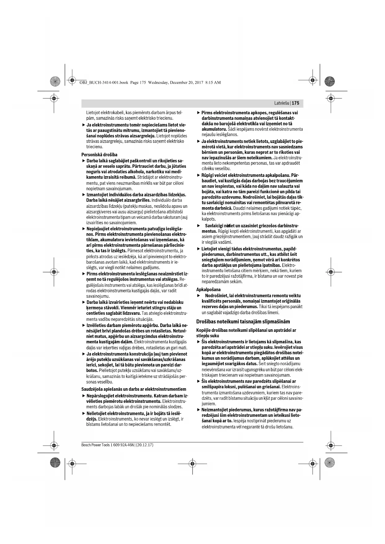 savainojumu. Darba laikā izvairieties ieņemt neērtu vai nedabisku ķermeņa stāvokli. Vienmēr ieturiet stingru stāju un centieties saglabāt līdzsvaru. Tas atvieglo elektroinstru- menta vadību neparedzētās situācijās. Izvēlieties darbam piemērotu apģērbu. Darba laikā ne- nēsājiet brīvi plandošas drēbes un rotaslietas. Netuvi- niet matus, apģērbu un aizsargcimdus elektroinstru- menta kustīgajām daļām. Elektroinstrumenta kustīgajās daļās var ieķerties vaļīgas drēbes, rotaslietas un gari mati. Ja elektroinstrumenta konstrukcija ļauj tam pievienot ārējo putekļu uzsūkšanas vai savākšanas/uzkrāšanas ierīci, sekojiet, lai tā b ūtu pievienota un pareizi dar- botos. Pielietojot putekļu uzsūkšanu vai savākšanu/uz- krāšanu, samazinās to kaitīgā ietekme uz strādājošās per- sonas veselību. Saudzējoša apiešanās un darbs ar elektroinstrumentiem Nepārslogojiet elektroinstrumentu. Katram darbam iz- vēlieties piemērotu elektroinstrumentu. Elektroinstru- ments darbojas labāk un drošāk pie nominālās slodzes. Nelietojiet elektroinstrumentu, ja ir bojāts tā ieslē- dzējs. Elektroinstruments, ko nevar ieslēgt un izslēgt, ir bīstams lietošanai un to nepieciešams remontēt. Pirms elektroinstrumenta apkopes, regulēšanas vai darbinstrumenta nomaiņas atvienojiet tā kontakt- dakšu no barojošā elektrotīkla vai izņemiet no tā akumulatoru. Šādi iespējams novērst elektroinstrumenta nejaušu iesl ēgšanos. Ja elektroinstruments netiek lietots, uzglabājiet to pie- mērotā vietā, kur elektroinstruments nav sasniedzams bērniem un personām, kuras neprot ar to rīkoties vai nav iepazinušās ar šiem noteikumiem. Ja elektroinstru- mentu lieto nekompetentas personas, tas var apdraudēt cilvēku veselību. Rūpīgi veiciet elektroinstrumenta apkalpošanu. Pār- baudiet, vai kustīgās daļas darbojas bez traucējumiem un nav iespiestas, vai kāda no daļām nav salauzta vai bojāta, vai katra no tām pareizi funkcionē un pilda tai paredzēto uzdevumu. Nodrošiniet, lai bojātās daļas tik- tu savlaicīgi nomainītas vai remontētas pilnvarotā re- monta darbnīcā. Daudzi nelaimes gadījumi notiek tāpēc, ka elektroinstruments pirms lietošanas nav pienācīgi ap- kalpots. Savlaicīgi not īriet un uzasiniet griezošos darbinstru- mentus. Rūpīgi kopti elektroinstrumenti, kas apgādāti ar asiem griezējinstrumentiem, ļauj strādāt daudz ražīgāk un ir vieglāk vadāmi. Lietojiet vienīgi tādus elektroinstrumentus, papild- piederumus, darbinstrumentus utt., kas atbilst šeit sniegtajiem norādījumiem, ņemot vērā arī konkrētos darba apstākļus un pielietojuma īpatnības. Elektro- instrumentu lietošana citiem mērķiem, nekā tiem, kuriem to ir paredzējusi ražotājfirma, ir bīstama un var novest pie neparedzamām sekām. Apkalpošana Nodrošiniet, lai elektroinstrumenta remontu veiktu kvalificēts personāls, nomaiņai izmantojot oriģinālās rezerves daļ as un piederumus. Tikai tā iespējams panākt un saglabāt vajadzīgo darba drošības līmeni. Drošības noteikumi taisnajām slīpmašīnām Kopējie drošības noteikumi slīpēšanai un apstrādei ar stiepļu suku Šis elektroinstruments ir lietojams kā slīpmašīna, kas paredzēta arī apstrādei ar stiepļu suku. Ievērojiet visus kopā ar elektroinstrumentu piegādātos drošības notei- kumus un norādījumus darbam, aplūkojiet attēlus un iegaumējiet svarīgākos datus. Šeit sniegto norādījumu neievērošana var izraisīt ugunsgrēku un būt par cēloni elek- triskajam triecienam vai nopietnam savainojumam. Šis elektroinstruments nav paredzēts slīpēšanai ar smilšpapīra loksni, pulēšanai un griešanai. Elektroins- trumenta izmantošana uzdevumiem, kuriem tas nav pare- dzēts, var radīt bīstamu situā ciju un kļūt par cēloni savaino- jumiem. Neizmantojiet piederumus, kurus ražotājfirma nav pa- redzējusi šim elektroinstrumentam un ieteikusi lieto- šanai kopā ar to. Iespēja nostiprināt piederumu uz elektroinstrumenta vēl negarantē tā drošu lietošanu. OBJ_BUCH-3414-001.book Page 175 Wednesday, December 20, 2017 8:15 AM176 | Latviešu 1 609 92A 46N | (20.12.17) Bosch Power Tools Iestiprināmā darbinstrumenta pieļaujamajam grieša- nās ātrumam jābūt ne mazākam par elektroinstrumen- ta lielāko norādīto griešanās ātrumu. Piederums, kas griežas ātrāk, nekā pieļaujams, var salūzt un tikt mests prom. Darbinstrumentu ārējam diametram un biezumam jāat- bilst elektroinstrumenta konstrukcijai un izmēriem. Ja darbinstrumenta izmēri ir izvēlēti nepareizi, tas pilnībā nenovietojas zem aizsargpārsega un darba laikā apgrūtina instrumenta vadību. Darbinstrumentiem, kas stiprināmi ar vītnes palīdzību, stiprinošajai vītnei precīzi jāatbilst slīpmašīnas darb- vārpstas v ītnei. Darbinstrumentiem, kas stiprināmi ar balstpaplāksnes palīdzību, atvēruma diametram jāat- bilst balstpaplāksnes stiprinošā pacēluma diametram. Darbinstrumenti, kas nav precīzi nostiprināti uz elektroins- trumenta darbvārpstas, nevienmērīgi griežas, ļoti spēcīgi vibrē un var izraisīt kontroles zaudēšanu pār elektroinstru- mentu. Neizmantojiet bojātus darbinstrumentus. Ik reizi pirms darbinstrumentu lietošanas pārbaudiet, vai tie nav bo- jāti, piemēram, vaislīpēšanas diski nav atslāņojušies vai ieplaisājuši, vai slīpēšanas pamatnē nav vērojamas plaisas un vai stiepļu suku veidojošās stieples nav vaļī- gas vai atlūzušas. Ja elektroinstruments vai darbins- truments ir kritis no zināma augstuma, pārbaudiet, vai tas nav bojāts, vai arī izmantojiet darbam nebojātu dar- binstrumentu. Pēc darbinstrumenta apskates un ie- stiprināšanas ļaujiet elektroinstrumentam darboties ar maksimālo griešanās ātrumu vienu minūti ilgi, turot ro- tējošo darbinstrumentu drošā attālumā no sevis un ci- tām tuvumā esošajām personām. Bojātie darbinstru- menti šādas pārbaude