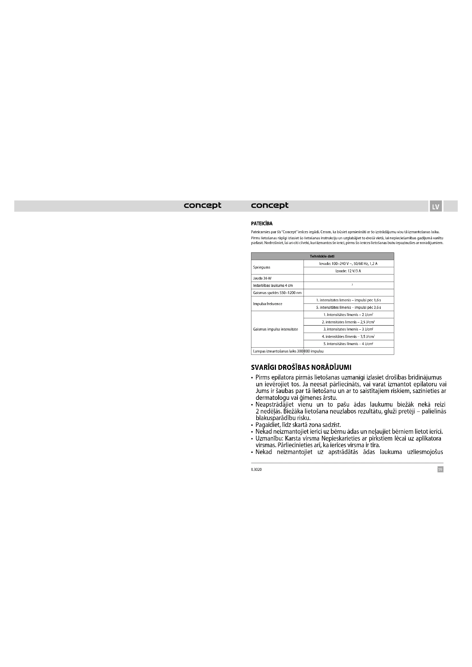IL3020 PATEICĪBA Pateicamies par šīs “Concept” ierīces iegādi. Ceram, ka būsiet apmierināti ar šo izstrādājumu visu tā izmantošanas laiku. Pirms lietošanas rūpīgi izlasiet šo lietošanas instrukciju un uzglabājiet to drošā vietā, lai nepieciešamības gadījumā varētu pārlasīt. Nodrošiniet, lai arī citi cilvēki, kuri izmantos šo ierīci, pirms šīs ierīces lietošanas būtu iepazinušies ar norādījumiem. Tehniskie dati Spriegums Ievade: 100–240V ~, 50/60Hz, 1,2A Izvade: 12V/3A Jauda 36W Iedarbības laukums 4cm