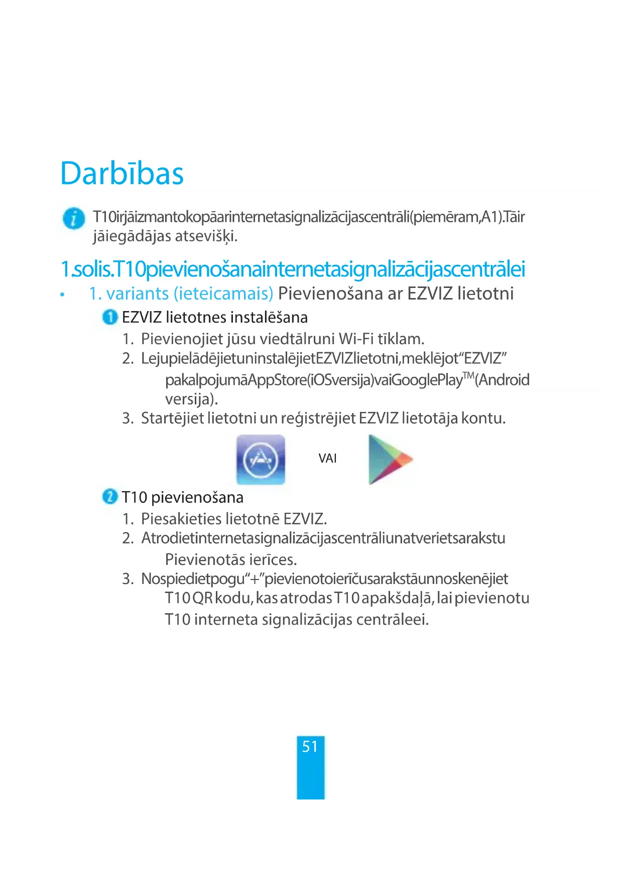 - Vastasel juhul on patarei tühi. Vahetage patarei. Lisateavet leiate aadressilt www.ezvizlife.com.51 Darbības T10 ir jāizmanto kopā ar interneta signalizācijas centr āli (piemēr am, A1). Tā ir jāiegādājas atsevišķi.