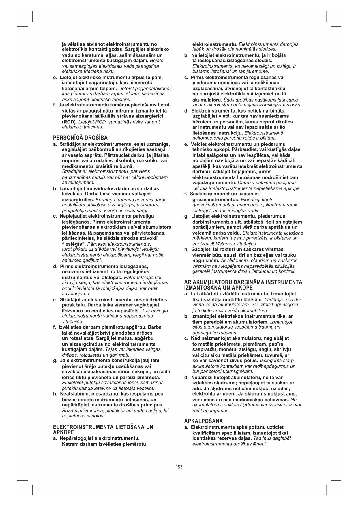 183ja vēlaties atvienot elektroinstrumentu no elektrotīkla kontaktligzdas. Sargājiet elektrisko vadu no karstuma, eļļas, asām šķautnēm un elektroinstrumenta kustīgajām daļām. Bojāts vai samezglojies elektriskais vads paaugstina elektriskā trieciena risku. e. Lietojot elektrisko instrumentu ārpus telpām, izmantojiet pagarinātāju, kas piemērots lietošanai ārpus telpām. Lietojot pagarinātājkabeli, kas piemērots darbam ārpus telpām, samazinās risks saņemt elektrisko triecienu. f. Ja elektroinstrumentu tomēr nepieciešams lietot vietās ar paaugstinātu mitrumu, izmantojiet tā pievienošanai atlikušās strāvas aizsargierīci (RCD). Lietojot RCD, samazinās risks saņemt elektrisko triecienu.