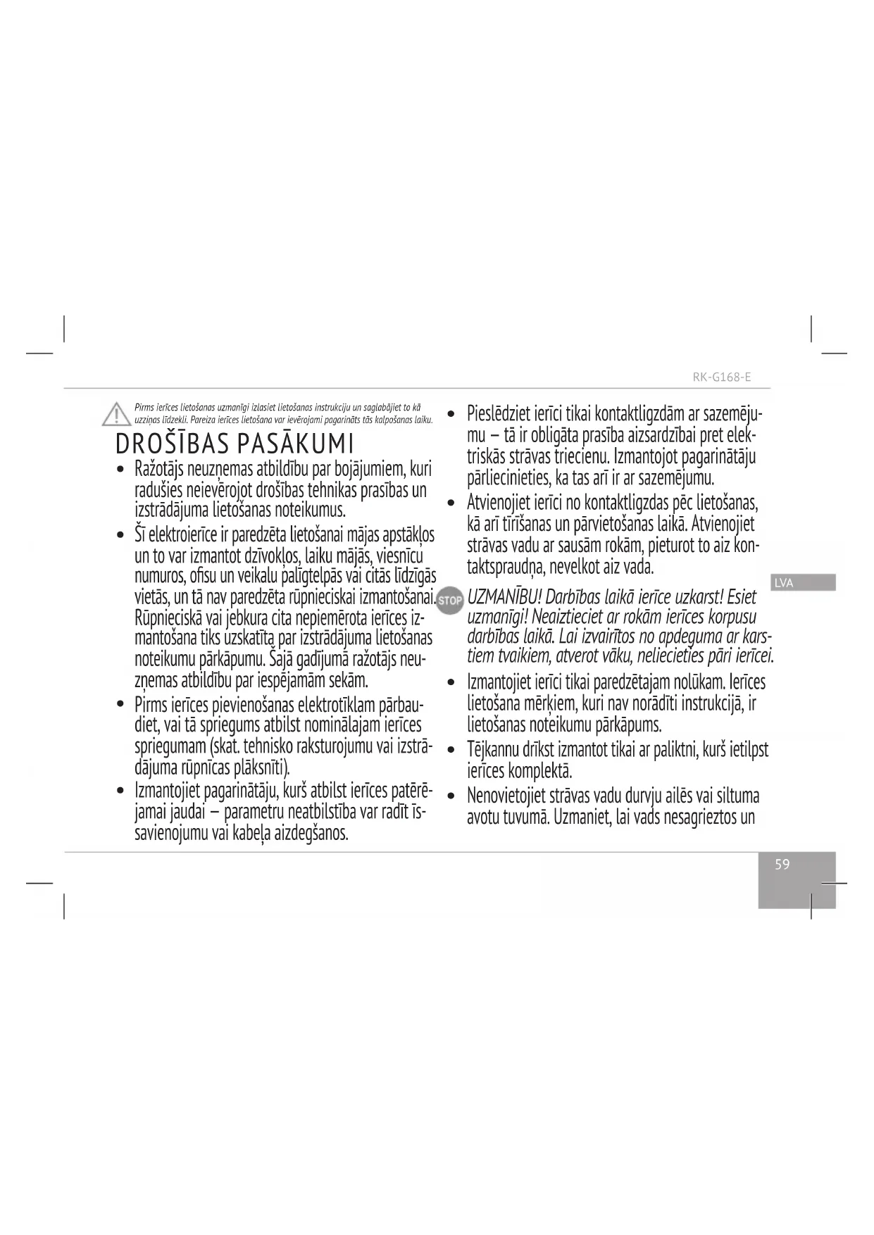 Šim izstrādājumam tiek piešķirta garantija uz 2 gadi no tā iegādāšanās mirkļa. Garan- tijas perioda laikā ražotājs uzņemas pienākumu novērst, veicot remontu, nomainot detaļas vai nomainot visu izstrādājumu, jebkurus ražošanas defektus, kurus izraisījusi nepietiekama materiālu vai montāžas kvalitāte. Garantija stājas spēkā tikai tajā gadī- jumā, ja iegādāšanās datums ir apstiprināts ar veikala zīmogu un pārdevēja parakstu oriģinālajā garantijas talonā. Šī garantija tiek atzīta par spēkā esošu tikai tad, ja izstrā- dājums ir lietots atbilstoši lietošanas instrukcijai, nav ticis remontēts, izjaukts un nav bijis sabojāts nepareizas rīcības ar to rezultātā, kā arī saglabāta pilna izstrādājuma komplektācija. Šī garantija nav attiecināma uz dabīgo izstrādājuma nolietojumu un patērējamajiem materiāliem (ltriem, lampiņām, keramiskajiem un teona pārklājumiem, gumijas blīvējumiem utt.). Izstrādājuma kalpošanas termiņš un ar to saistīto garantijas saistību darbības termiņš tiek aprēķināts no pārdošanas dienas vai no izstrādājuma izgatavošanas datuma (ga- dījumā, ja pārdošanas datumu nav iespējams noteikt). Ierīces izgatavošanas datums ir atrodams sērijas numurā, kas atrodas identikācijas uzlīmē uz izstrādājuma korpusa. Sērijas numurs sastāv no 13 zīmēm. 6. un 7. zīme apzīmē mēnesi, 8. zīme – ierīces izlaiduma gadu. Ražotāja noteiktais ierīces kalpošanas termiņš ir 3 gadi no tā iegādāšanās dienas. Termiņš ir spēkā esošs pie nosacījuma, ka izstrādājuma ekspluatācija notikusi atbilstoši šai instrukcijai un lietojamajiem tehniskajiem standartiem. Šis termiņš ir spēkā tikai ar nosacījumu, ka šī izstrādā- juma ekspluatācija notiek, strikti ievērojot šo instrukciju un uzstādītās tehniskās prasības. Ekoloģiski nekaitīga utilizācija (elektronisko un elektrisko ierīču utilizācija) Iepakojumu, lietošanas instrukciju, kā arī pašu ierīci nepieciešams utilizēt atbilstoši vietējai atkritumu pārstrādes programmai. Rūpējieties par apkār- tējo dabu: neizmetiet šādus izstrādājumus kopā ar parastajiem sadzīves atkri- tumiem.RK-G168-E