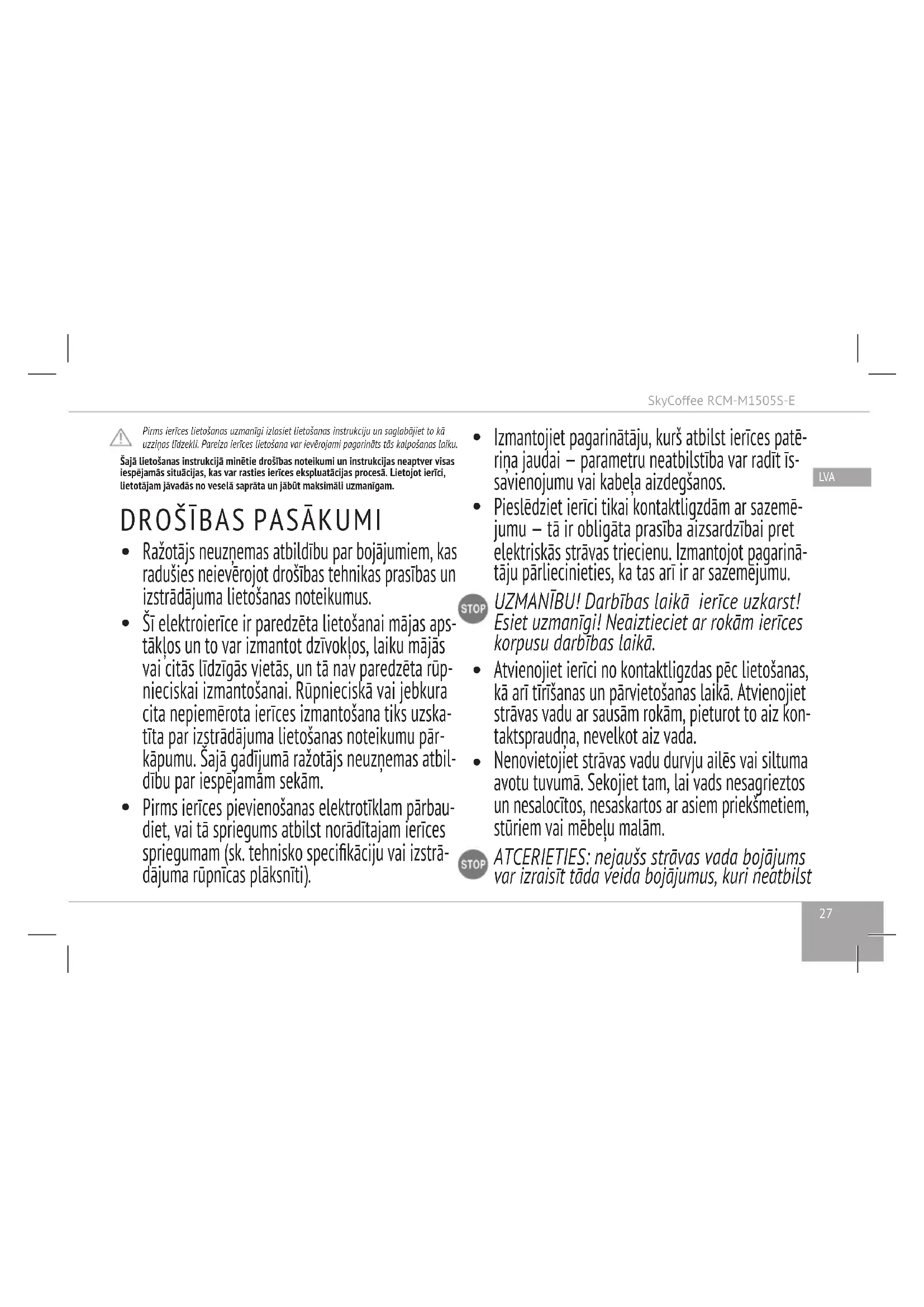 Aizliegts patstāvīgi veikt ierīces remontu vai iz- maiņas tās konstrukcijā. Ierīces remontu drīkst veikt tikai autorizētā servisa centra speciālists. Nepro- fesionāli veikti darbi var novest pie ierīces bojāju- ma, traumām un īpašuma bojājumiem. UZMANĪBU! Aizliegts izmantot ierīci jebkādu bojājumu gadījumā.SkyCoffee RCM-M1505S-E