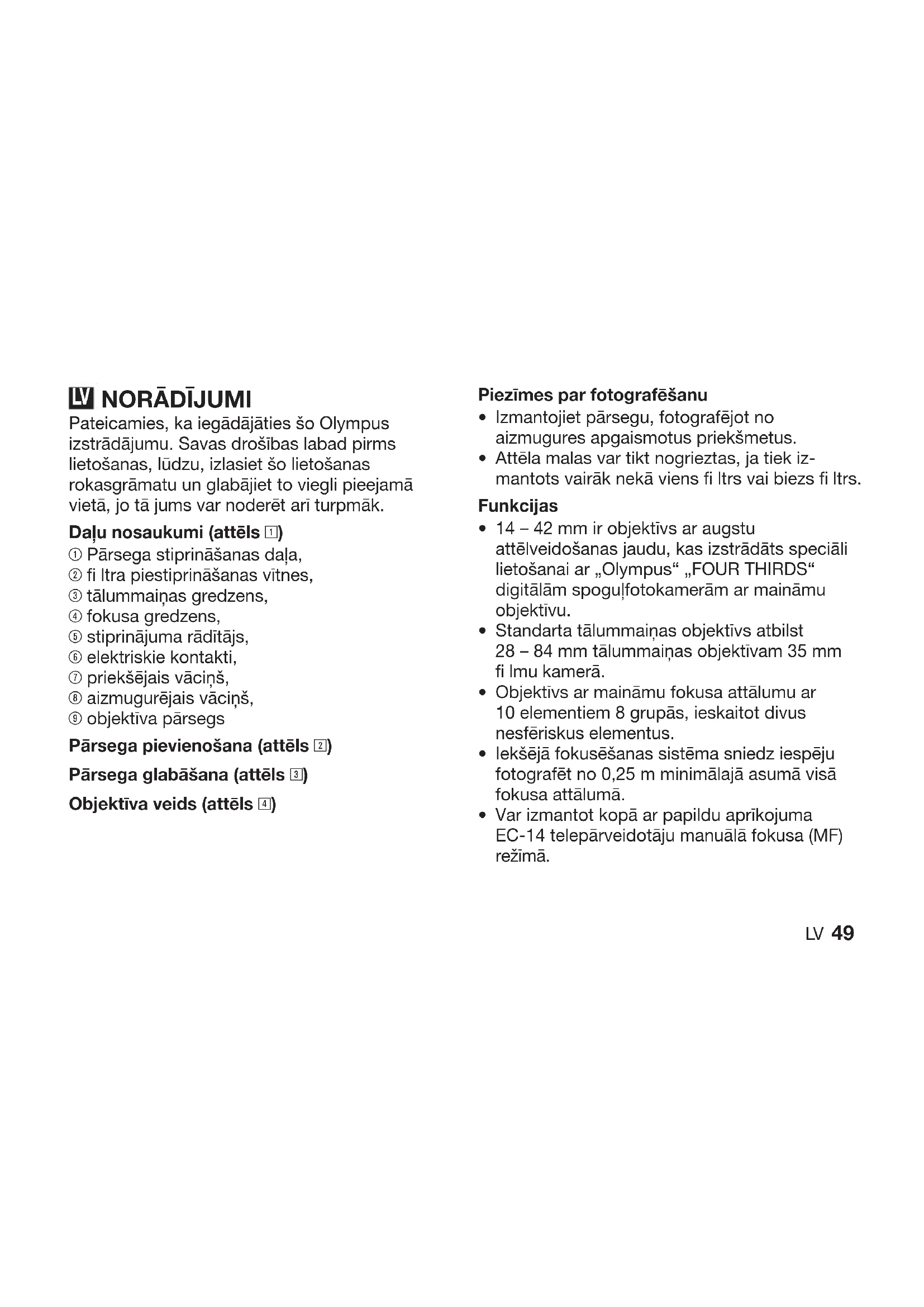 Pateicamies, ka iegādājāties šo Olympus izstrādājumu. Savas drošības labad pirms lietošanas, lūdzu, izlasiet šo lietošanas rokasgrāmatu un glabājiet to viegli pieejamā vietā, jo tā jums var noderēt arī turpmāk. Daļu nosaukumi (attēls 1) 1 Pārsega stiprināšanas daļa, 2 fi ltra piestiprināšanas vītnes, 3 tālummaiņas gredzens, 4 fokusa gredzens, 5 stiprinājuma rādītājs, 6 elektriskie kontakti, 7 priekšējais vāciņš, 8 aizmugurējais vāciņš, 9 objektīva pārsegs Pārsega pievienošana (attēls 2) Pārsega glabāšana (attēls 3) Objektīva veids (attēls 4) Piezīmes par fotografēšanu Izmantojiet pārsegu, fotografējot no aizmugures apgaismotus priekšmetus. Attēla malas var tikt nogrieztas, ja tiek iz- mantots vairāk nekā viens fi ltrs vai biezs fi ltrs. Funkcijas 14 – 42 mm ir objektīvs ar augstu attēlveidošanas jaudu, kas izstrādāts speciāli lietošanai ar „Olympus“ „FOUR THIRDS“ digitālām spoguļfotokamerām ar maināmu objektīvu. Standarta tālummaiņas objektīvs atbilst 28 – 84 mm tālummaiņas objektīvam 35 mm fi lmu kamerā. Objektīvs ar maināmu fokusa attālumu ar 10 elementiem 8 grupās, ieskaitot divus nesfēriskus elementus. Iekšējā fokusēšanas sistēma sniedz iespēju fotografēt no 0,25 m minimālajā asumā visā fokusa attālumā. Var izmantot kopā ar papildu aprīkojuma EC-14 telepārveidotāju manuālā fokusa (MF) režīmā.