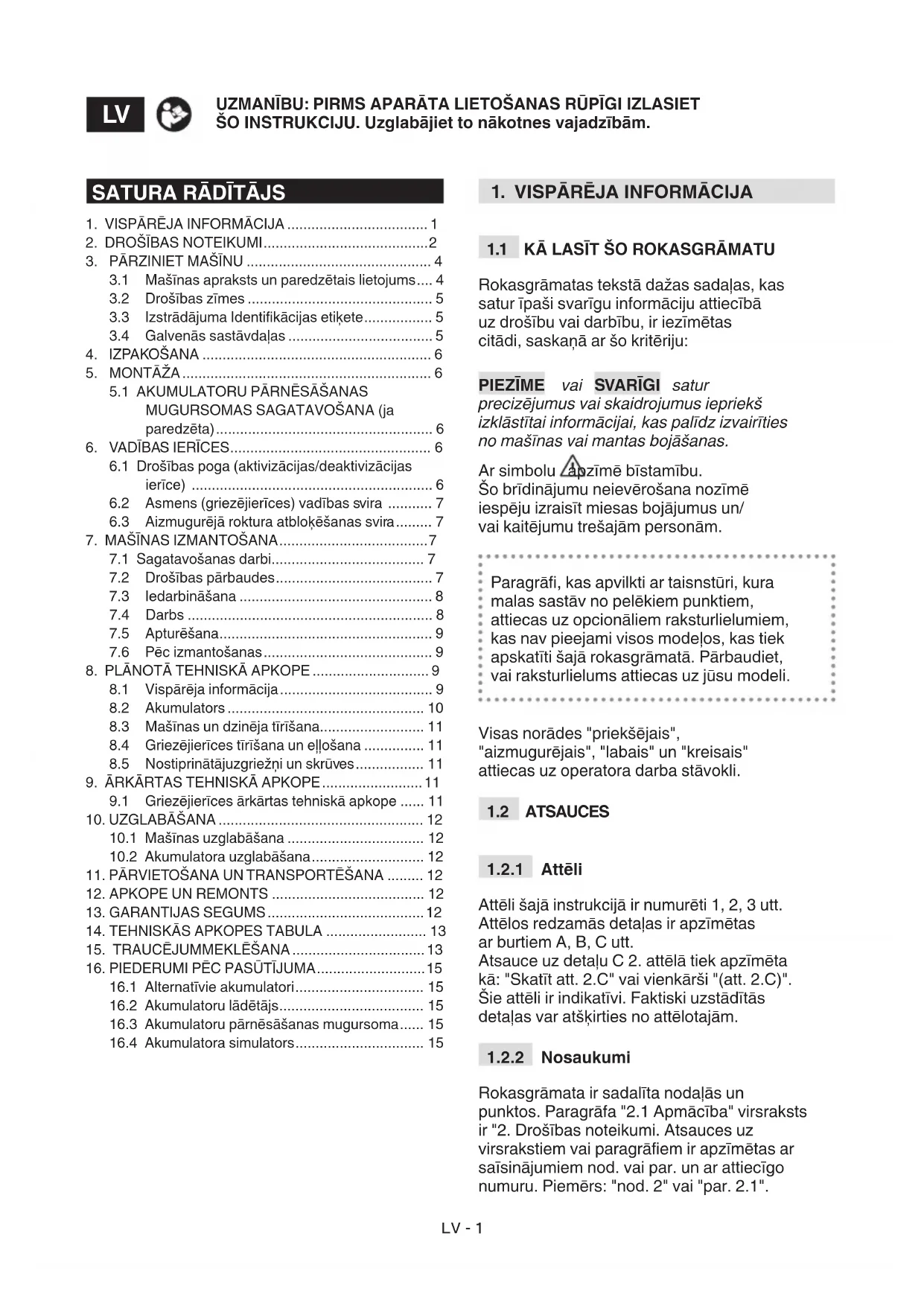 UZMANĪBU Turpmāk izklāstītie drošības noteikumi ietver noteikumus, kas ir ietverti attiecīgajā akumu- latoru lādētāja rokasgrāmatā.