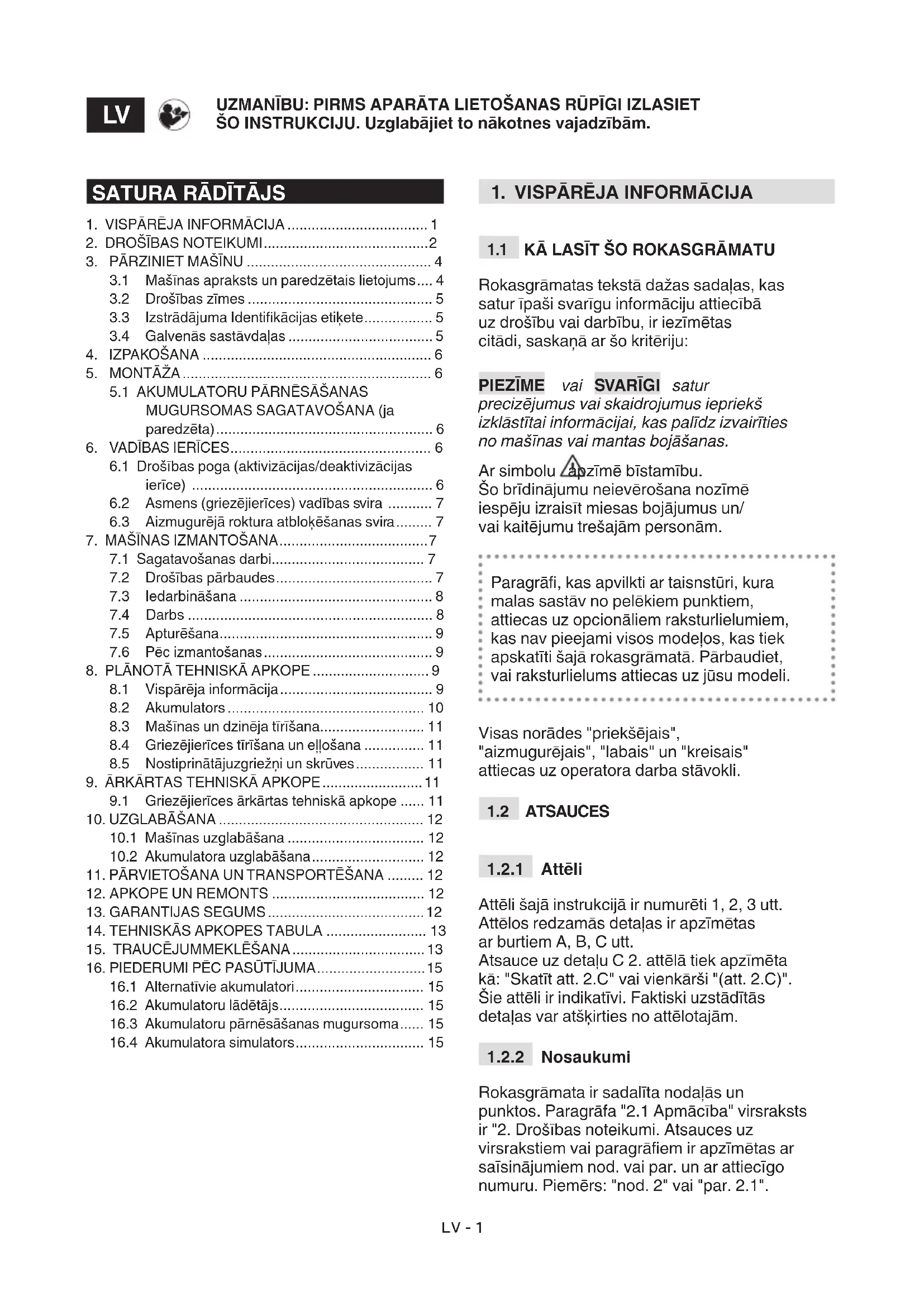 SVARĪGI Turpmāk izklāstītie drošības noteikumi ietver norādījumus, kuri ir ietverti attiecīgajā akumulatora un akumulatoru lādētāja rokasgrāmatā, kura ir pievienota mašīnai.