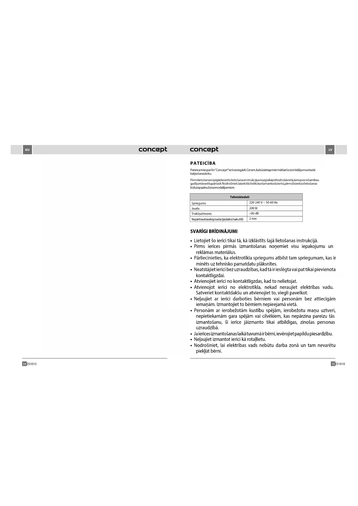 Pateicamies par šīs “Concept” ierīces iegādi. Ceram, ka būsiet apmierināti ar šo izstrādājumu visu tā kalpošanas laiku. Pirms lietošanas rūpīgi izlasiet šo lietošanas instrukciju un uzglabājiet to drošā vietā, lai nepieciešamības gadījumā varētu pārlasīt. Nodrošiniet, lai arī citi cilvēki, kuri izmantos šo ierīci, pirms šīs ierīces lietošanas būtu iepazinušies ar norādījumiem. Tehniskie dati Spriegums 220-240 V ~ 50-60 Hz Jauda 200 W Trokšņa līmenis <80 dB Nepārtrauktas ekspluatācijas laiks (maks. KB) 2 min
