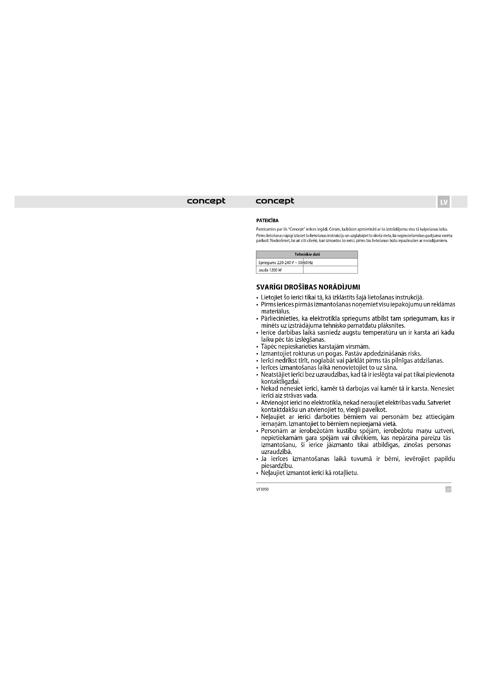 VF3050 PATEICĪBA Pateicamies par šīs “Concept” ierīces iegādi. Ceram, ka būsiet apmierināti ar šo izstrādājumu visu tā kalpošanas laiku. Pirms lietošanas rūpīgi izlasiet šo lietošanas instrukciju un uzglabājiet to drošā vietā, lai nepieciešamības gadījumā varētu pārlasīt. Nodrošiniet, lai arī citi cilvēki, kuri izmantos šo ierīci, pirms tās lietošanas būtu iepazinušies ar norādījumiem. Tehniskie dati Spriegums 220-240 V ~ 50/60Hz Jauda 1200W SVARĪGI DROŠĪBAS NORĀDĪJUMI