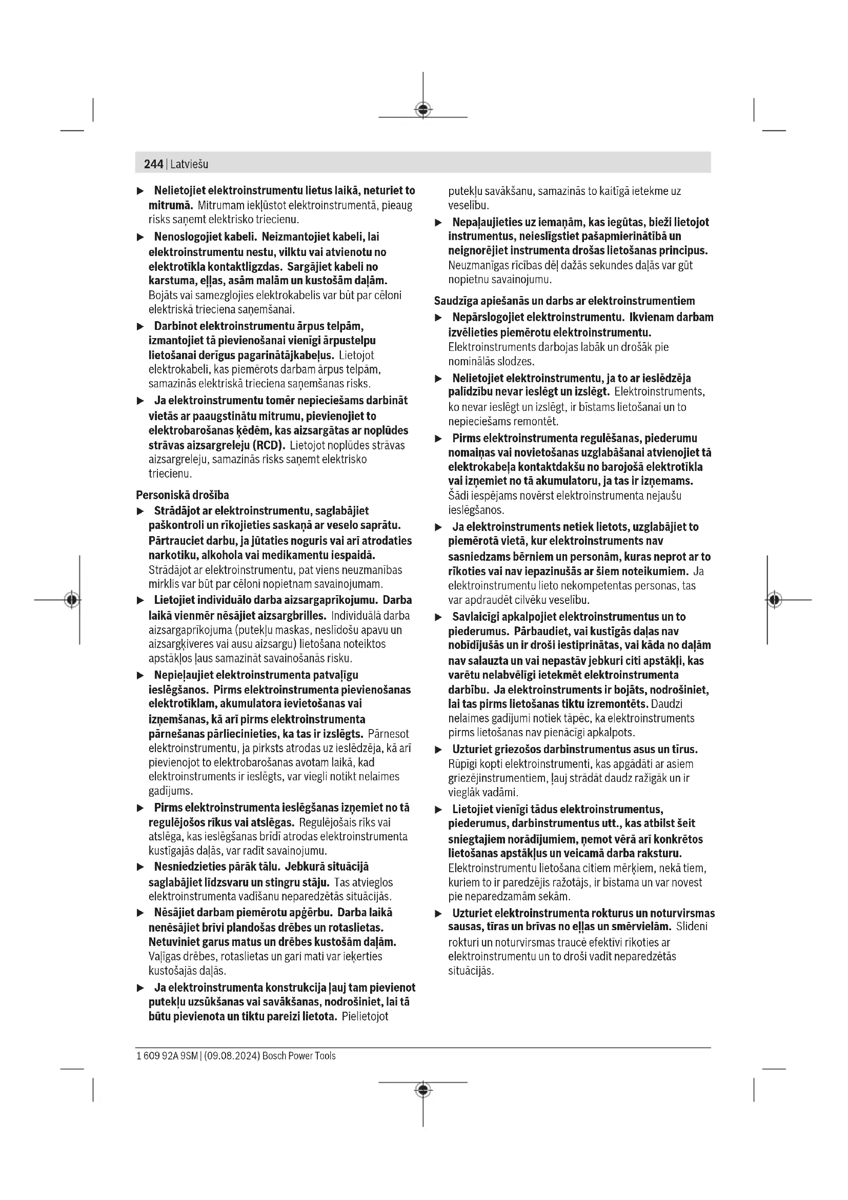 Šajā pamācībā norādītais vibrācijas līmenis un instrumenta radītā trokšņa vērtība ir izmērīta atbilstoši standartā noteiktajai procedūrai un var tikt izmantota elektroinstrumentu savstarpējai salīdzināšanai. To var izmantot arī vibrācijas un trokšņa radītās papildu slodzes iepriekšējai novērtēšanai. Šeit norādītais svārstību līmenis un instrumenta radītā trokšņa vērtība ir attiecināma uz elektroinstrumenta galvenajiem pielietojuma veidiem. Ja elektroinstruments tiek lietots netipiskiem mērķiem, kopā ar netipiskiem darbinstrumentiem vai nav vajadzīgajā veidā apkalpots, tā svārstību līmenis un radītā trokšņa vērtība var atšķirties no šeit norādītajām vērtībām. Tas var ievērojami palielināt svārstību un trokšņa radīto papildu slodzi kopējam darba laika posmam. Lai precīzi izvērtētu svārstību un trokšņa radīto papildu slodzi zināmam darba laika posmam, jāņem vērā arī laiks, kad elektroinstruments ir izslēgts vai arī darbojas, taču faktiski netiek izmantots paredzētā darba veikšanai. Tas var ievērojami samazināt svārstību un trokšņa radīto papildu slodzi kopējam darba laika posmam. Veiciet papildu pasākumus, lai pasargātu strādājošo personu no vibrācijas kaitīgās iedarbības, piemēram, savlaicīgi veiciet elektroinstrumenta un darbinstrumentu apkalpošanu, uzturiet rokas siltas un pareizi plānojiet darbu. Norādījumi par precizitāti Apgriezienu samazināšana (jo īpaši zemāk nekā 50%) var izraisīt maksimālā griezes momenta samazināšanos. Palielināts apgriezienu skaits ar aktīvu Power Boost funkciju var ietekmēt instrumenta precizitāti un tā izslēgšanos. Ir iespējama pārlieku liela sajūga aizture. Iekārtas veiktspējas pārbaudes parasti tiek veiktas pie 600min-1 saskaņā ar VDI2647. Apgriezienu skaita vai griezes momenta izmaiņas var ietekmēt precizitāti. Iekārtas veiktspēja ir jāpārbauda ar tajā brīdī esošajiem iestatījumiem. Akumulators Bosch pārdod akumulatora elektriskos darbinstrumentus arī bez akumulatora. Tas, vai Jūsu elektriskā darbinstrumenta piegādes komplektācijā ir iekļauts akumulators, ir norādīts uz iesaiņojuma. Akumulatora uzlāde u Izmantojiet vienīgi tehniskajos datos norādītās uzlādes ierīces. Vienīgi šī uzlādes ierīce ir piemērota jūsu elektroinstrumentā izmantojamā litija-jonu akumulatora uzlādei. Norāde: atbilstoši starptautiskajiem kravu pārvadāšanas noteikumiem litija jonu akumulatori tiek piegādāti daļēji uzlādētā stāvoklī. Lai nodrošinātu pilnu akumulatora jaudu, pirms pirmās lietošanas reizes pilnībā uzlādējiet akumulatoru. Akumulatora ielikšana Ievietojiet uzlādēto akumulatoru akumulatora stiprinājumā, līdz tas tiek nofiksēts. Akumulatora izņemšana Lai izņemtu akumulatoru, nospiediet akumulatora atbrīvošanas taustiņus un izvelciet akumulatoru. Nedarbojieties ar spēku. 1 609 92A 9SM | (09.08.2024) Bosch Power ToolsLatviešu | 249 Akumulatora uzlādes pakāpes indikators (dzeltena LED diode) Akumulatora uzlādes pakāpes indikators Nozīme Indikators mirgo + skan akustisks signāls Uzlādējiet akumulatoru: vēl var ieskrūvēt 6–8skrūves. Deg pastāvīgi + akustisks signāls Vairs nevar ieskrūvēt pat vienu skrūvi vai arī elektroinstruments ir pārslogots: elektroinstrumentu vairs nevar ieslēgt. – Izņemiet akumulatoru un tā vietā ievietojiet citu, pilnīgi uzlādētu akumulatoru. Indikators mirgo Elektroinstruments ir pārkarsis un vairs nespēj darboties: – Pirms elektroinstrumenta atkārtotas iedarbināšanas nogaidiet, līdz izdziest mirgojošais LED indikators. Ieliekot akumulatoru(7) un nospiežot ieslēgšanas/ izslēgšanas slēdzi(8), akumulatora uzlādes pakāpes indikators rāda akumulatora uzlādes pakāpi 5sekundes. Akumulatora uzlādes pakāpes indikators Uzlādes pakāpe Zaļš 60–100% Dzeltens 30–60% Sarkans 0–30% Pareiza apiešanās ar akumulatoru Sargājiet akumulatoru no mitruma un ūdens. Uzglabājiet akumulatoru pie temperatūras no −20°C līdz 50°C. Neatstājiet akumulatoru karstumā, piemēram, vasaras laikā neatstājiet to automašīnā. Ja manāmi samazinās instrumenta darbības laiks starp akumulatora uzlādēm, tas norāda, ka akumulators ir nolietojies un to nepieciešams nomainīt. Ievērojiet norādījumus par atbrīvošanos no nolietotajiem izstrādājumiem. Montāža u Pirms jebkādu darbu veikšanas pie elektroinstrumenta (piem. apkope, instrumentu maiņa utt.) izņemiet akumulatoru no elektroinstrumenta. Ja nejauši nospiež ieslēdzēju/ izslēdzēju, pastāv savainojumu risks. Darba un uzglabāšanas apstākļi Elektroinstruments ir paredzēts izmantošanai vienīgi slēgtās darba telpās. Lai elektroinstruments nevainojami darbotos, apkārtējā gaisa temperatūrai jābūt robežās no 0 °C līdz +45 °C pie relatīvā gaisa mitruma no 20 līdz 95 % bez aprasošanas. Ierīce uzkarināšanai (skat. attēluA) Izmantojot piekaramo turētāju(12), elektroinstrumentu var uzkarināt uz kādas turētājierīces. – Uzlieciet piekaramo turētāju(12) uz elektroinstrumenta un ievietojiet to caurumos(13). u Regulāri pārbaudiet instrumenta lokveida turētāju un turētājierīces āķus vai iekares. 180 W leņķgalvas montāža (skat. attēluB) Šīm industriālajām akumulatora leņķskrūvēm vispirms jāuzstāda adapteris un atbilstoša leņķskrūves (skatīt „Tehniskie dati“, Lappuse246) galva. – Uzlieciet 180 W leņķgalvu uz adaptera un pievelciet ar dakšveida atslēgu(16) pie uzmetamā uzgriežņa atslēgas(14) plaknes. Vienlaikus turiet pretī dakšveida atslēgu(17) pie adaptera atslēgas plaknes(15). u Vītnēm un atloka vītnēm jābūt brīvām no taukiem, jo tā var izpildīt atbilstošo griezes momentu,(skatīt „Tehniskie dati“, Lappuse246) lai leņķgalva neatskrūvētos. – Pagrieziet kontruzgriezni(18), bultiņas virzienā a (kreisā vītne) pilnīgi atpakaļ. – Taga
