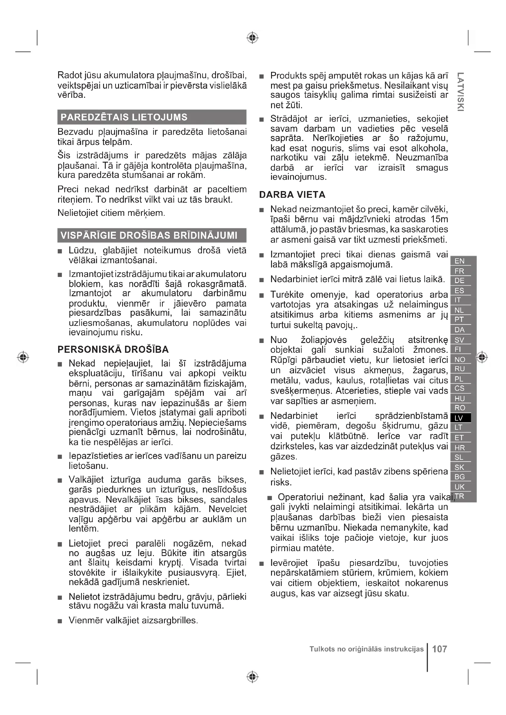 IERĪČU LIETOŠANA UN KOPŠANA ■ Izlasiet, izprotiet un vienmēr ievērojiet akumulatora un lādētāja komplektā iekļautos drošības norādījumus. Pretējā gadījumā varat izraisīt elektrošoku, aizdegšanos vai citas bīstamas situācijas. Visas instrukcijas glabājiet drošā vietā turpmākām uzziņām. ■ Ar akumulatoru darbināmas ierīces nav jāpievieno elektriskajai kontaktligzdai, tāpēc tās vienmēr ir darba kārtībā. Noņemiet izolatora atslēgu, kad nedarbiniet preci. ■ Izņemiet akumulatoru pirms regulēšanas, tīrīšanas vai objektu izņemšanas no ierīces. ■ Pirms akumulatora ievietošanas slēdža atslēga noteikti jāizņem. ■ Akumulators jālādē tikai ar ražotāja noteikto lādētāju. Lādētāja lietošana ar nesaderīgu akumulatoru var izraisīt ugunsgrēka risku. Akumulatora uzlādēšanai lietojiet tikai nosaukto tipu lādētāju. ■ Lietojiet tikai konkrētajai ierīcei paredzēto akumulatoru. Jebkura cita akumulatora lietošana var radīt ugunsgrēka, elektriskā trieciena vai ievainojumu risku. ■ Kad nelietojat akumulatoru, neturiet to citu metāla priekšmetu tuvumā, piemēram: papīra saspraudes, monētas, atslēgas, naglas, skrūves vai citi sīki metāla priekšmeti, kas var veidot savienojumu starp spailēm. Savienojot bateriju paketes terminālus, var rasties dzirksteles, apdegumi, aizdegšanās vai eksplozija. ■ Nenovietojiet akumulatoru izstrādājumus vai to akumulatorus uguns vai karstuma avotu tuvumā. Tas palielina eksplozijas un miesas bojājumu gūšanas risku. ■ Neatveriet un neizjauciet akumulatoru. Izliets elektrolīts ir korodējošs un var radīt bojājumus acīm vai ādai. Norijot tas ir toksisks. ■ Sargājiet akumulatoru no mitruma un ūdens. Nelādējiet akumulatoru mitrā vietā. Šī noteikuma ievērošana samazinās elektrotraumu risku. ■ Akumulatora bojājuma un nepareizas lietošanas gadījumā var izdalīties tvaiks. Nodrošiniet svaigu gaisu un sūdzību gadījumā lūdziet medicīnisku palīdzību. Tvaiks var kairināt elpošanas sistēmu. ■ Neatstājiet bateriju paketi transportlīdzeklī karstos vai aukstos laikapstākļos. ■ Nesadedziniet akumulatoru. ■ Nepareizas rīcības gadījumā no akumulatora var izkļūt šķidrums; izvairieties no saskares ar to. Nejaušas saskares gadījumā skalojiet skarto vietu ar ūdeni. Ja šķidrums iekļūst acīs, nekavējoties meklējiet medicīnisko palīdzību. No akumulatora izkļuvušais šķidrums var izraisīt kairinājumu vai apdegumus. ZĀLES PĻĀVĒJA DROŠĪBAS