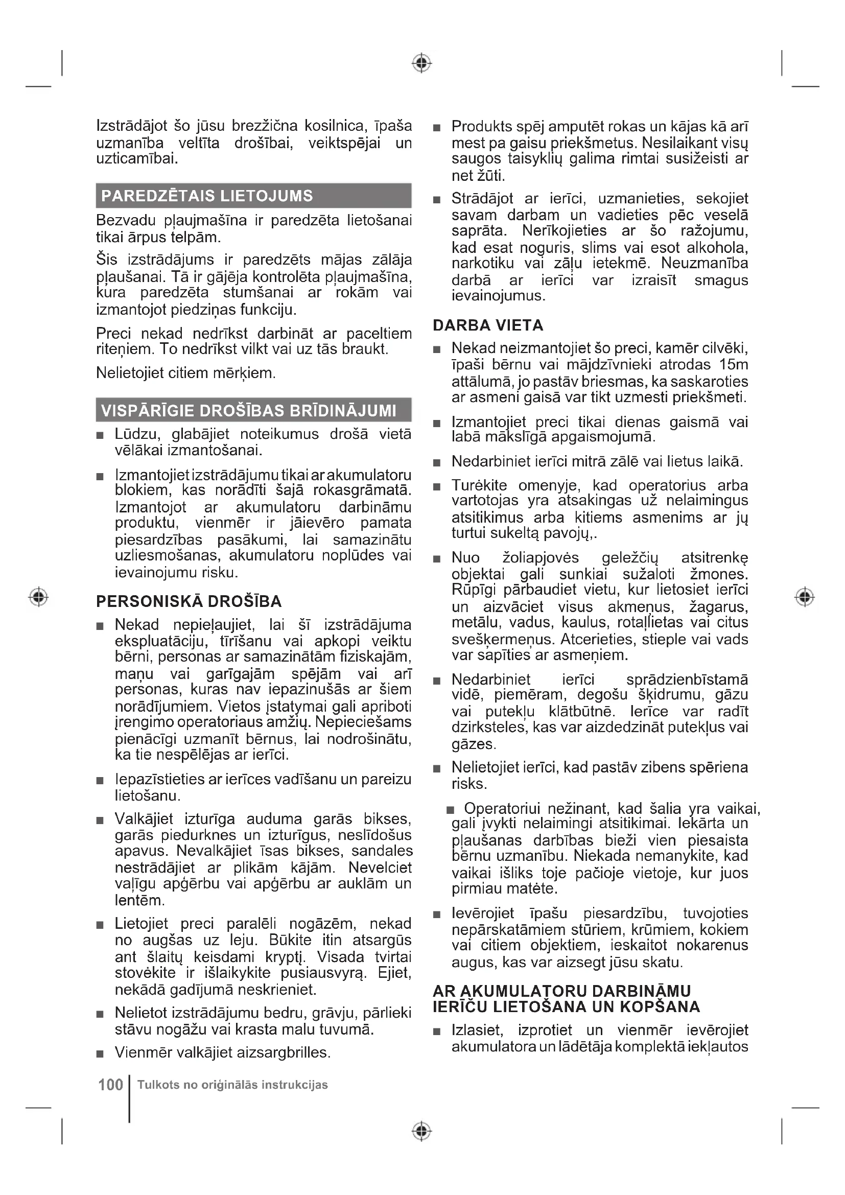 drošības norādījumus. Pretējā gadījumā varat izraisīt elektrošoku, aizdegšanos vai citas bīstamas situācijas. Visas instrukcijas glabājiet drošā vietā turpmākām uzziņām. ■ Ar akumulatoru darbināmas ierīces nav jāpievieno elektriskajai kontaktligzdai, tāpēc tās vienmēr ir darba kārtībā. Noņemiet izolatora atslēgu, kad nedarbiniet preci. ■ Izņemiet akumulatoru pirms regulēšanas, tīrīšanas vai objektu izņemšanas no ierīces. ■ Pirms akumulatora ievietošanas slēdža atslēga noteikti jāizņem. ■ Akumulators jālādē tikai ar ražotāja noteikto lādētāju. Lādētāja lietošana ar nesaderīgu akumulatoru var izraisīt ugunsgrēka risku. Akumulatora uzlādēšanai lietojiet tikai nosaukto tipu lādētāju. ■ Lietojiet tikai konkrētajai ierīcei paredzēto akumulatoru. Jebkura cita akumulatora lietošana var radīt ugunsgrēka, elektriskā trieciena vai ievainojumu risku. ■ Kad nelietojat akumulatoru, neturiet to citu metāla priekšmetu tuvumā, piemēram: papīra saspraudes, monētas, atslēgas, naglas, skrūves vai citi sīki metāla priekšmeti, kas var veidot savienojumu starp spailēm. Savienojot bateriju paketes terminālus, var rasties dzirksteles, apdegumi, aizdegšanās vai eksplozija. ■ Nenovietojiet akumulatoru izstrādājumus vai to akumulatorus uguns vai karstuma avotu tuvumā. Tas palielina eksplozijas un miesas bojājumu gūšanas risku. ■ Neatveriet un neizjauciet akumulatoru. Izliets elektrolīts ir korodējošs un var radīt bojājumus acīm vai ādai. Norijot tas ir toksisks. ■ Sargājiet akumulatoru no mitruma un ūdens. Nelādējiet akumulatoru mitrā vietā. Šī noteikuma ievērošana samazinās elektrotraumu risku. ■ Akumulatora bojājuma un nepareizas lietošanas gadījumā var izdalīties tvaiks. Nodrošiniet svaigu gaisu un sūdzību gadījumā lūdziet medicīnisku palīdzību. Tvaiks var kairināt elpošanas sistēmu. ■ Neatstājiet bateriju paketi transportlīdzeklī karstos vai aukstos laikapstākļos. ■ Nesadedziniet akumulatoru. ■ Nepareizas rīcības gadījumā no akumulatora var izkļūt šķidrums; izvairieties no saskares ar to. Nejaušas saskares gadījumā skalojiet skarto vietu ar ūdeni. Ja šķidrums iekļūst acīs, nekavējoties meklējiet medicīnisko palīdzību. No akumulatora izkļuvušais šķidrums var izraisīt kairinājumu vai apdegumus. ZĀLES PĻĀVĒJA DROŠĪBAS