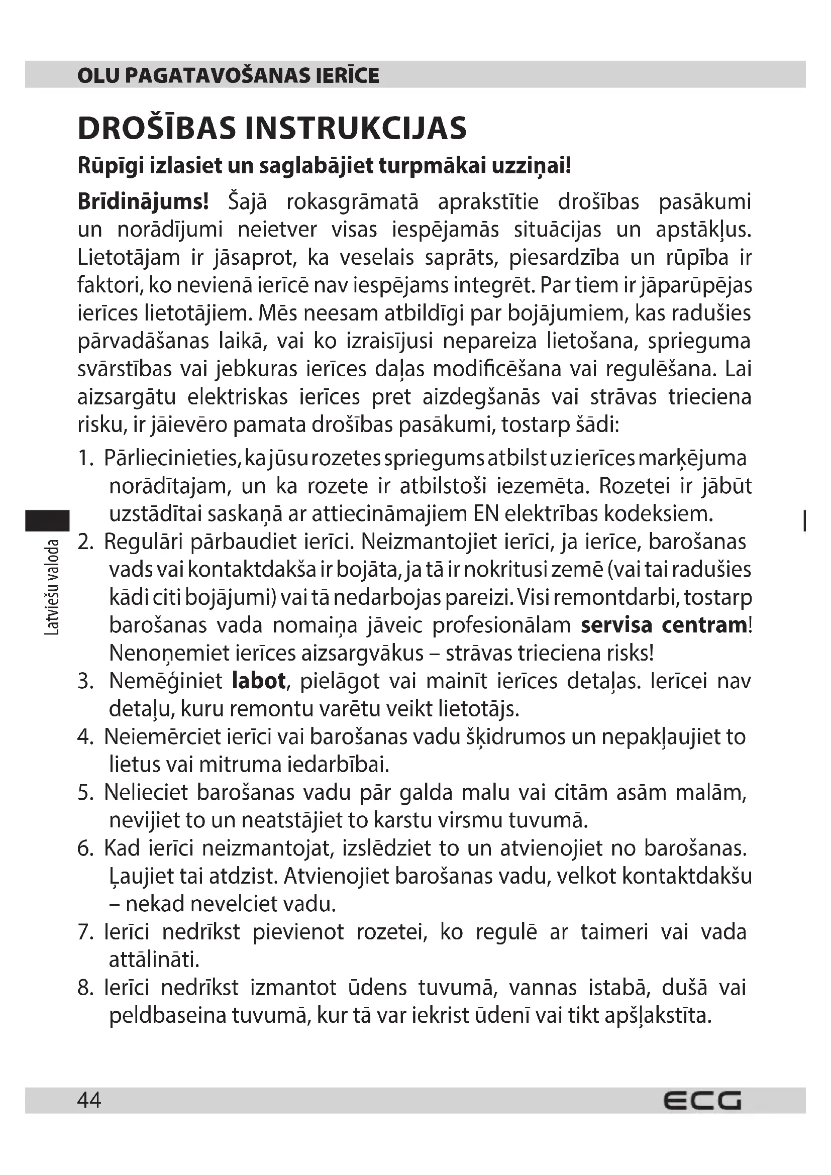 Ietinamais papīrs un kartons – nogādāt pārstrādes punktā. Iepakojuma folija, PE maisi, plastmasas daļas – iemest plastmasas šķirošanas konteineros. ATBRĪVOŠANĀS NO IERĪCĒM KALPOŠANAS LAIKA BEIGĀS Atbrīvošanās no elektriska un elektroniska aprīkojuma (attiecas uz ES dalībvalstīm un citām Eiropas valstīm, kur ieviesta pārstrādes sistēma) Norādītais simbols uz ierīces vai iepakojuma nozīmē, ka ierīci nedrīkst pievienot sadzīves atkritumiem. Nododiet ierīci norādītajā elektriska un elektroniska aprīkojuma pārstrādes punktā. Novērsiet negatīvu ietekmi uz veselību un vidi, parūpējoties par ierīces pareizu pārstrādi. Pārstrāde palīdz taupīt dabas resursus. Lai saņemtu plašāku informāciju par šīs ierīces pārstrādi, sazinieties ar vietējo atbildīgo iestādi, sadzīves atkritumu apstrādes organizāciju vai veikalu, kur ierīci iegādājāties. Šī ierīce atbilst ES direktīvu prasībām par elektromagnētisko saderību un elektrisko drošību. Lietošanas pamācība ir pieejama vietnē www.ecg-electro.eu. Tiek paturētas tiesības veikt teksta un tehnisko parametru izmaiņas. 08/05Lietuvių kalba Lietuvių kalba