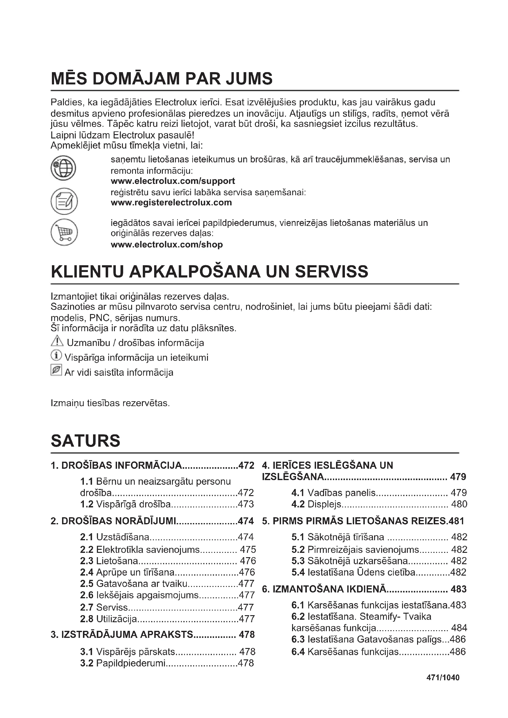 Izmantojiet tikai oriģinālas rezerves daļas. Sazinoties ar mūsu pilnvaroto servisa centru, nodrošiniet, lai jums būtu pieejami šādi dati: modelis, PNC, sērijas numurs. Šī informācija ir norādīta uz datu plāksnītes. Uzmanību / drošības informācija Vispārīga informācija un ieteikumi Ar vidi saistīta informācija Izmaiņu tiesības rezervētas. SATURS