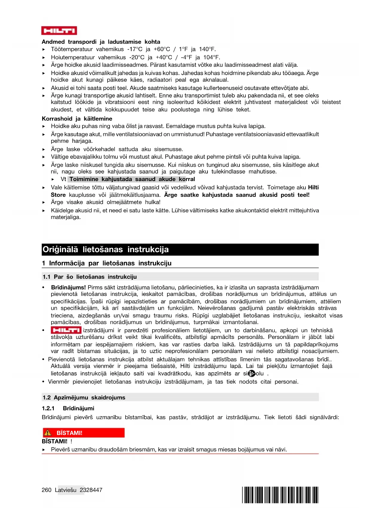 PM 20CG A12 ▶ Ievērojiet turpmāk izklāstītos drošības norādījumus, lai litija jonu akumulatoru lietošana neradītu apdraudējumu. Norādījumu neievērošana var izraisīt ādas kairinājumu, smagas korozīvas traumas, ķīmiskos apdegumus, ugunsgrēku vai eksploziju. ▶ Lietojiet akumulatorus tikai tad, ja tie ir nevainojamā tehniskajā stāvoklī. ▶ Rīkojieties ar akumulatoriem uzmanīgi, lai pasargātu tos no bojājumiem un nepieļautu veselībai ļoti kaitīgu šķidrumu izplūdi! ▶ Nekādā gadījumā nedrīkst veikt akumulatoru pārveidi vai citas neatļautas manipulācijas! ▶ Akumulatorus nedrīkst izjaukt, saspiest, sakarsēt virs 80 °C vai sadedzināt. ▶ Nelietojiet un nemēģiniet uzlādēt akumulatorus, kas bijuši pakļauti triecieniem vai ir bojāti citā veidā. Regulāri pārbaudiet, vai akumulatoriem nav konstatējamas bojājumu pazīmes. ▶ Nekādā gadījumā nelietojiet atjaunotus vai remontētus akumulatorus. ▶ Nekādā gadījumā nelietojiet akumulatoru vai ar akumulatoru darbināmu elektroiekārtu kā instrumentu sišanai. ▶ Nekādā gadījumā nepakļaujiet akumulatorus tiešiem saules stariem, augstai temperatūrai, dzirkstelēm vai atklātai liesmai. Tas var izraisīt eksploziju. ▶ Nepieskarieties bateriju poliem ar pirkstiem vai instrumentiem un nepieļaujiet, ka tie nonāk saskarē ar rotaslietām vai citiem priekšmetiem, kam piemīt elektriskā vadītspēja. Tas var izraisīt akumulatoru bojājumus, kā arī materiālu kaitējumu un traumas. ▶ Sargājiet akumulatorus no lietus un mitruma un šķidrumiem. Mitruma iekļūšana var izraisīt īssavienojumu, elektrisko triecienu, apdegumus, ugunsgrēku un eksploziju. ▶ Lietojiet kopā ar akumulatoru tikai tā tipam paredzētos lādētājus un elektroiekārtas. Ievērojiet attiecīgo lietošanas instrukciju norādījumus. ▶ Nelietojiet un neuzglabājiet akumulatoru sprādzienbīstamā vidē.. ▶ Ja akumulators kļūst pārāk karsts, iespējams, ka tas ir bojāts. Novietojiet akumulatoru labi pārredzamā, ugunsdrošā vietā, pietiekamā atstatumā no degošiem materiāliem. Ļaujiet akumulatoram atdzist. Ja pēc stundas akumulators joprojām ir tik karsts, ka to ir grūti satvert, tas nozīmē, ka tas ir bojāts. Vērsieties servisā Hilti vai izlasiet dokumentu "Norādījumi par Hilti litija jonu akumulatoru drošību un lietošanu". Ievērojiet īpašos norādījumus, kas attiecas uz litija jonu akumulatoru transportēšanu, uzglabāšanu un lietošanu. → Lappuse 278 Izlasiet Norādījumus par Hiltilitija jonu akumulatorudrošību unlietošanu, kasir pieejami, noskenējot QR kodu šīs lietošanas instrukcijas beigās.*2328447* 2328447 Latviešu 265
