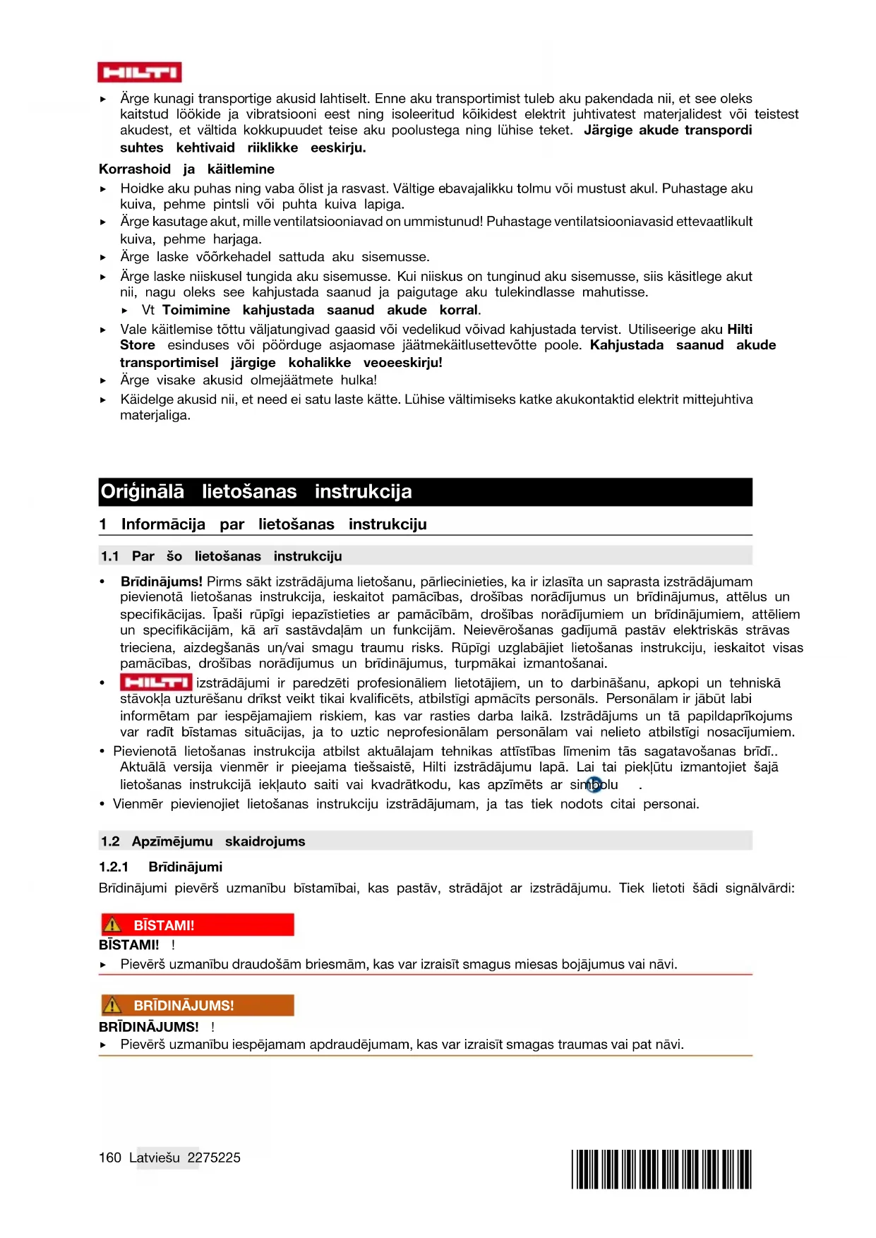 11 Ražotāja garantija ▶ Ar jautājumiem par garantijas nosacījumiem, lūdzu, vērsieties pie vietējā Hilti partnera. 12 Papildu informācija C 6-22 (01)168 Latviešu 2275225 *2275225* RoHS (direktīva par bīstamo vielu izmantošanas ierobežošanu) Šī tabula attiecas uz Ķīnas tirgu.*2275225* 2275225 Latviešu 169 Šī tabula attiecas uz Taivānas tirgu. C 8-22 (01)170 Latviešu 2275225 *2275225* RoHS (direktīva par bīstamo vielu izmantošanas ierobežošanu) Šī tabula attiecas uz Ķīnas tirgu.*2275225* 2275225 Latviešu 171 Šī tabula attiecas uz Taivānas tirgu. 13 Hilti litija jonu akumulatori Norādījumi par drošību un lietošanu Šajā dokumentācijā ar jēdzienu "akumulators" tiek apzīmēti daudzreiz uzlādējami Hilti litija jonu akumulatori, kas sastāv no vairākiem litija jonu elementiem. Tie ir paredzēti Hilti elektroiekārtām, un tos drīkst lietot tikai kopā ar tām. Lietojiet tikai oriģinālos Hilti akumulatorus! Apraksts Hilti akumulatori ir aprīkoti ar elementu kontroles un elementu aizsardzības sistēmām. Akumulatorus veidojošie elementi satur enerģiju akumulējošus litija jonu materiālus, kas nodrošina lielu specifisko enerģijas blīvumu. Litija jonu elementiem piemīt ļoti neliels atmiņas efekts, taču tie ļoti jutīgi reaģē uz spēka iedarbību, pārmērīgu izlādi vai augstu temperatūru. Izstrādājumus, ko atļauts lietot kopā ar Hilti akumulatoriem, jūs atradīsiet Hilti Store vai tīmekļvietnē: www.hilti.group Drošība ▶ Ievērojiet turpmāk izklāstītos drošības norādījumus, lai litija jonu akumulatoru lietošana neradītu apdraudējumu. Norādījumu neievērošana var izraisīt ādas kairinājumu, smagas korozīvas traumas, ķīmiskos apdegumus, ugunsgrēku vai eksploziju. ▶ Rīkojieties ar akumulatoriem uzmanīgi, lai pasargātu tos no bojājumiem un nepieļautu veselībai ļoti kaitīgu šķidrumu izplūdi! ▶ Nekādā gadījumā nedrīkst veikt akumulatoru pārveidi vai citas neatļautas manipulācijas! ▶ Akumulatorus nedrīkst izjaukt, saspiest, sakarsēt virs 80 °C vai sadedzināt. ▶ Nelietojiet un nemēģiniet uzlādēt akumulatorus, kas bijuši pakļauti triecieniem vai ir bojāti citā veidā. Regulāri pārbaudiet, vai akumulatoriem nav konstatējamas bojājumu pazīmes.172 Latviešu 2275225 *2275225* ▶ Nekādā gadījumā nelietojiet atjaunotus vai remontētus akumulatorus. ▶ Nekādā gadījumā nelietojiet akumulatoru vai ar akumulatoru darbināmu elektroiekārtu kā instrumentu sišanai. ▶ Nekādā gadījumā nepakļaujiet akumulatorus tiešiem saules stariem, augstai temperatūrai, dzirkstelēm vai atklātai liesmai. Tas var izraisīt eksploziju. ▶ Nepieskarieties bateriju poliem ar pirkstiem vai instrumentiem un nepieļaujiet, ka tie nonāk saskarē ar rotaslietām vai citiem priekšmetiem, kam piemīt elektriskā vadītspēja. Tas var izraisīt akumulatoru bojājumus, kā arī materiālu kaitējumu un traumas. ▶ Sargājiet akumulatorus no lietus un mitruma un šķidrumiem. Mitruma iekļūšana var izraisīt īssavienojumu, elektrisko triecienu, apdegumus, ugunsgrēku un eksploziju. ▶ Lietojiet kopā ar akumulatoru tikai tā tipam paredzētos lādētājus un elektroiekārtas. Ievērojiet attiecīgo lietošanas instrukciju norādījumus. ▶ Nelietojiet un neuzglabājiet akumulatoru sprādzienbīstamā vidē.. ▶ Ja akumulators kļūst pārāk karsts, iespējams, ka tas ir bojāts. Novietojiet akumulatoru labi pārredzamā, ugunsdrošā vietā, pietiekamā atstatumā no degošiem materiāliem. Ļaujiet akumulatoram atdzist. Ja pēc stundas akumulators joprojām ir tik karsts, ka to ir grūti satvert, tas nozīmē, ka tas ir bojāts. Rīkojieties saskaņā ar norādījumiem, kas iekļauti nodaļā Pasākumi akumulatora aizdegšanās gadījumā. Rīcība akumulatoru bojājumu gadījumā ▶ Ja akumulators ir bojāts, vienmēr sazinieties ar Hilti servisu. ▶ Nelietojiet akumulatoru, ja no tā izplūst šķidrums. ▶ Šķidruma izplūdes gadījumā nepieļaujiet tā iekļūšanu acīs un/vai saskari ar ādu. Rīkojoties ar elektrolītu, vienmēr valkājiet aizsargcimdus un acu aizsarglīdzekļus. ▶ No baterijām izplūdušā elektrolīta savākšanai lietojiet šim nolūkam paredzētu, sertificētu ķīmisko tīrīšanas līdzekli. Ievērojiet vietējos noteikumus par akumulatoru elektrolīta savākšanu.