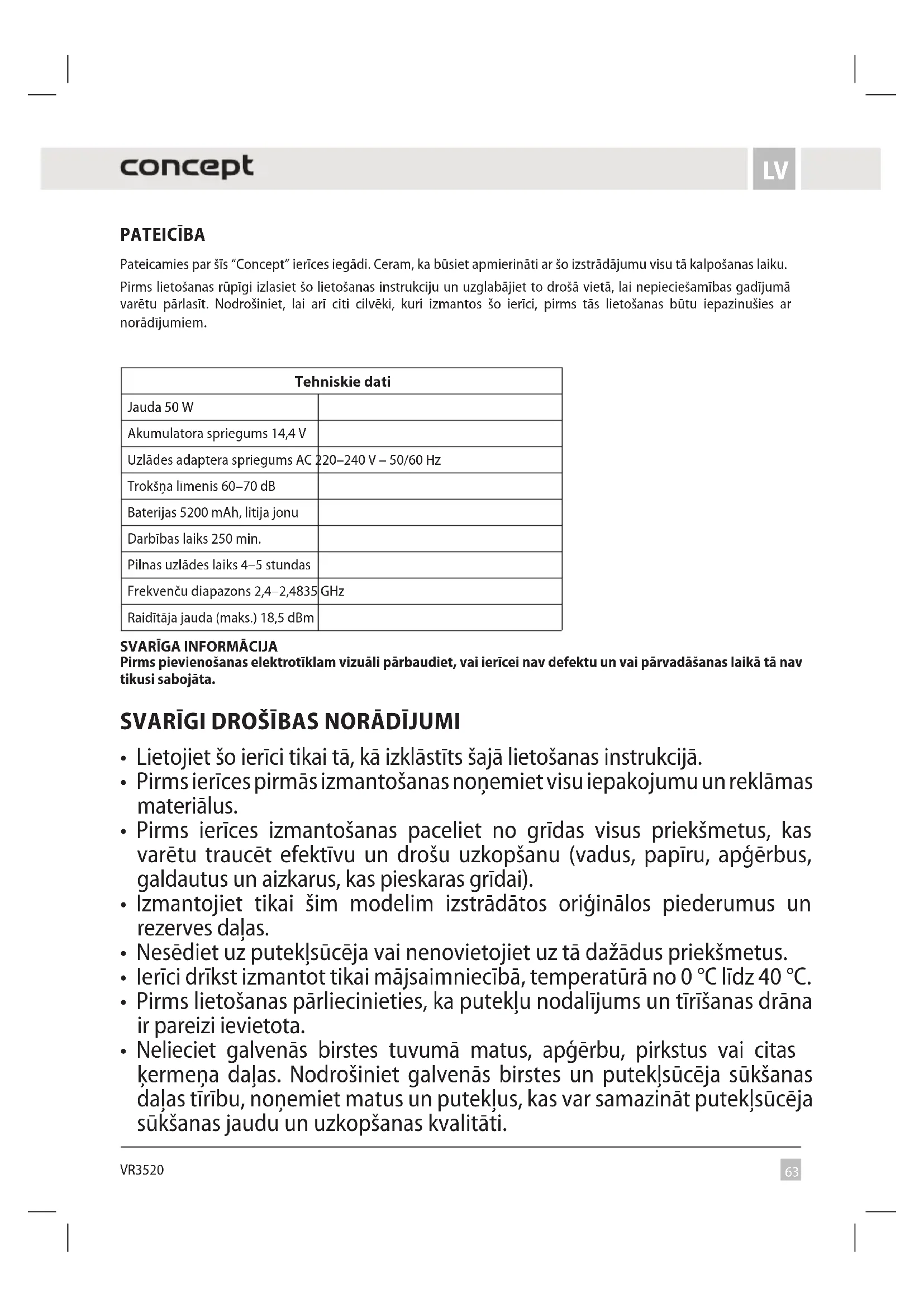 VR3520 PATEICĪBA Pateicamies par šīs “Concept” ierīces iegādi. Ceram, ka būsiet apmierināti ar šo izstrādājumu visu tā kalpošanas laiku. Pirms lietošanas rūpīgi izlasiet šo lietošanas instrukciju un uzglabājiet to drošā vietā, lai nepieciešamības gadījumā varētu pārlasīt. Nodrošiniet, lai arī citi cilvēki, kuri izmantos šo ierīci, pirms tās lietošanas būtu iepazinušies ar norādījumiem. Tehniskie dati Jauda 50W Akumulatora spriegums 14,4V Uzlādes adaptera spriegums AC220–240V – 50/60Hz Trokšņa līmenis 60–70dB Baterijas 5200mAh, litija jonu Darbības laiks 250 min. Pilnas uzlādes laiks 4–5stundas Frekvenču diapazons 2,4–2,4835GHz Raidītāja jauda (maks.) 18,5dBm