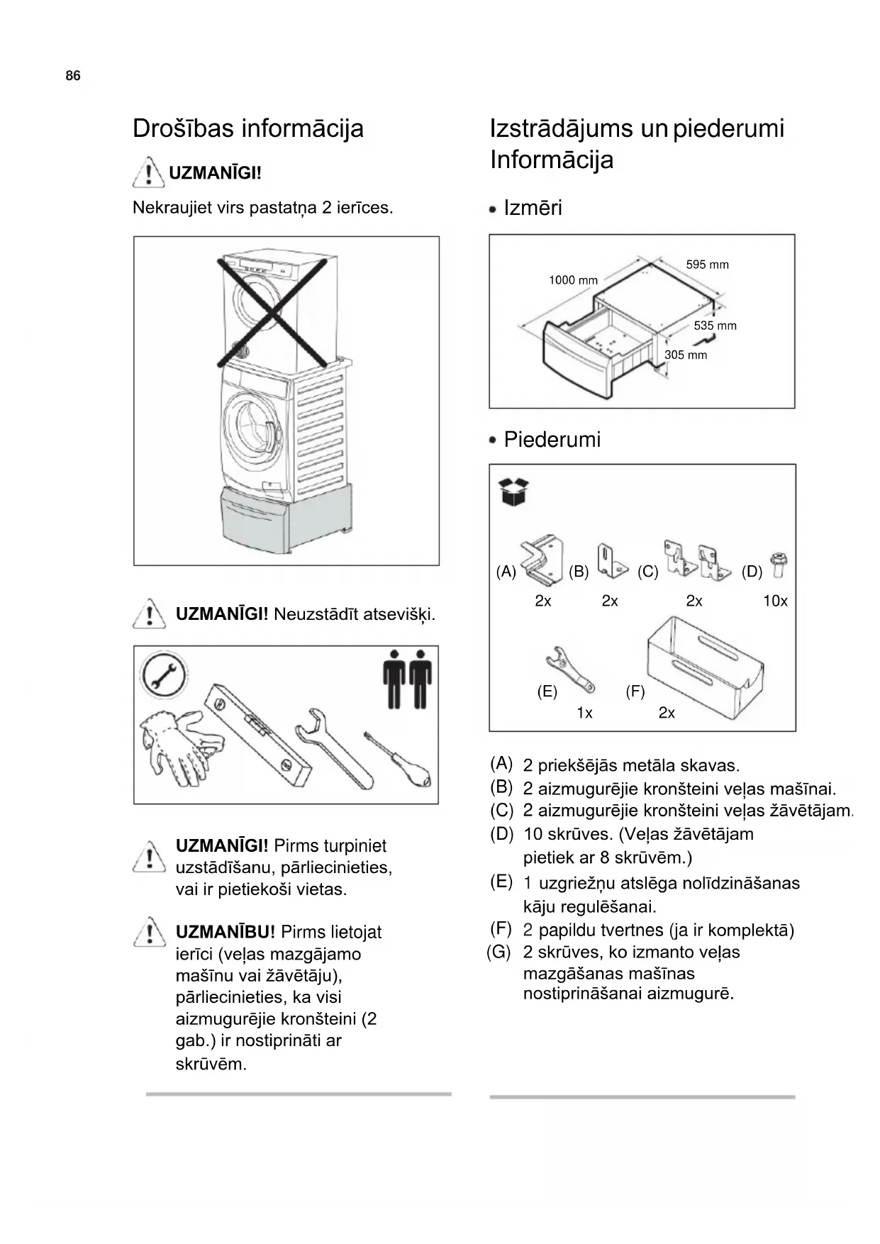 UZMANĪGI! Pirms turpiniet uzstādīšanu, pārliecinieties, vai ir pietiekoši vietas. UZMANĪBU! Pirms lietojat ierīci (veļas mazgājamo mašīnu vai žāvētāju), pārliecinieties, ka visi aizmugurējie kronšteini (2 gab.) ir nostiprināti ar skrūvēm. (A) (B) (C) (D) (E) (F) (G) 2 priekšējās metāla skavas. 2 aizmugurējie kronšteini veļas mašīnai. 2 aizmugurējie kronšteini veļas žāvētājam. 10 skrūves. (Veļas žāvētājam pietiek ar 8 skrūvēm.) uzgriežņu atslēga nolīdzināšanas kāju regulēšanai. papildu tvertnes (ja ir komplektā) 2 skrūves, ko izmanto veļas mazgāšanas mašīnas nostiprināšanai aizmugurē.