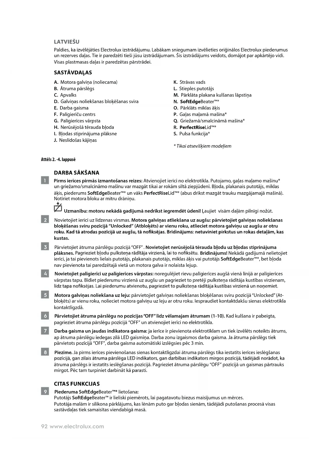 1 Pirms ierīces pirmās izmantošanas reizes: Atvienojiet ierīci no elektrotīkla. Putojamo, gaļas maļamo mašīnu* un griežamo/smalcināmo mašīnu var mazgāt tikai ar rokām siltā ziepjūdenī. Bļoda, plakanais putotājs, mīklas āķis, piederums SoftEdgeBeater™* un vāks PerfectRiseLid™* (abus drīkst mazgāt trauku mazgājamajā mašīnā). Notīriet motora bloku ar mitru drāniņu. Uzmanību: motoru nekādā gadījumā nedrīkst iegremdēt ūdenī! Ļaujiet visām daļām pilnīgi nožūt. 2 Novietojiet ierīci uz līdzenas virsmas. Motora galviņas atliekšana uz augšu: pārvietojiet galviņas noliekšanas bloķēšanas sviru pozīcijā “Unlocked” (Atbloķēts) ar vienu roku, atlieciet motora galviņu uz augšu ar otru kustas. 3 Pārvietojiet ātruma pārslēgu pozīcijā “OFF” . Novietojiet nerūsējošā tērauda bļodu uz bļodas stiprinājuma plāksnes. Brīdinājums! Nekādā gadījumā nelietojiet ierīci, ja tai pievienots lielais putotājs, plakanais putotājs, mīklas āķis vai putotājs SoftEdgeBeater™*, bet bļoda nav pievienota tai paredzētajā vietā un motora galva ir nolaista lejup. 4 Novietojiet palīgierīci uz palīgierīces vārpstas: noregulējiet rievu palīgierīces augšā vienā līnijā ar palīgierīces vārpstas tapu. Bīdiet piederumu virzienā uz augšu un pagrieziet to pretēji pulksteņa rādītāja kustības virzienam, 5 Motora galviņas noliekšana uz leju: pārvietojiet galviņas noliekšanas bloķēšanas sviru pozīcijā “Unlocked” (At- bloķēts) ar vienu roku, nolieciet motora galviņu uz leju ar otru roku. Iespraudiet kontaktdakšu sienas elektrotīkla kontaktligzdā. 6 Pārvietojiet ātruma pārslēgu no pozīcijas “OFF” līdz vēlamajam ātrumam (1-10). Kad kulšana ir pabeigta, pagrieziet ātruma pārslēgu pozīcijā “OFF” un atvienojiet ierīci no elektrotīkla. 7 Darba gaisma un jaudas indikatora gaisma: ja ierīce ir pievienota elektrotīklam un tiek izvēlēts noteikts ātrums, ap ātruma pārslēgu iedegas zilā LED gaismiņa. Darba zonu izgaismos darba gaisma. Ja ātruma pārslēgs tiek pārvietots pozīcijā “OFF”, darba gaisma automātiski izslēgsies pēc 3 min. 8 Piezīme. Ja pirms ierīces pievienošanas sienas kontaktligzdai ātruma pārslēgs tika iestatīts ierīces ieslēgšanas ātruma pārslēgs ir iestatīts ieslēgšanas pozīcijā. Pagrieziet ātruma pārslēgu “OFF” pozīcijā un gaismas pārtrauks mirgot. Pēc tam turpiniet darbināt kā parasti. CITAS FUNKCIJAS 9 Piederuma SoftEdgeBeater™* lietošana: Putotājs SoftEdgeBeater™ ir lieliski piemērots, lai pagatavotu biezus maisījumus un mērces. Putotāja malām ir silikona pārklājums, kas lēnām puto gar bļodas sienām, tādējādi putošanas procesā visas sastāvdaļas tiek samaisītas viendabīgā masā.93www.electrolux.com