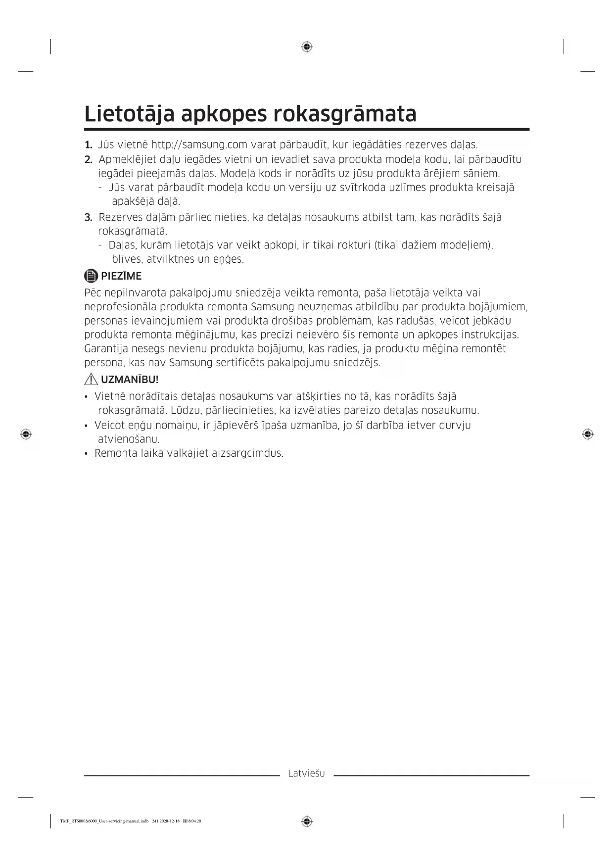 rokasgrāmatā. - Daļas, kurām lietotājs var veikt apkopi, ir tikai rokturi (tikai dažiem modeļiem), blīves, atvilktnes un eņģes. PIEZĪME Pēc nepilnvarota pakalpojumu sniedzēja veikta remonta, paša lietotāja veikta vai neprofesionāla produkta remonta Samsung neuzņemas atbildību par produkta bojājumiem, personas ievainojumiem vai produkta drošības problēmām, kas radušās, veicot jebkādu produkta remonta mēģinājumu, kas precīzi neievēro šīs remonta un apkopes instrukcijas. Garantija nesegs nevienu produkta bojājumu, kas radies, ja produktu mēģina remontēt persona, kas nav Samsung sertificēts pakalpojumu sniedzējs. UZMANĪBU!