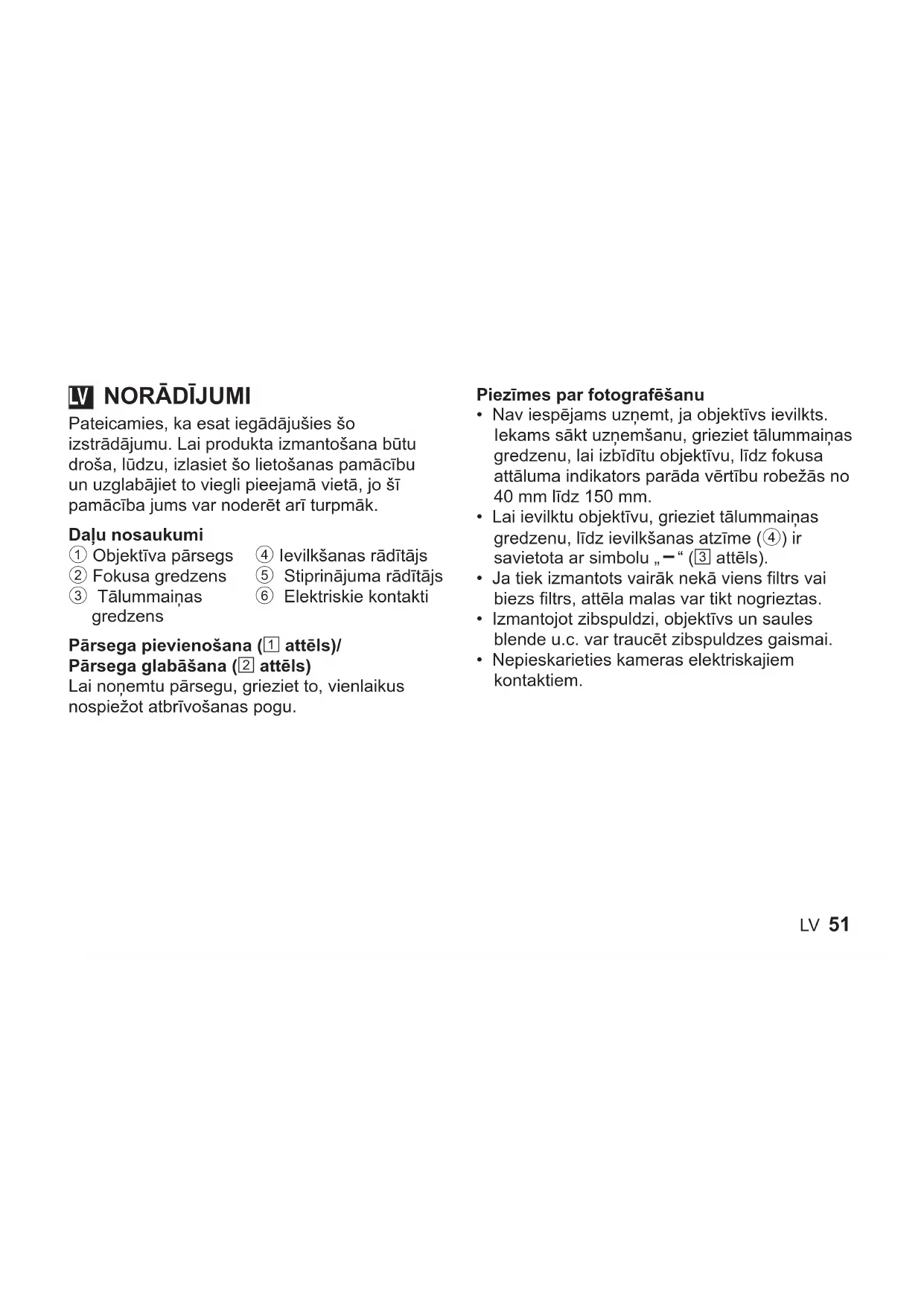 Pateicamies, ka esat iegādājušies šo izstrādājumu. Lai produkta izmantošana būtu droša, lūdzu, izlasiet šo lietošanas pamācību un uzglabājiet to viegli pieejamā vietā, jo šī pamācība jums var noderēt arī turpmāk. Daļunosaukumi 1 Objektīva pārsegs 2 Fokusa gredzens 3 Tālummaiņas gredzens 4 Ievilkšanas rādītājs 5 Stiprinājuma rādītājs 6 Elektriskie kontakti Pārsegapievienošana(1attēls)/ Pārsegaglabāšana(2attēls) Lai noņemtu pārsegu, grieziet to, vienlaikus nospiežot atbrīvošanas pogu. Piezīmesparfotografēšanu
