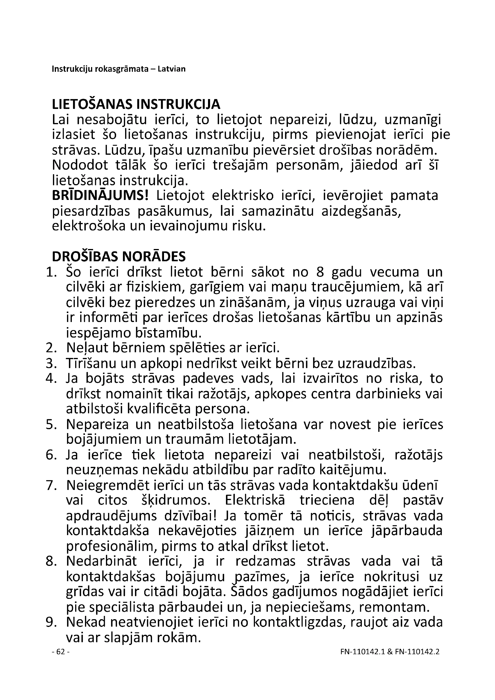 Lai nesabojātu ierīci, to lietojot nepareizi, lūdzu, uzmanīgi izlasiet šo lietošanas instrukciju, pirms pievienojat ierīci pie strāvas. Lūdzu, īpašu uzmanību pievērsiet drošības norādēm. Nododot tālāk šo ierīci trešajām personām, jāiedod arī šī lietošanas instrukcija. BRĪDINĀJUMS! Lietojot elektrisko ierīci, ievērojiet pamata piesardzības pasākumus, lai samazinātu aizdegšanās, elektrošoka un ievainojumu risku.