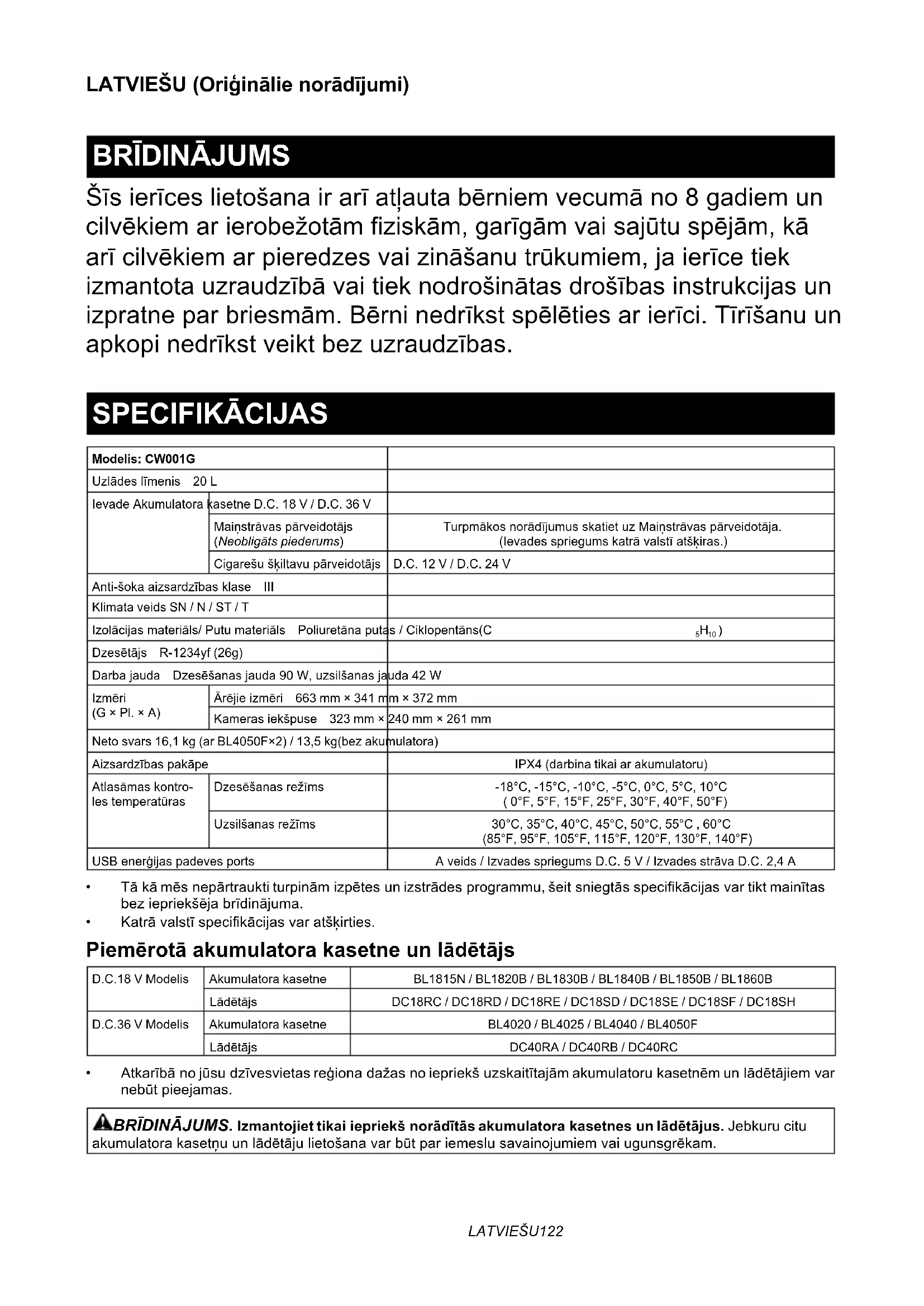 Šīsierīceslietošanairarīatļautabērniemvecumāno8gadiemun cilvēkiemarierobežotāmziskām,garīgāmvaisajūtuspējām,kā arīcilvēkiemarpieredzesvaizināšanutrūkumiem,jaierīcetiek izmantotauzraudzībāvaitieknodrošinātasdrošībasinstrukcijasun izpratneparbriesmām.Bērninedrīkstspēlētiesarierīci.Tīrīšanuun apkopinedrīkstveiktbezuzraudzības. SPECIFIKĀCIJAS Modelis: CW001GUzlādeslīmenis 20 LIevade Akumulatora kasetne D.C. 18 V / D.C. 36 VMaiņstrāvaspārveidotājs (Neobligāts piederums)TurpmākosnorādījumusskatietuzMaiņstrāvaspārveidotāja.(Ievadesspriegumskatrāvalstīatšķiras.)Cigarešušķiltavupārveidotājs D.C. 12 V / D.C. 24 VAnti-šokaaizsardzībasklase IIIKlimata veids SN / N / ST / TIzolācijasmateriāls/Putumateriāls Poliuretānaputas/Ciklopentāns(C