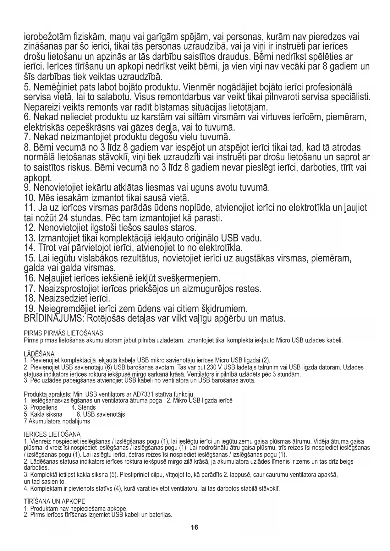 Apkārtējās vides aizsardzība. Kartona iepakojumu, lūdzu, nododiet otreizējai pārstrādei. Polietilēna maisiņus (PE) izmest plastmasas izstrādājumiem paredzētajos konteineros. Lietotās elektropreces nododiet attiecīgajos pieņemšanas punktos. Ierīcē satur bīstamas sastāvdaļas, kas var izraisīt draudus apkārtējai videi. Elektroierīce jānodod tā, lai ierobežotu tās atkārtotu izmantošanu. Ja ierīcē atrodas baterijas, izņemiet tās un nododiet pieņemšanas punktā atsevišķi. Produktu neizmest sadzīves atkritumu konteinerā! 3. Tīrīšanai izmantojiet tikai sausu un mīkstu drānu. Nelietojiet tīrīšanas līdzekļus un ķimikālijas. Lai noņemtu putekļus no restēm, laiku pa laikam var noslaucīt ar suku.