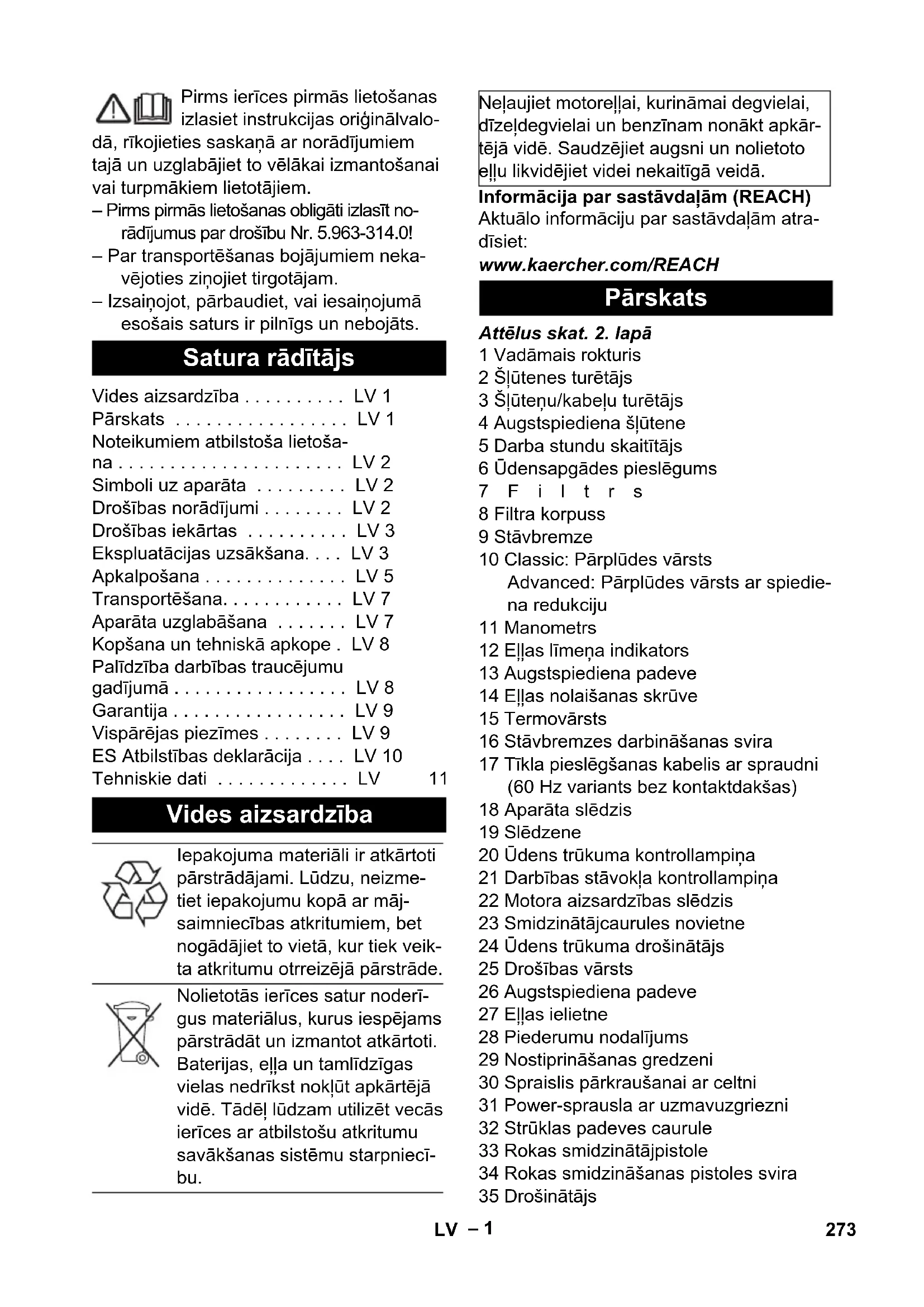 dB (A) 101 Erandi põhjus vastavalt määrusele (EL) 2019/1781 lisa I peatükile 2 (12): j) 272 ET– 1 Pirms ierīces pirmās lietošanas izlasiet instrukcijas oriģinālvalo- dā, rīkojieties saskaņā ar norādījumiem tajā un uzglabājiet to vēlākai izmantošanai vai turpmākiem lietotājiem. – Pirms pirmās lietošanas obligāti izlasīt no- rādījumus par drošību Nr. 5.963-314.0! – Par transportēšanas bojājumiem neka- vējoties ziņojiet tirgotājam. – Izsaiņojot, pārbaudiet, vai iesaiņojumā esošais saturs ir pilnīgs un nebojāts. Informācija par sastāvdaļām (REACH) Aktuālo informāciju par sastāvdaļām atra- dīsiet: www.kaercher.com/REACH Attēlus skat. 2. lapā 1 Vadāmais rokturis 2 Šļūtenes turētājs 3 Šļūteņu/kabeļu turētājs 4 Augstspiediena šļūtene 5 Darba stundu skaitītājs 6 Ūdensapgādes pieslēgums 7Filtrs 8 Filtra korpuss 9 Stāvbremze 10 Classic: Pārplūdes vārsts Advanced: Pārplūdes vārsts ar spiedie- na redukciju 11 Manometrs 12 Eļļas līmeņa indikators 13 Augstspiediena padeve 14 Eļļas nolaišanas skrūve 15 Termovārsts 16 Stāvbremzes darbināšanas svira 17 Tīkla pieslēgšanas kabelis ar spraudni (60 Hz variants bez kontaktdakšas) 18 Aparāta slēdzis 19 Slēdzene 20 Ūdens trūkuma kontrollampiņa 21 Darbības stāvokļa kontrollampiņa 22 Motora aizsardzības slēdzis 23 Smidzinātājcaurules novietne 24 Ūdens trūkuma drošinātājs 25 Drošības vārsts 26 Augstspiediena padeve 27 Eļļas ielietne 28 Piederumu nodalījums 29 Nostiprināšanas gredzeni 30 Spraislis pārkraušanai ar celtni 31 Power-sprausla ar uzmavuzgriezni 32 Strūklas padeves caurule 33 Rokas smidzinātājpistole 34 Rokas smidzināšanas pistoles svira 35 Drošinātājs Satura rādītājs Vides aizsardzība . . . . . . . . . . LV 1 Pārskats . . . . . . . . . . . . . . . . . LV 1 Noteikumiem atbilstoša lietoša- na . . . . . . . . . . . . . . . . . . . . . . LV 2 Simboli uz aparāta . . . . . . . . . LV 2 Drošības norādījumi . . . . . . . . LV 2 Drošības iekārtas . . . . . . . . . . LV 3 Ekspluatācijas uzsākšana. . . . LV 3 Apkalpošana . . . . . . . . . . . . . . LV 5 Transportēšana. . . . . . . . . . . . LV 7 Aparāta uzglabāšana . . . . . . . LV 7 Kopšana un tehniskā apkope . LV 8 Palīdzība darbības traucējumu gadījumā . . . . . . . . . . . . . . . . . LV 8 Garantija . . . . . . . . . . . . . . . . . LV 9 Vispārējas piezīmes . . . . . . . . LV 9 ES Atbilstības deklarācija . . . . LV 10 Tehniskie dati . . . . . . . . . . . . . LV 11 Vides aizsardzība Iepakojuma materiāli ir atkārtoti pārstrādājami. Lūdzu, neizme- tiet iepakojumu kopā ar māj- saimniecības atkritumiem, bet nogādājiet to vietā, kur tiek veik- ta atkritumu otrreizējā pārstrāde. Nolietotās ierīces satur noderī- gus materiālus, kurus iespējams pārstrādāt un izmantot atkārtoti. Baterijas, eļļa un tamlīdzīgas vielas nedrīkst nokļūt apkārtējā vidē. Tādēļ lūdzam utilizēt vecās ierīces ar atbilstošu atkritumu savākšanas sistēmu starpniecī- bu. Neļaujiet motoreļļai, kurināmai degvielai, dīzeļdegvielai un benzīnam nonākt apkār- tējā vidē. Saudzējiet augsni un nolietoto eļļu likvidējiet videi nekaitīgā veidā. Pārskats 273LV– 2 – Tīrīšanas procesa vadības elementi ir dzelteni. – Apkopes un servisa vadības elementi ir gaiši pelēki. Izmantojiet augstspiediena mazgāšanas aparātu tikai un vienīgi: – iekārtu, transportlīdzekļu, būvju, instru- mentu tīrīšanai – ar Kärcher atļautajiem piederumiem, re- zerves daļām.