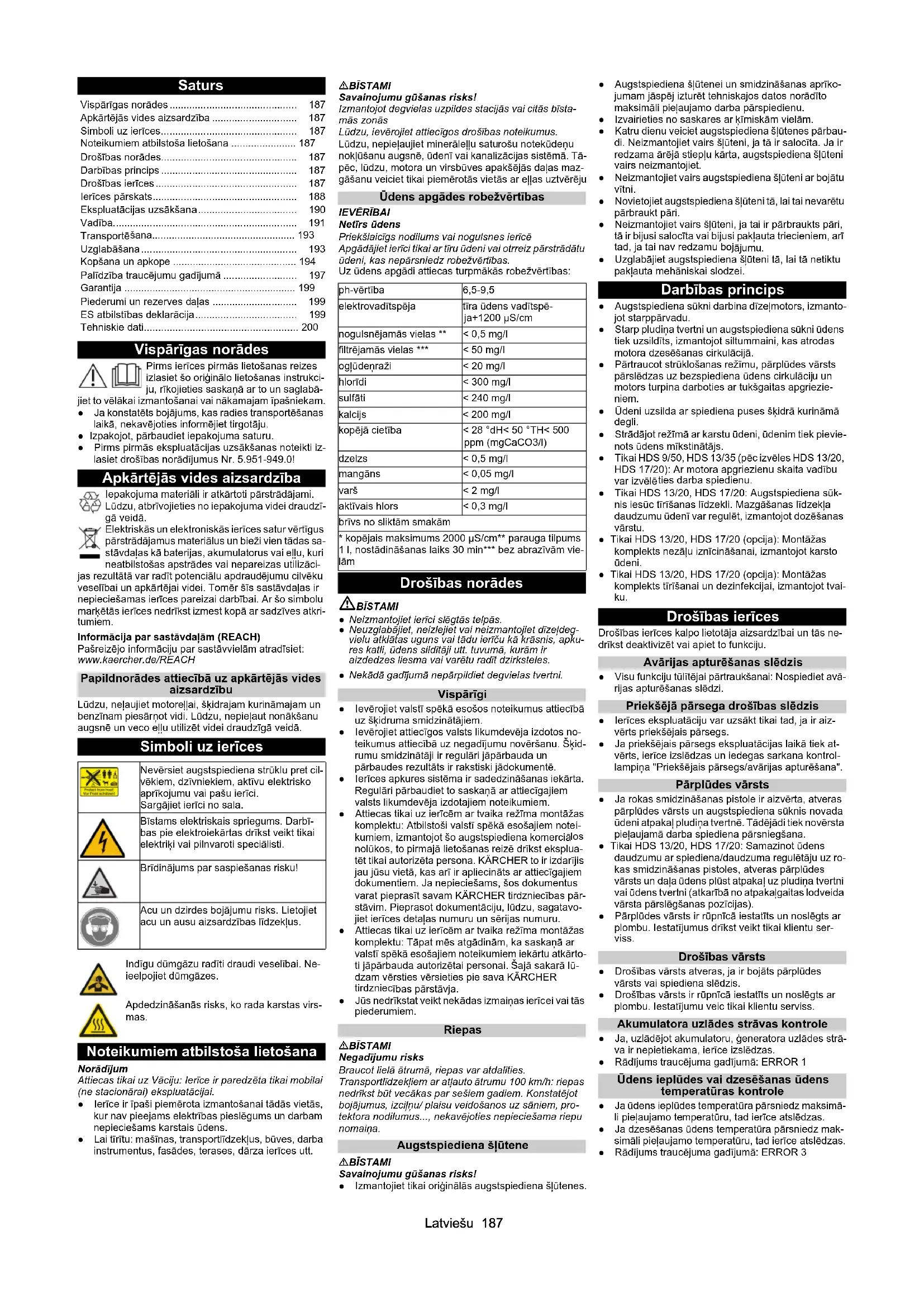 2,1 2,1 0,85 0,8Latviešu 187 Saturs Vispārīgas norādes Pirms ierīces pirmās lietošanas reizes izlasiet šo oriģinālo lietošanas instrukci- ju, rīkojieties saskaņā ar to un saglabā- jiet to vēlākai izmantošanai vai nākamajam īpašniekam. ● Ja konstatēts bojājums, kas radies transportēšanas laikā, nekavējoties informējiet tirgotāju. ● Izpakojot, pārbaudiet iepakojuma saturu. ● Pirms pirmās ekspluatācijas uzsākšanas noteikti iz- lasiet drošības norādījumus Nr. 5.951-949.0! Apkārtējās vides aizsardzība Iepakojuma materiāli ir atkārtoti pārstrādājami. Lūdzu, atbrīvojieties no iepakojuma videi draudzī- gā veidā. Elektriskās un elektroniskās ierīces satur vērtīgus pārstrādājamus materiālus un bieži vien tādas sa- stāvdaļas kā baterijas, akumulatorus vai eļļu, kuri neatbilstošas apstrādes vai nepareizas utilizāci- jas rezultātā var radīt potenciālu apdraudējumu cilvēku veselībai un apkārtējai videi. Tomēr šīs sastāvdaļas ir nepieciešamas ierīces pareizai darbībai. Ar šo simbolu marķētās ierīces nedrīkst izmest kop ā ar sadzīves atkri- tumiem. Informācija par sastāvdaļām (REACH) Pašreizējo informāciju par sastāvvielām atradīsiet: www.kaercher.de/REACH Papildnorādes attiecībā uz apkārtējās vides aizsardzību Lūdzu, neļaujiet motoreļļai, šķidrajam kurināmajam un benzīnam piesārņot vidi. Lūdzu, nepieļaut nonākšanu augsnē un veco eļļu utilizēt videi draudzīgā veidā. Simboli uz ierīces Noteikumiem atbilstoša lietošana Norādījum Attiecas tikai uz Vāciju: Ierīce ir paredzēta tikai mobilai (ne stacionārai) ekspluatācijai. ● Ierīce ir īpaši piemērota izmantošanai tādās vietās, kur nav pieejams elektrības pieslēgums un darbam nepieciešams karstais ūdens. ● Lai tīrītu: mašīnas, transportlīdzekļus, būves, darba instrumentus, fasādes, terases, dārza ierīces utt. BĪSTAMI Savainojumu gūšanas risks! Izmantojot degvielas uzpildes stacijās vai citās bīsta- mās zonās Lūdzu, ievērojiet attiecīgos drošības noteikumus. Lūdzu, nepieļaujiet minerāleļļu saturošu notekūdeņu nokļūšanu augsnē, ūdenī vai kanalizācijas sistēmā. Tā- pēc, lūdzu, motora un virsbūves apakšējās daļas maz- gāšanu veiciet tikai piemērotās vietās ar eļļas uztvērēju Ūdens apgādes robežvērtības