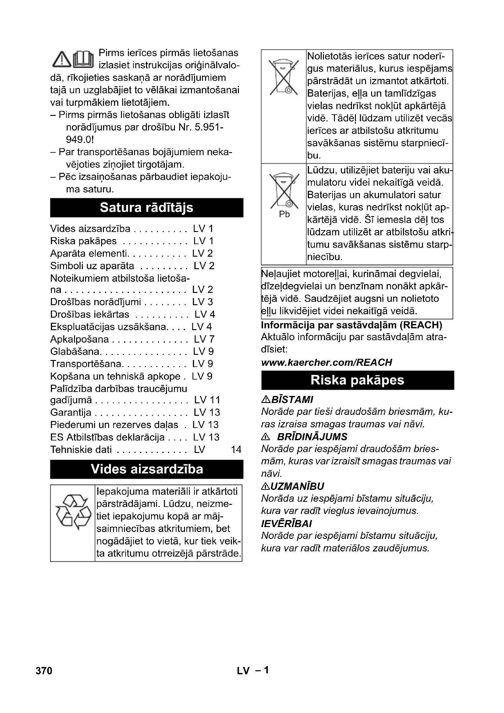 369ET– 1 Pirms ierīces pirmās lietošanas izlasiet instrukcijas oriģinālvalo- dā, rīkojieties saskaņā ar norādījumiem tajā un uzglabājiet to vēlākai izmantošanai vai turpmākiem lietotājiem. – Pirms pirmās lietošanas obligāti izlasīt norādījumus par drošību Nr. 5.951- 949.0! – Par transportēšanas bojājumiem neka- vējoties ziņojiet tirgotājam. – Pēc izsaiņošanas pārbaudiet iepakoju- ma saturu. Informācija par sastāvdaļām (REACH) Aktuālo informāciju par sastāvdaļām atra- dīsiet: www.kaercher.com/REACH BĪSTAMI Norāde par tieši draudošām briesmām, ku- ras izraisa smagas traumas vai nāvi.