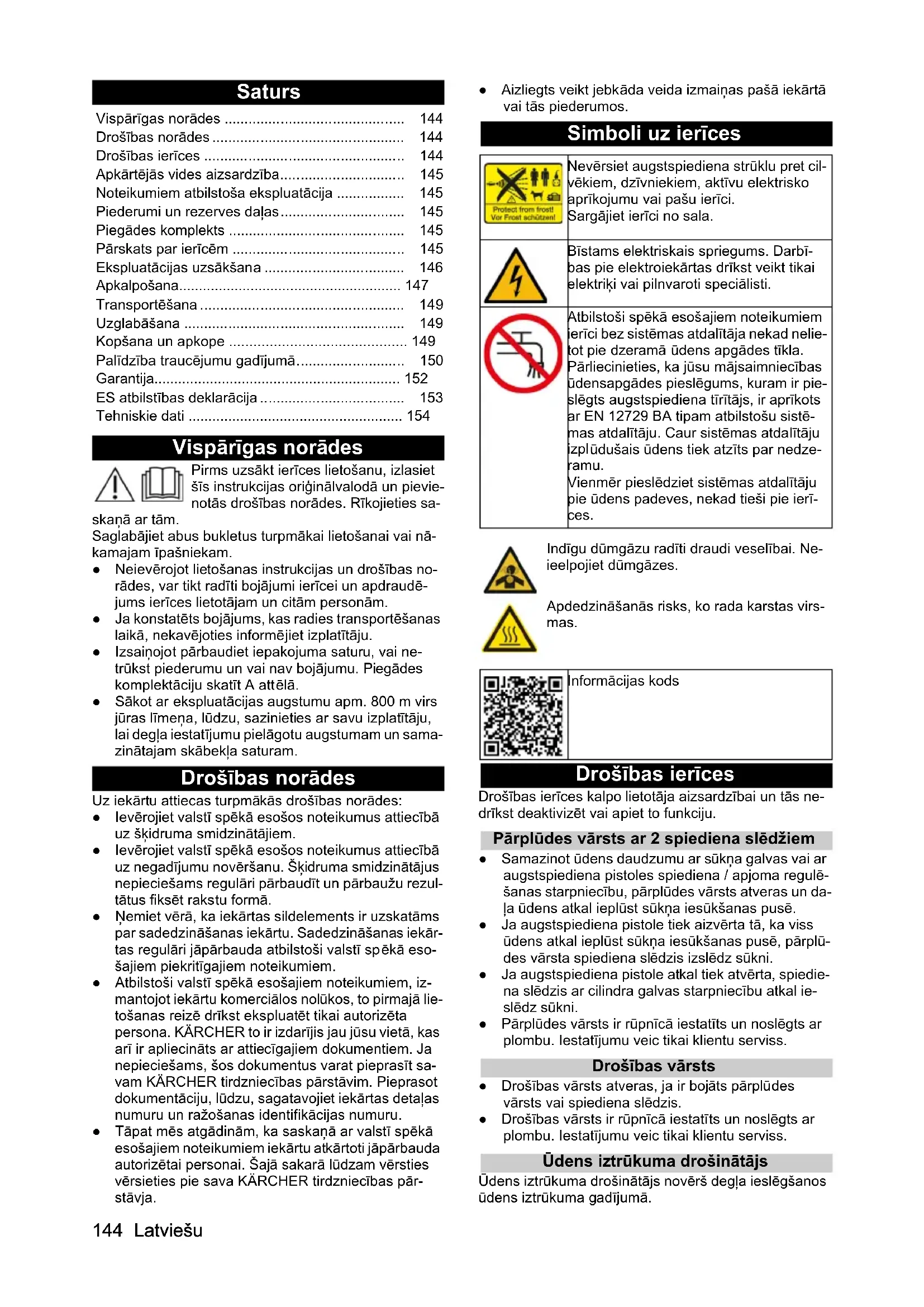 - Tehniskie dati Nevērsiet augstspiediena strūklu pret cil- vēkiem, dzīvniekiem, aktīvu elektrisko aprīkojumu vai pašu ierīci. Sargājiet ierīci no sala. Bīstams elektriskais spriegums. Darbī- bas pie elektroiekārtas drīkst veikt tikai elektriķi vai pilnvaroti speciālisti. Atbilstoši spēkā esošajiem noteikumiem ierīci bez sistēmas atdalītāja nekad nelie- tot pie dzeramā ūdens apgādes tīkla. Pārliecinieties, ka jūsu mājsaimniecības ūdensapgādes pieslēgums, kuram ir pie- slēgts augstspiediena tīrītājs, ir aprīkots ar EN 12729 BA tipam atbilstošu sistē- mas atdalītāju. Caur sistēmas atdalītāju izpl ūdušais ūdens tiek atzīts par nedze- ramu. Vienmēr pieslēdziet sistēmas atdalītāju pie ūdens padeves, nekad tieši pie ierī- ces. Indīgu dūmgāzu radīti draudi veselībai. Ne- ieelpojiet dūmgāzes. Apdedzināšanās risks, ko rada karstas virs- mas. Informācijas kodsLatviešu 145 Dūmgāzu temperatūras ierobežotājs Dūmgāzu temperatūras ierobežotājs izslēdz ierīci, ja ir sasniegta pārāk augsta dūmgāzu temperatūra. Apkārtējās vides aizsardzība Iepakojuma materiāli ir atkārtoti pārstrādājami. Lūdzu, atbrīvojieties no iepakojuma videi draudzī- gā veidā. Elektriskās un elektroniskās ierīces satur vērtīgus pārstrādājamus materiālus un bieži vien tādas sa- stāvdaļas kā baterijas, akumulatorus vai eļļu, kuri neatbilstošas apstrādes vai nepareizas utilizāci- jas rezultātā var radīt potenciālu apdraudējumu cilvēku veselībai un apkārtējai videi. Tomēr šīs sastāvdaļas ir nepieciešamas ierīces pareizai darbībai. Ar šo simbolu marķētās ierīces nedrīkst izmest kop ā ar sadzīves atkri- tumiem. Informācija par sastāvdaļām (REACH) Pašreizējo informāciju par sastāvvielām atradīsiet: www.kaercher.de/REACH Papildnorādes attiecībā uz apkārtējās vides aizsardzību Lūdzu, neļaujiet motoreļļai, šķidrajam kurināmajam un benzīnam piesārņot vidi. Lūdzu, nepieļaut nonākšanu augsnē un veco eļļu utilizēt videi draudzīgā veidā. Noteikumiem atbilstoša ekspluatācija Izmantot ierīci tikai, piem., mašīnu, transportlīdzekļu, būvju, darbarīku, fasāžu, terašu un dārza iekārtu tīrīša- nai. BĪSTAMI Izmantošana degvielas uzpildes stacijās vai citās bīstamās vietās Savainošanās risks Ievērojiet attiecīgos drošības noteikumus. Norādījum Neļaut notekūdeņiem, kas satur minerāleļļu, nokļūt aug- snē, ūdeņos vai kanalizācijas sistēmā. Tāpēc motora mazgāšanu vai apakšu mazgāšanu veiciet tikai piemē- rotās vietās ar eļļas uztvērēju. Ūdens apgādes robežvērtības p. 154