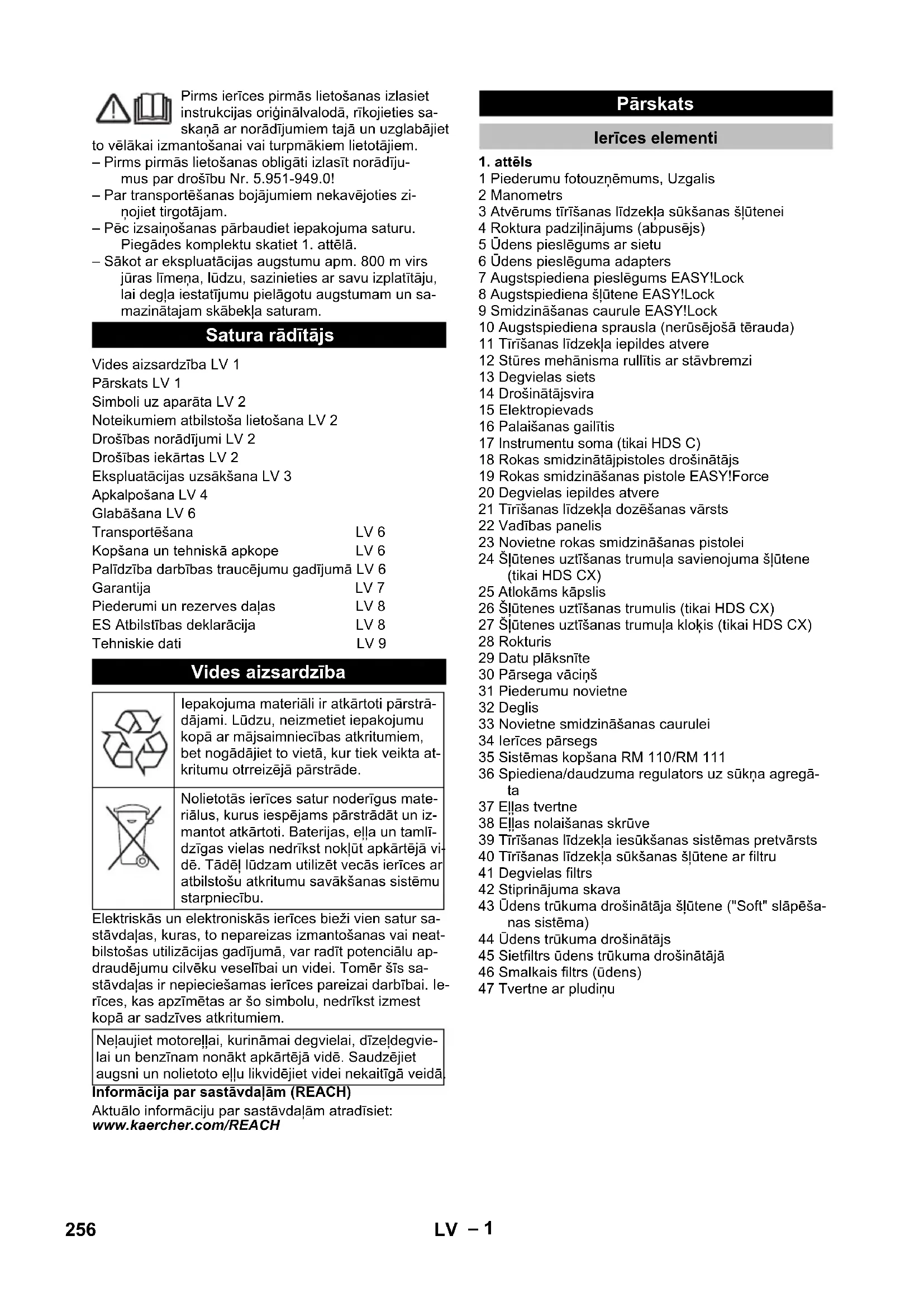 Tüüpiline töökaal, C kg 118,1 118,1 121,1 Tüüpiline töökaal, CX kg 121 121 124 Kütusepaak l 15,5 15,5 15,5 Puhastusvahendi paak l 15,5 15,5 15,5 255ET– 1 Pirms ierīces pirmās lietošanas izlasiet instrukcijas oriģinālvalodā, rīkojieties sa- skaņā ar norādījumiem tajā un uzglabājiet to vēlākai izmantošanai vai turpmākiem lietotājiem. – Pirms pirmās lietošanas obligāti izlasīt norādīju- mus par drošību Nr. 5.951-949.0! – Par transportēšanas bojājumiem nekavējoties zi- ņojiet tirgotājam. – Pēc izsaiņošanas pārbaudiet iepakojuma saturu. Piegādes komplektu skatiet 1. attēlā. – Sākot ar ekspluatācijas augstumu apm. 800 m virs jūras līmeņa, lūdzu, sazinieties ar savu izplatītāju, lai degļa iestatījumu pielāgotu augstumam un sa- mazinātajam skābekļa saturam. Elektriskās un elektroniskās ierīces bieži vien satur sa- stāvdaļas, kuras, to nepareizas izmantošanas vai neat- bilstošas utilizācijas gadījumā, var radīt potenciālu ap- draudējumu cilvēku veselībai un videi. Tomēr šīs sa- stāvdaļas ir nepieciešamas ierīces pareizai darbībai. Ie- rīces, kas apzīmētas ar šo simbolu, nedrīkst izmest kopā ar sadzīves atkritumiem. Informācija par sastāvdaļām (REACH) Aktuālo informāciju par sastāvdaļām atradīsiet: www.kaercher.com/REACH